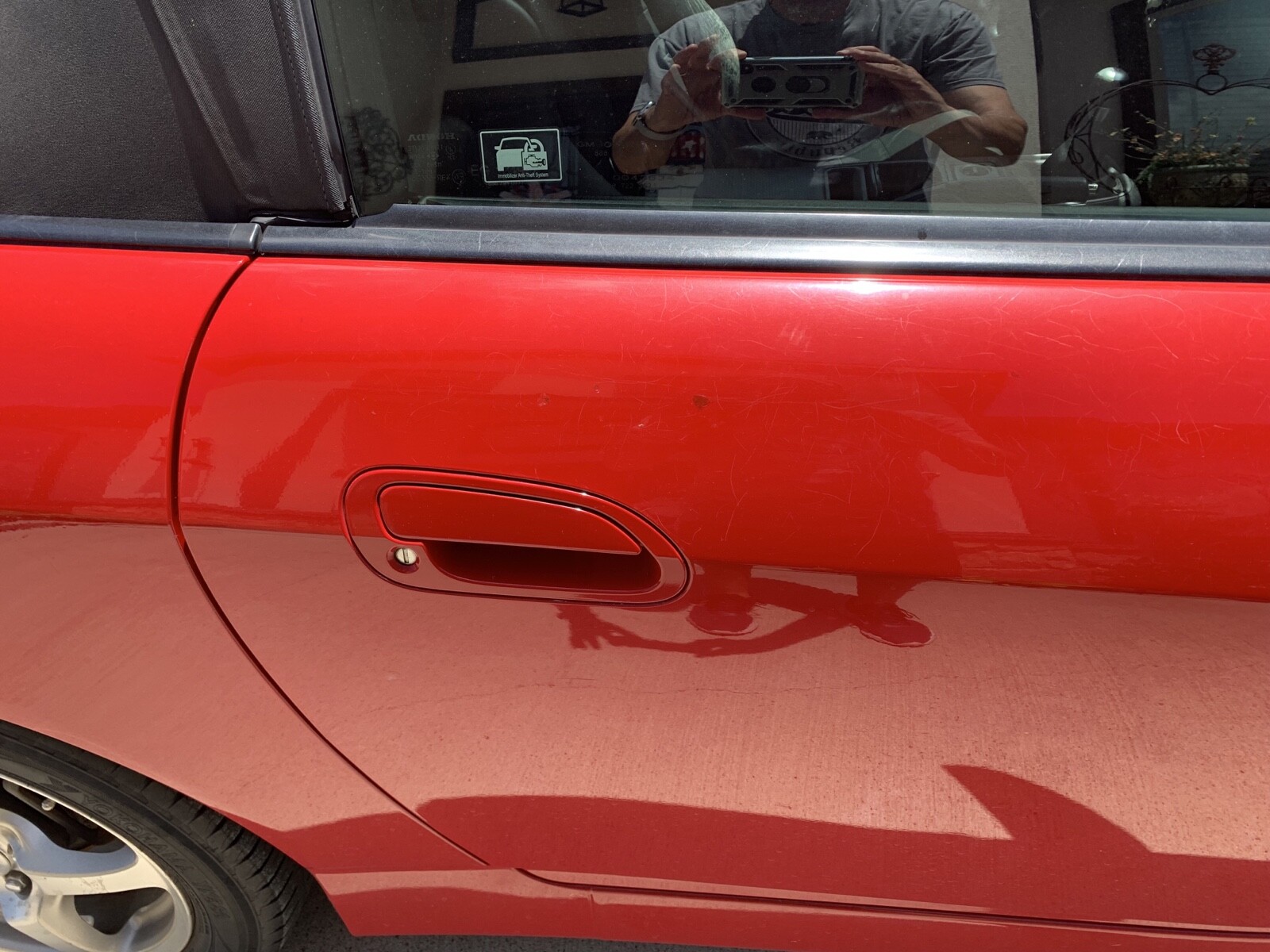 The engine runs great and is still peppy. There are a few chips and dents to the exterior and rock chips to the windshield that were repaired. The soft top has a small rip that has been patched (never leaked) and it still operates smoothly. The A/C was just replaced in June.