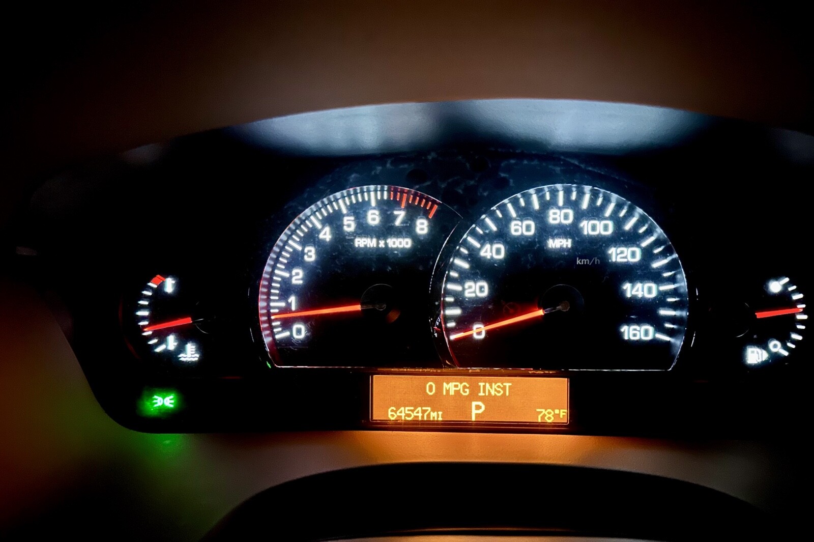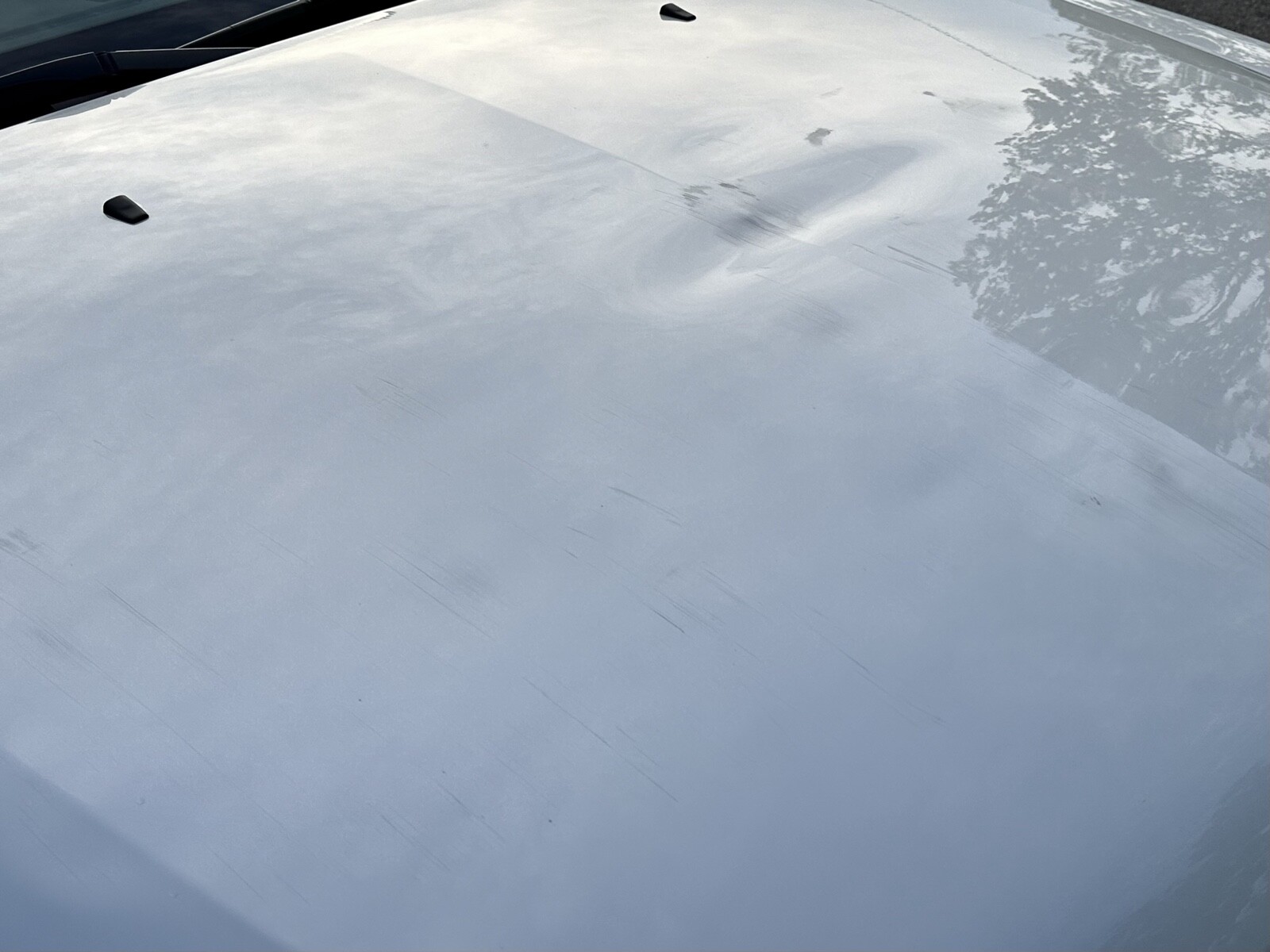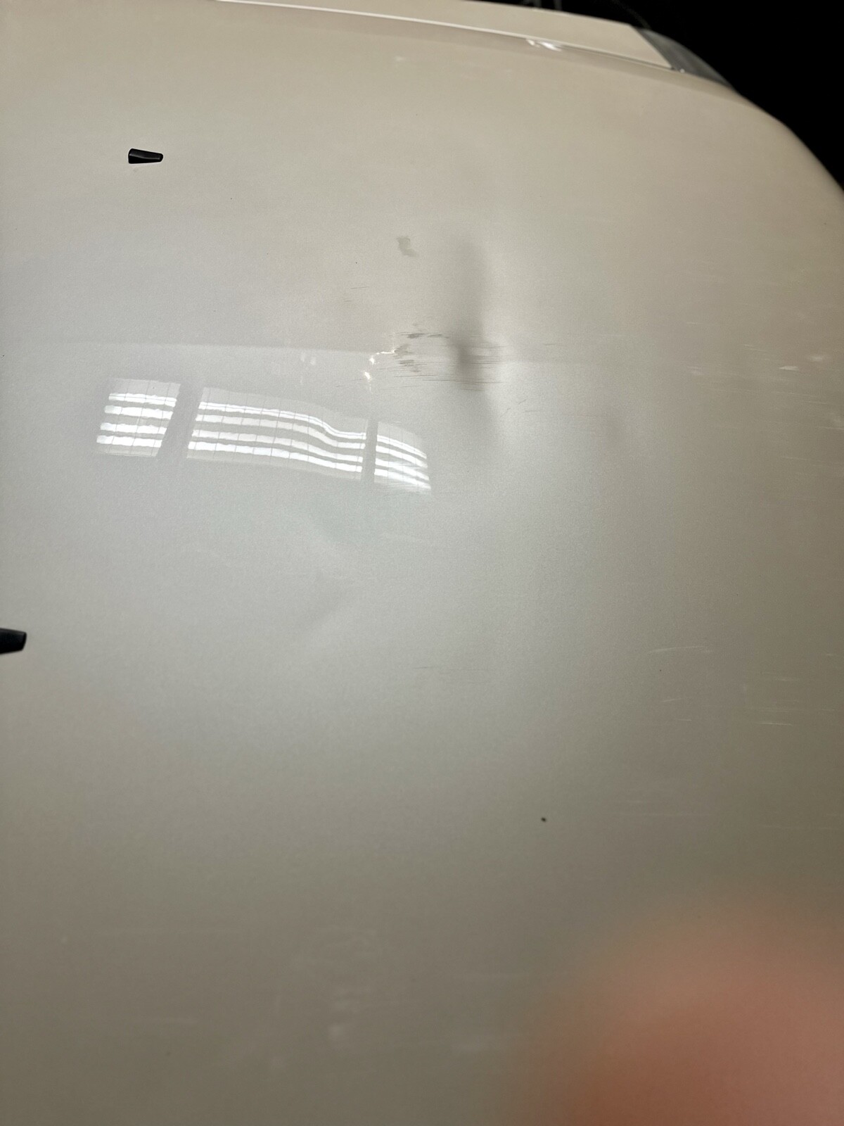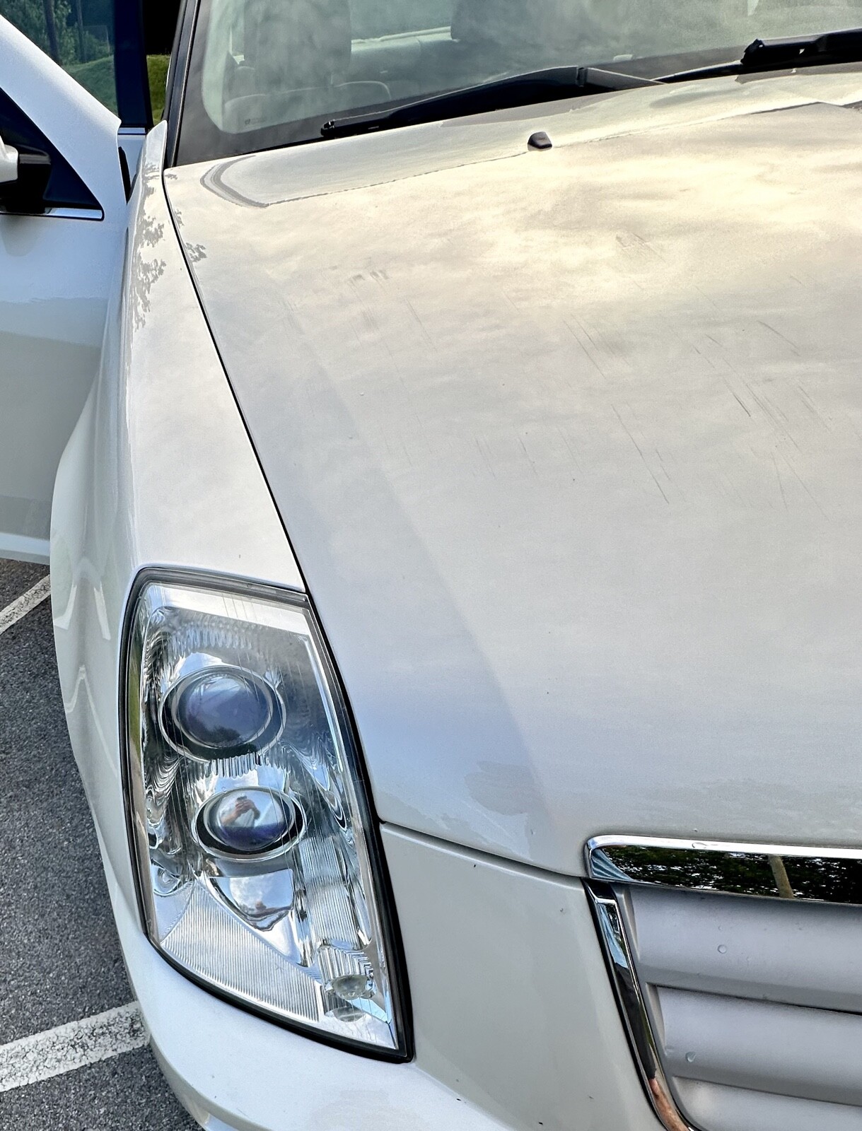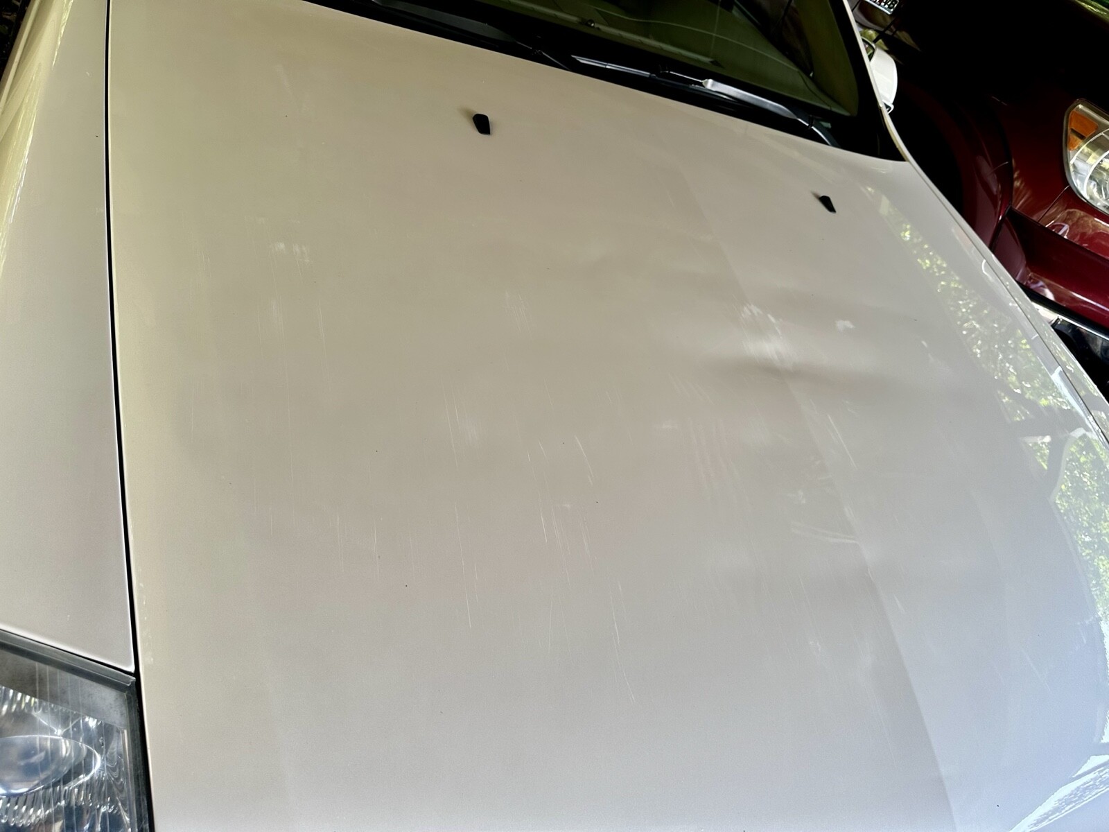 The paint is practically perfect. The only visible imperfection is on the hood (pictured). There are some scratches and ripples where the previous elderly owner drove under a shelf in the garage and decided to stop driving. It hasn’t bothered me at all during the years I have owned it, and it’s nothing a good used hood wouldn’t take care of. There is a minor crack in the passenger side of the front bumper as well. The weather stripping around the drivers door is slightly worn. The car has spent its life either garaged or sheltered. The headlights are bright and clear.