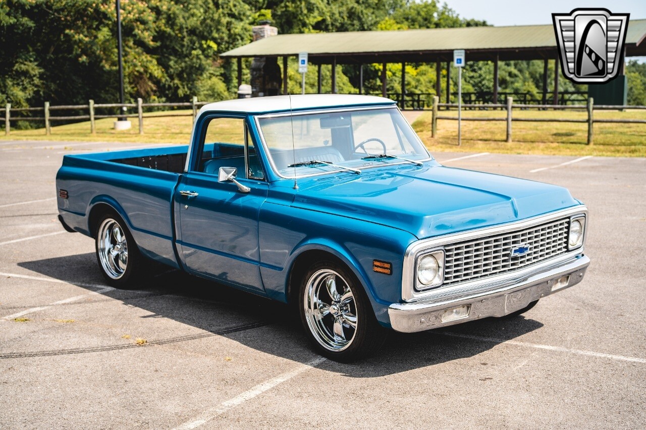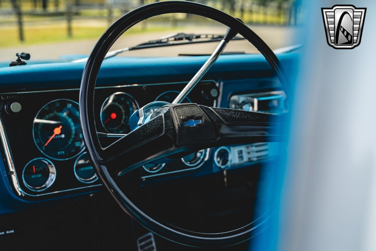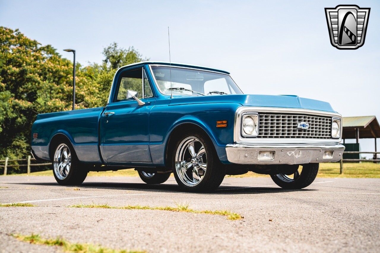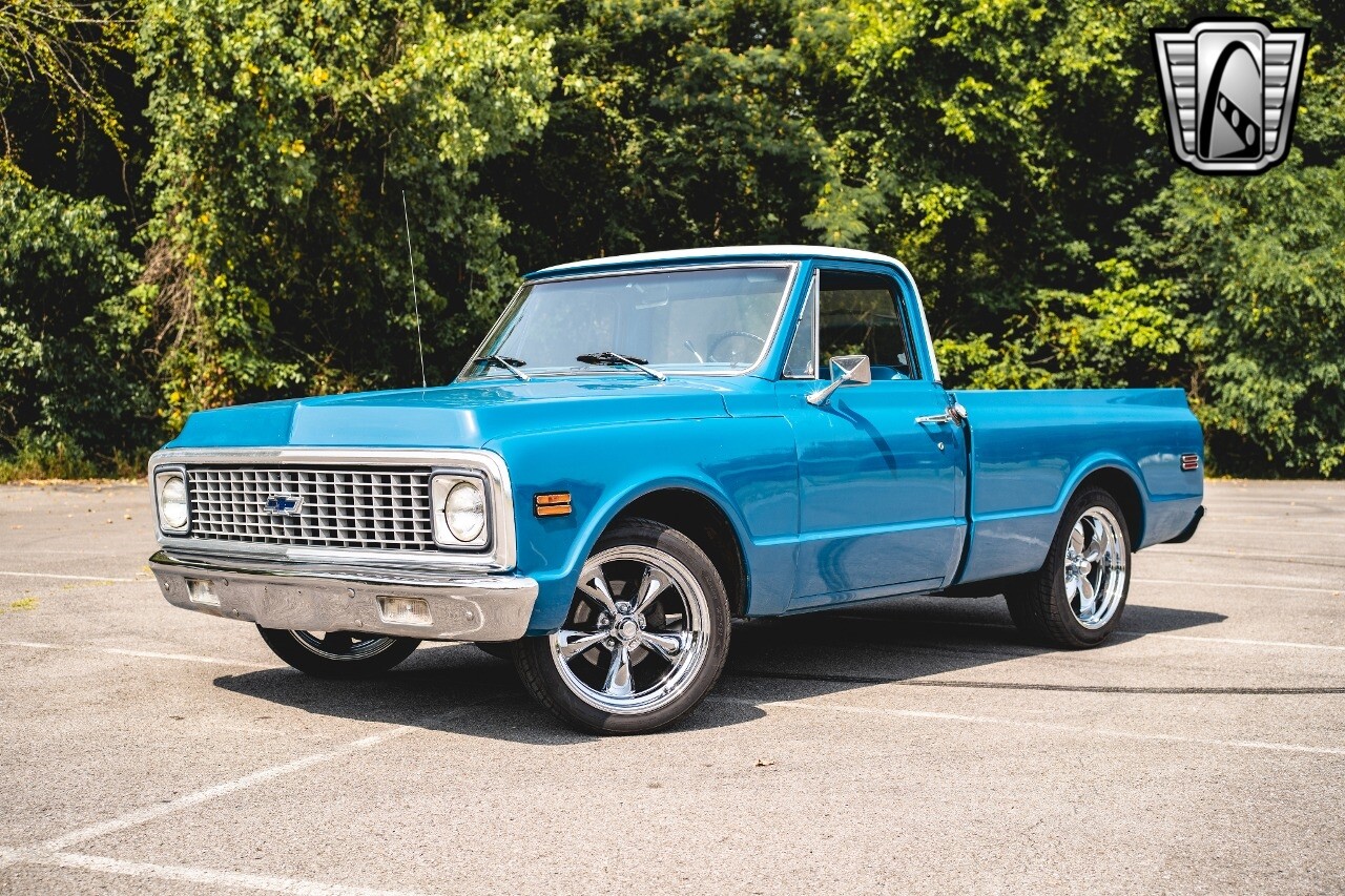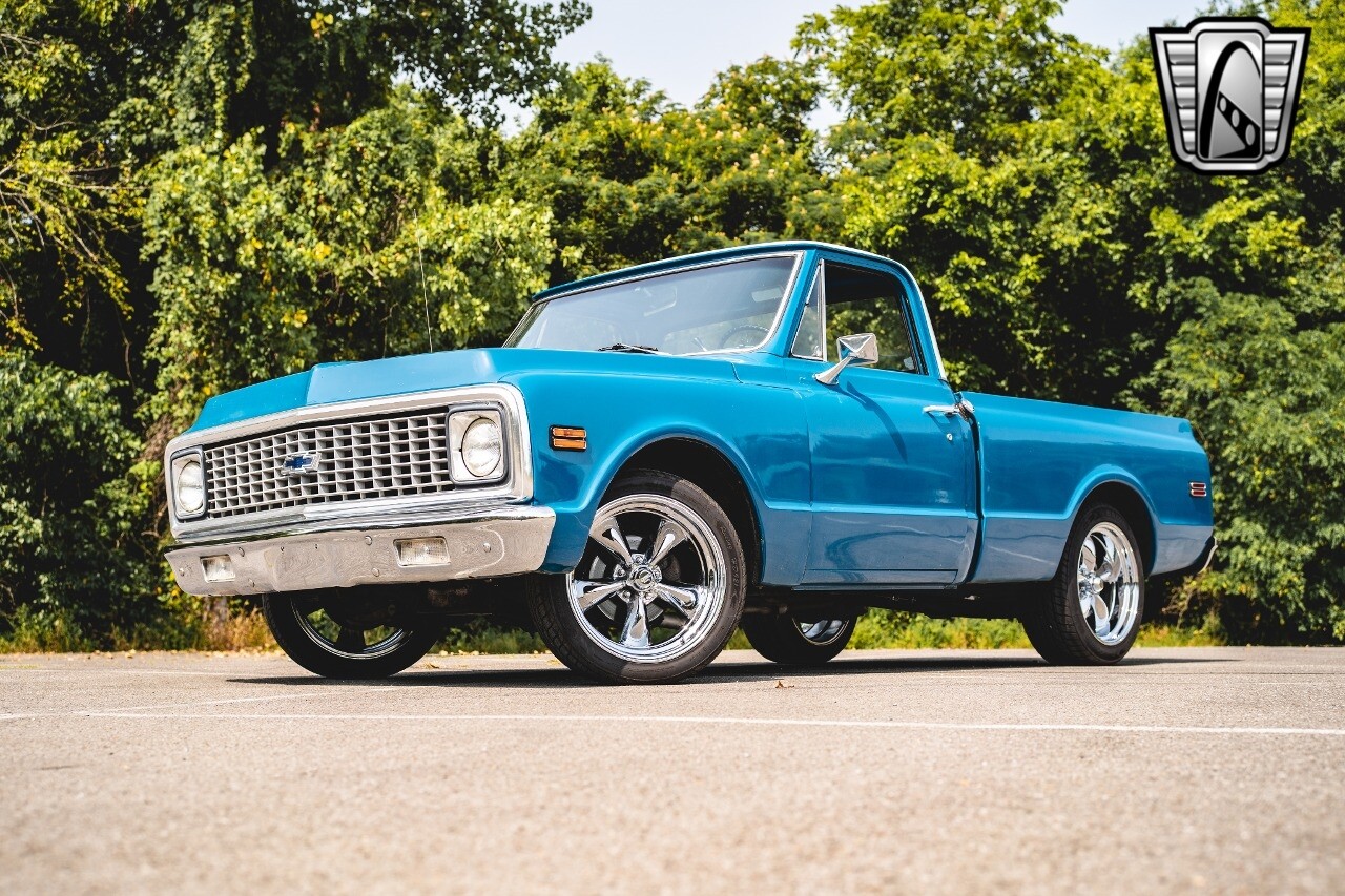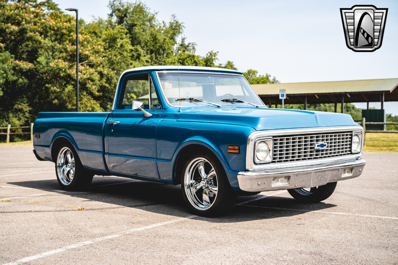Introducing a classic icon of American automotive history: the 1972 Chevrolet C10. With its striking blue exterior, this vintage pickup truck exudes timeless appeal and is sure to turn heads wherever it goes. Complementing the exterior, the blue interior offers a cohesive and stylish look that stands out.
