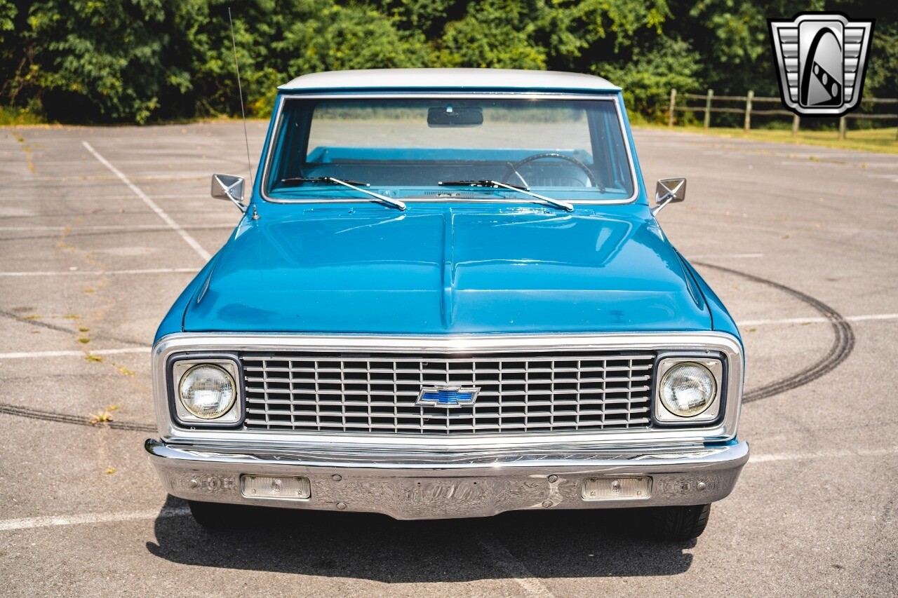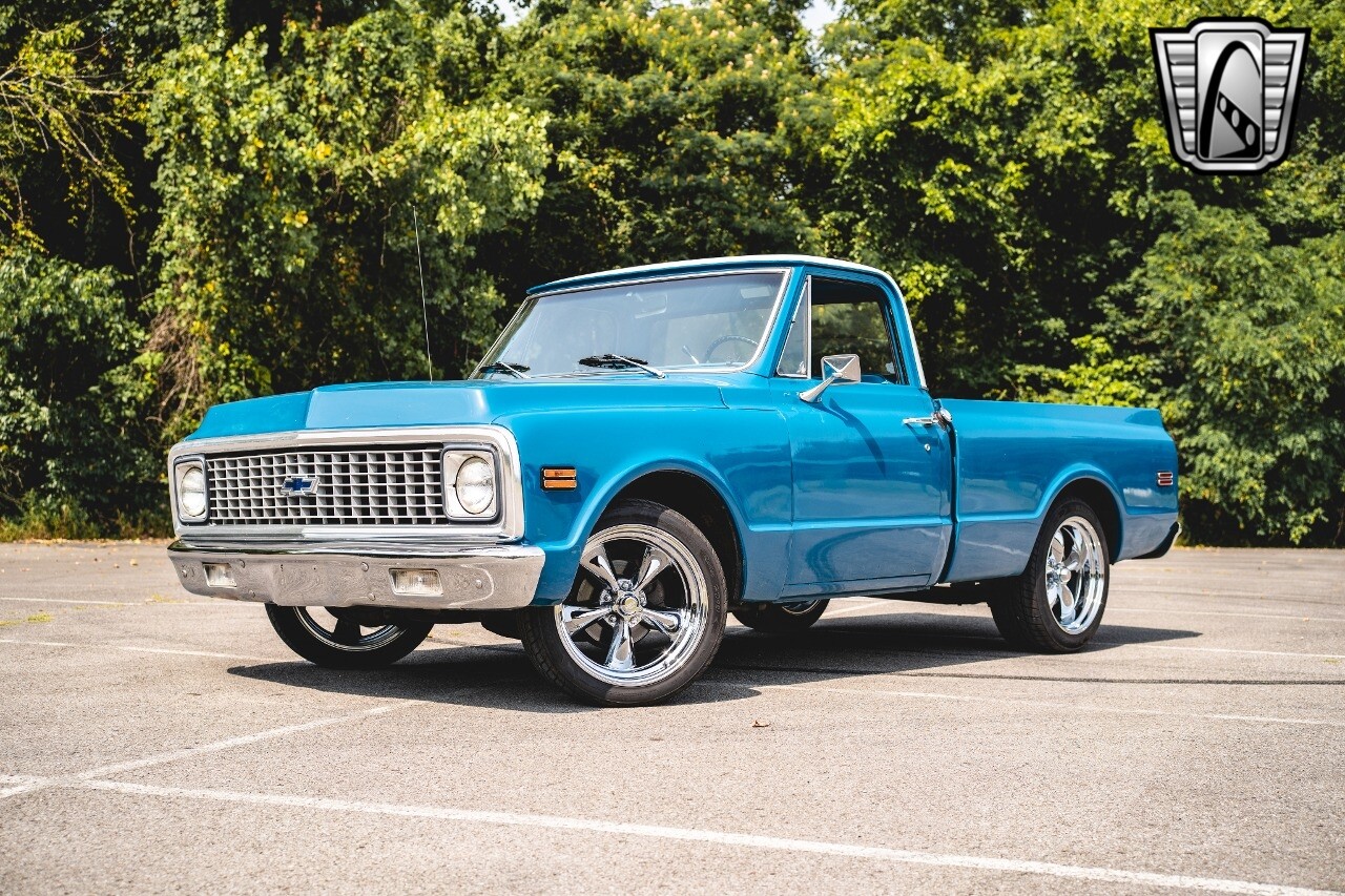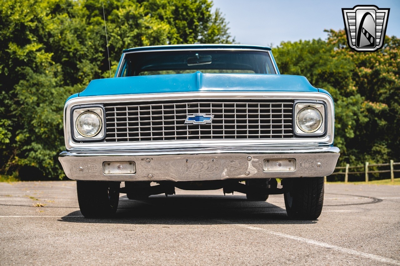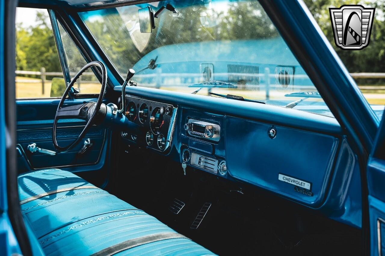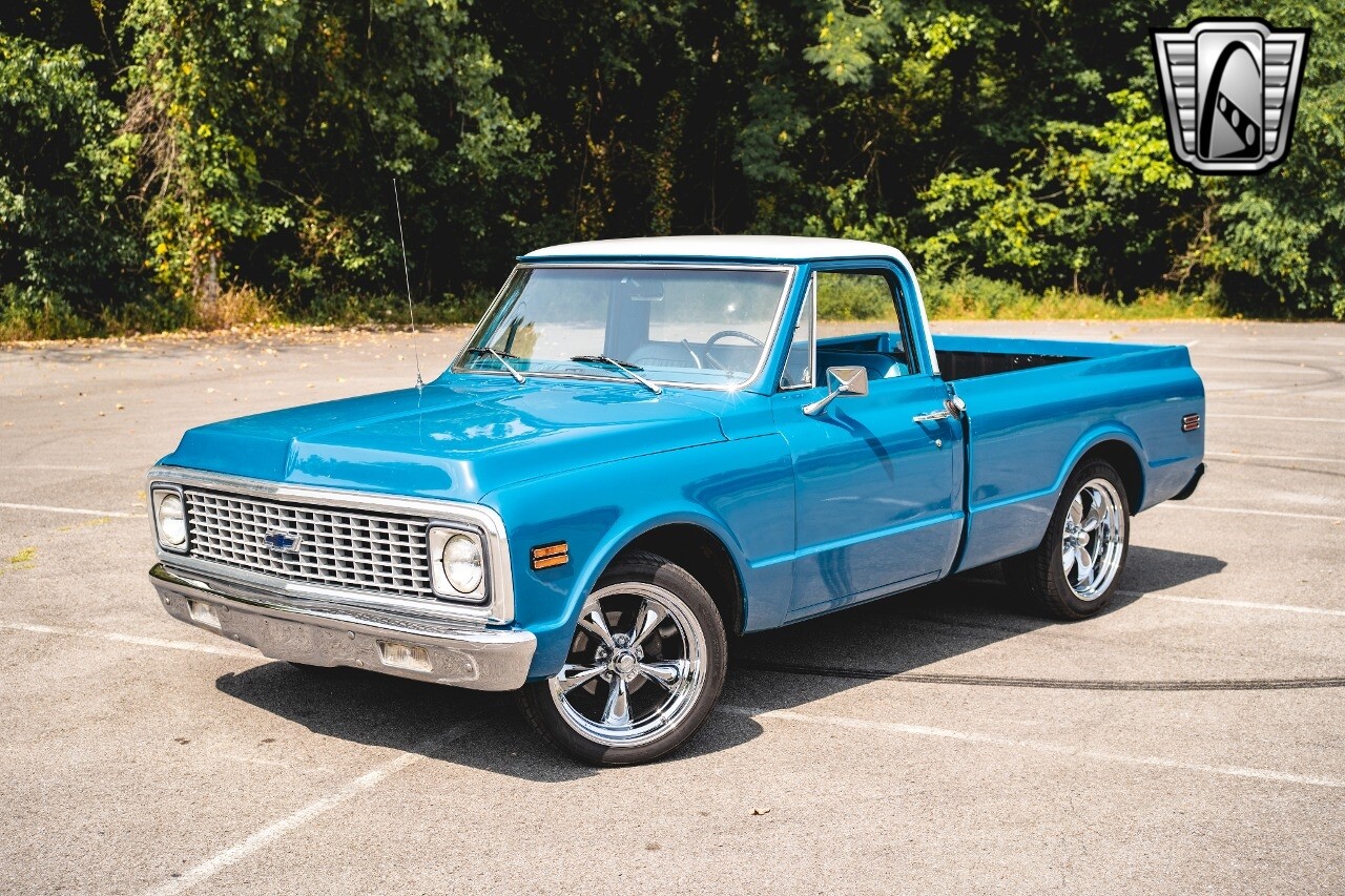 Introducing a classic icon of American automotive history: the 1972 Chevrolet C10. With its striking blue exterior, this vintage pickup truck exudes timeless appeal and is sure to turn heads wherever it goes. Complementing the exterior, the blue interior offers a cohesive and stylish look that stands out.