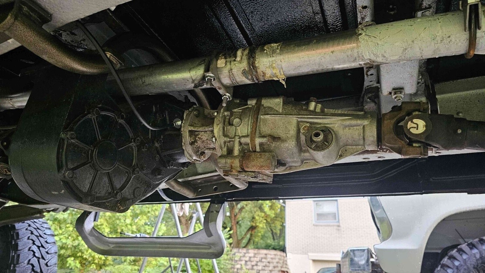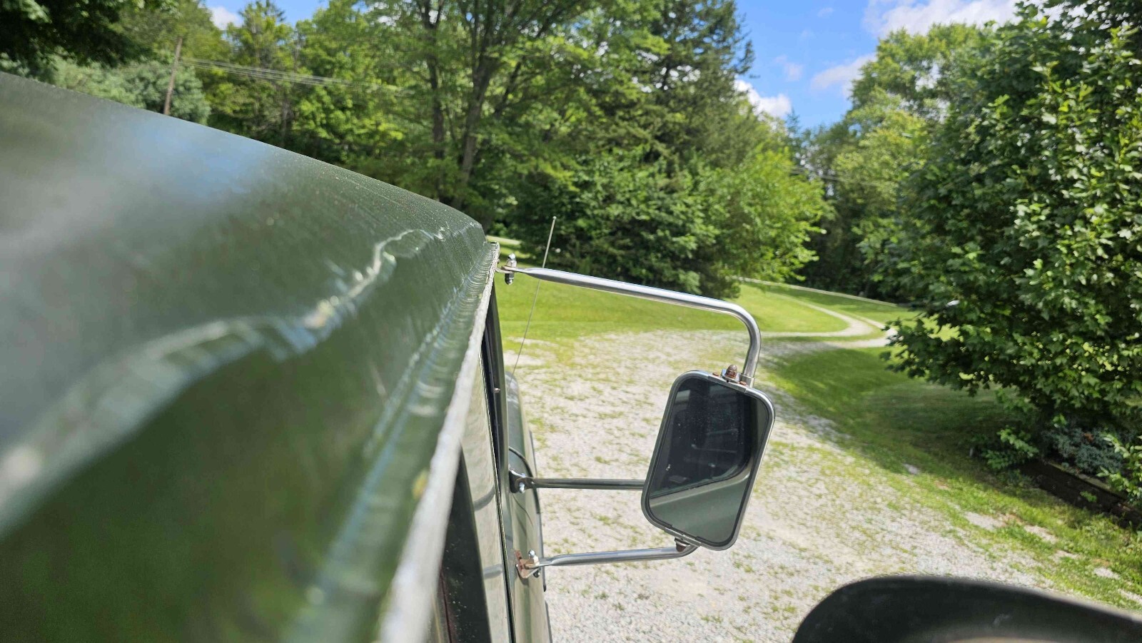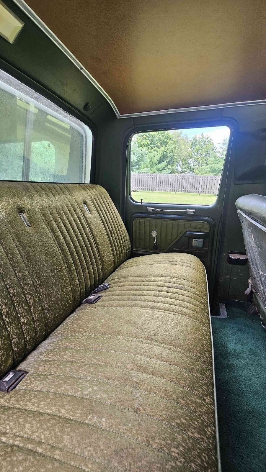 Inside, you'll find the front and rear seat are in exceptional condition. The rear seat has a few noticeable tears, but they're far from extreme. There's new carpet and a new headliner. The dash looks amazing with the dash cap. The floor shifter makes it apparent that it has 4x4 capability. The transmission is shifted on the column. No radio. The heat & air conditioning components are all there inside, but I never did install a replacement compressor or drier. The blower works at all speed levels. All door panels, window crank handles,and door handles are there. Windows crank up and down properly. All gauges were working until I removed the dash panel to replace the speedometer cable. Something obviously came loose.