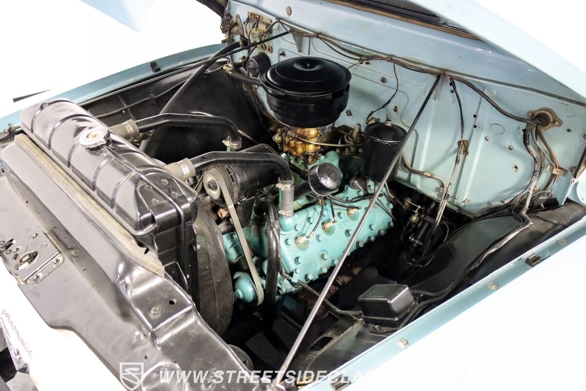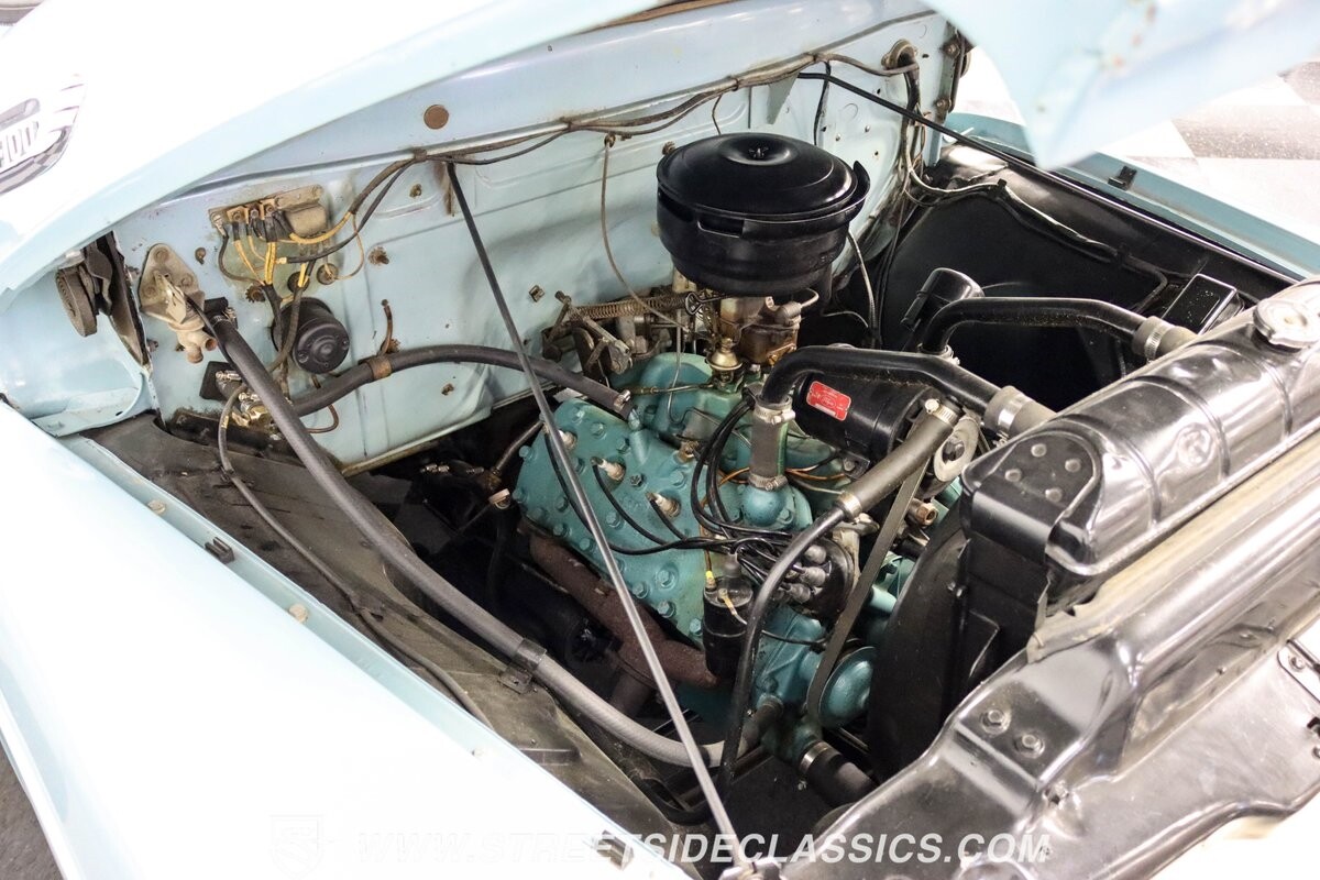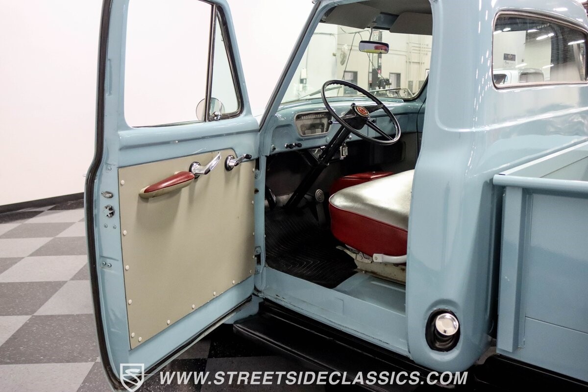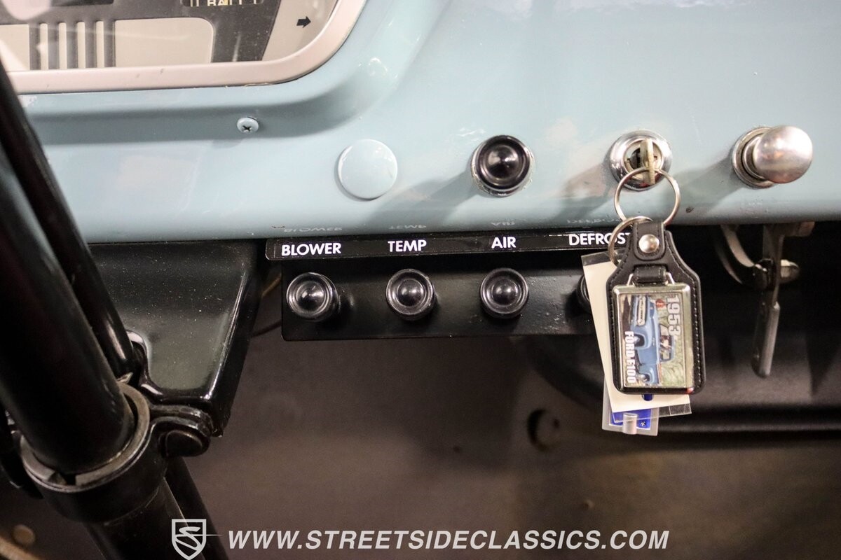 The gray vinyl bench seat with red accents invites you to get behind the wheel and experience the charm of a bygone era. The painted blue dash and door panels, along with the rubber floor mat, keep things simple yet stylish inside. And here's a fun fact: you're looking at a rare find with that column-shifted Ford-O-Matic 3-speed automatic transmission – 1953 was the first year it was available in the F-Series.