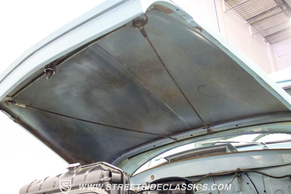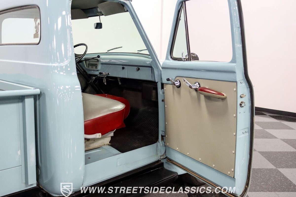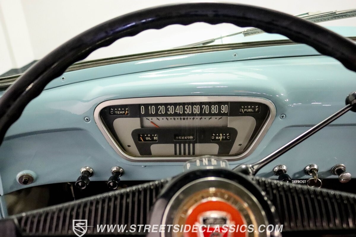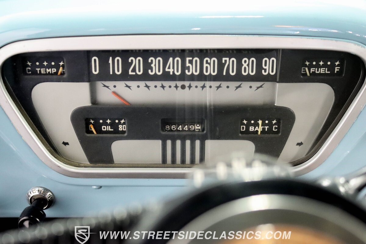 The gray vinyl bench seat with red accents invites you to get behind the wheel and experience the charm of a bygone era. The painted blue dash and door panels, along with the rubber floor mat, keep things simple yet stylish inside. And here's a fun fact: you're looking at a rare find with that column-shifted Ford-O-Matic 3-speed automatic transmission – 1953 was the first year it was available in the F-Series.