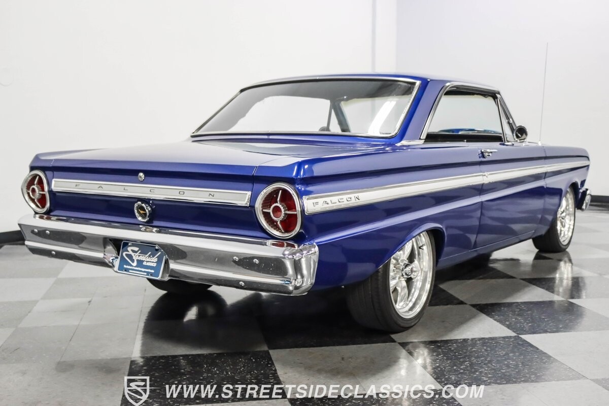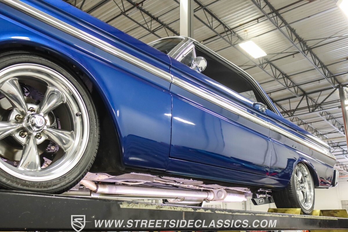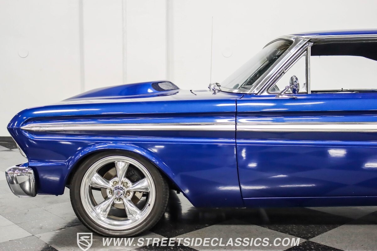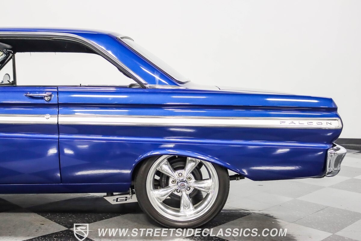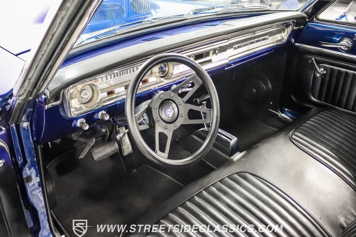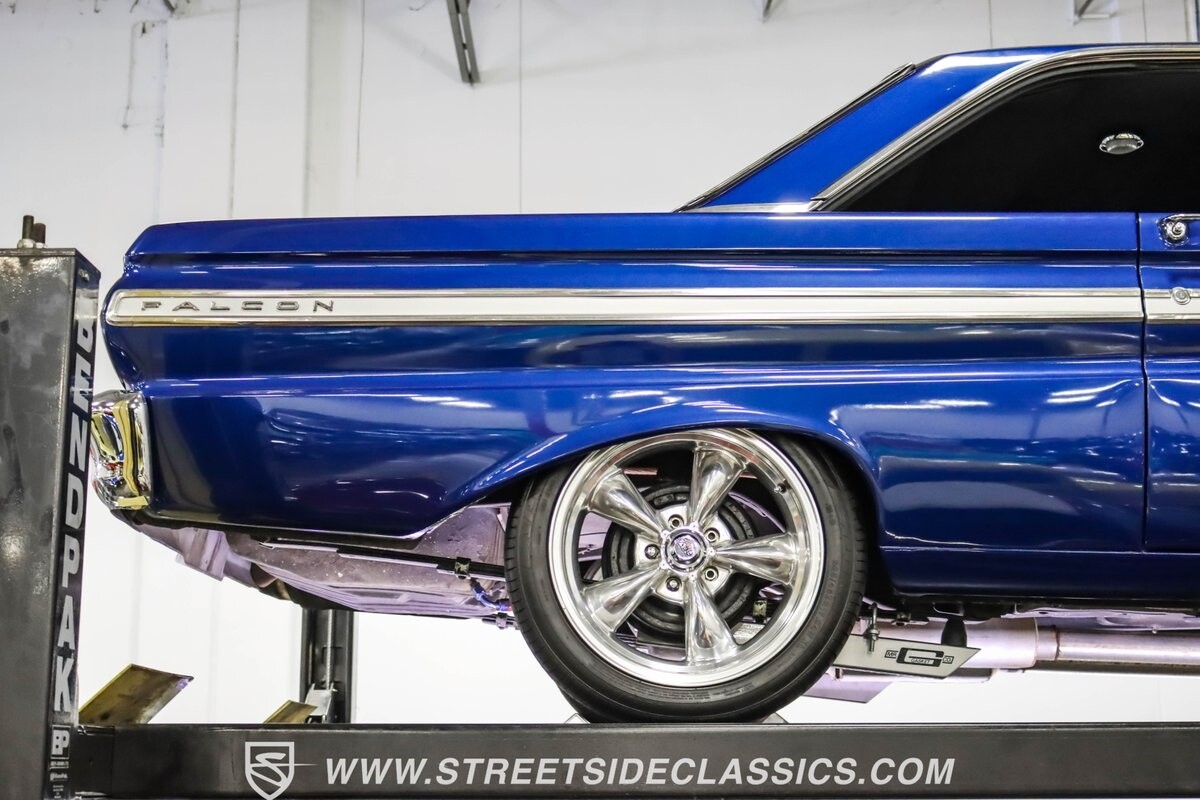 This 1965 Ford Falcon Futura Hardtop sports a striking Dark Blue Metallic paint job, a bold departure from its original Twilight Turquoise. The sleek body lines are complemented by gleaming chrome trim, creating a look that's both classic and aggressive. A custom fiberglass Thunderbolt-style hood gives the car a muscular profile. The Falcon sits low on 17" Rev wheels, wrapped in meaty 215/45ZR17 front and 225/45ZR17 rear tires. This exterior makeover showcases a perfect blend of vintage style and modern performance aesthetics.