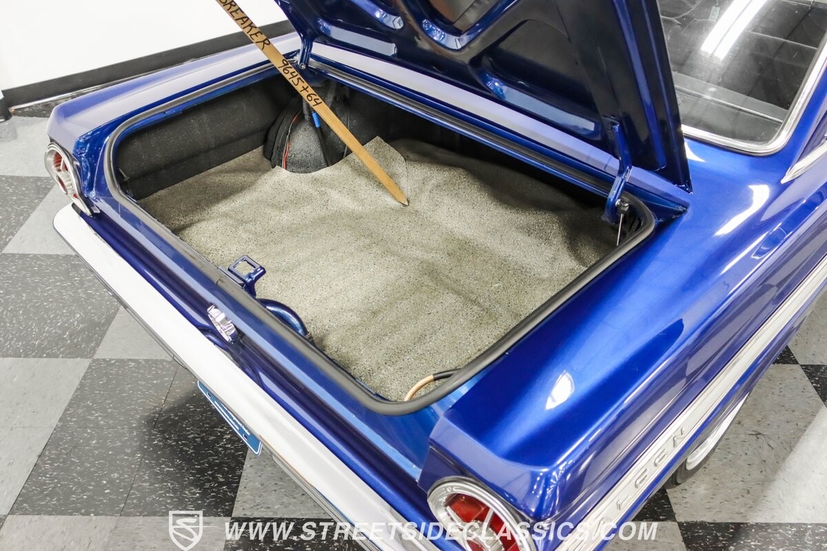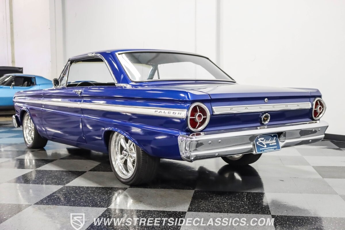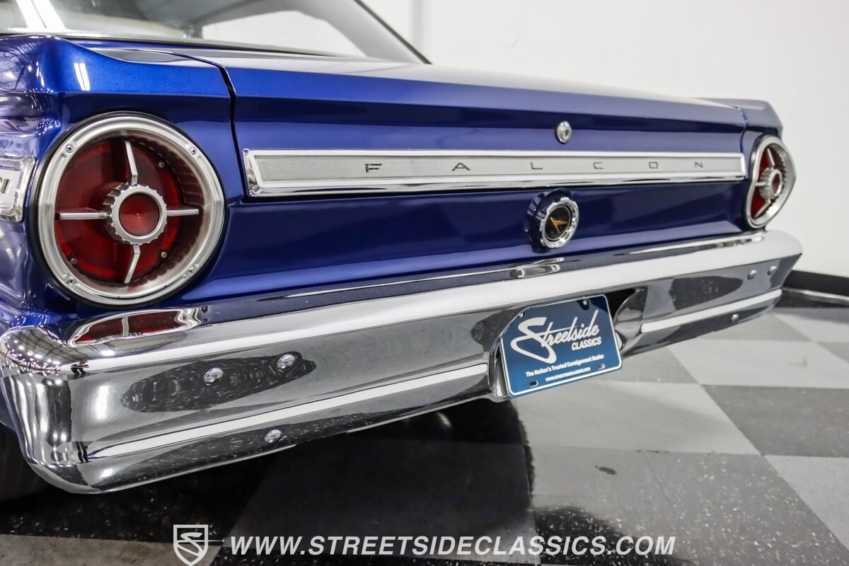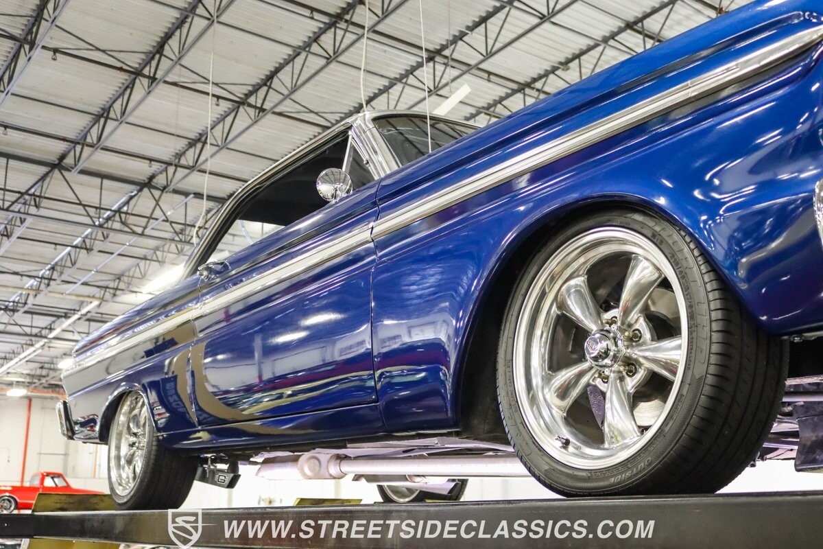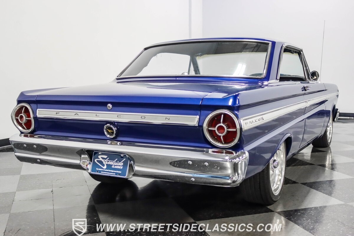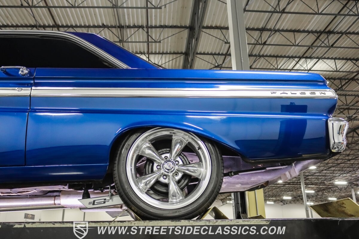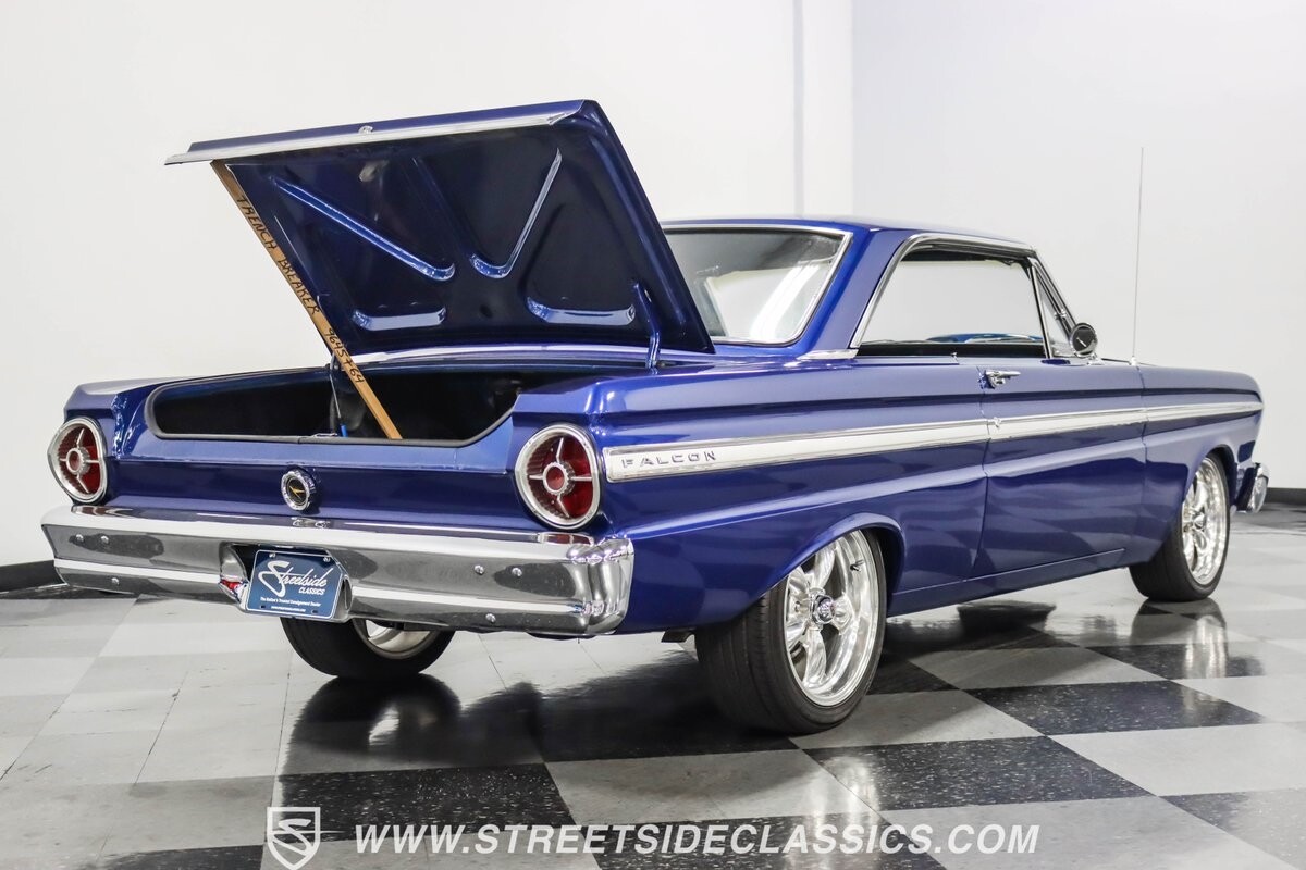 This 1965 Ford Falcon Futura Hardtop sports a striking Dark Blue Metallic paint job, a bold departure from its original Twilight Turquoise. The sleek body lines are complemented by gleaming chrome trim, creating a look that's both classic and aggressive. A custom fiberglass Thunderbolt-style hood gives the car a muscular profile. The Falcon sits low on 17" Rev wheels, wrapped in meaty 215/45ZR17 front and 225/45ZR17 rear tires. This exterior makeover showcases a perfect blend of vintage style and modern performance aesthetics.