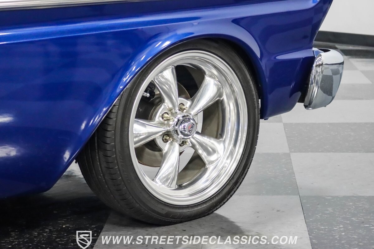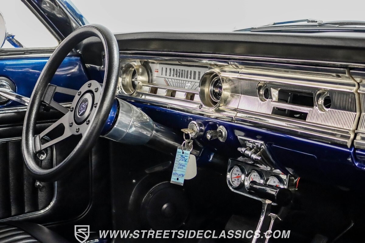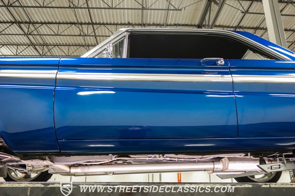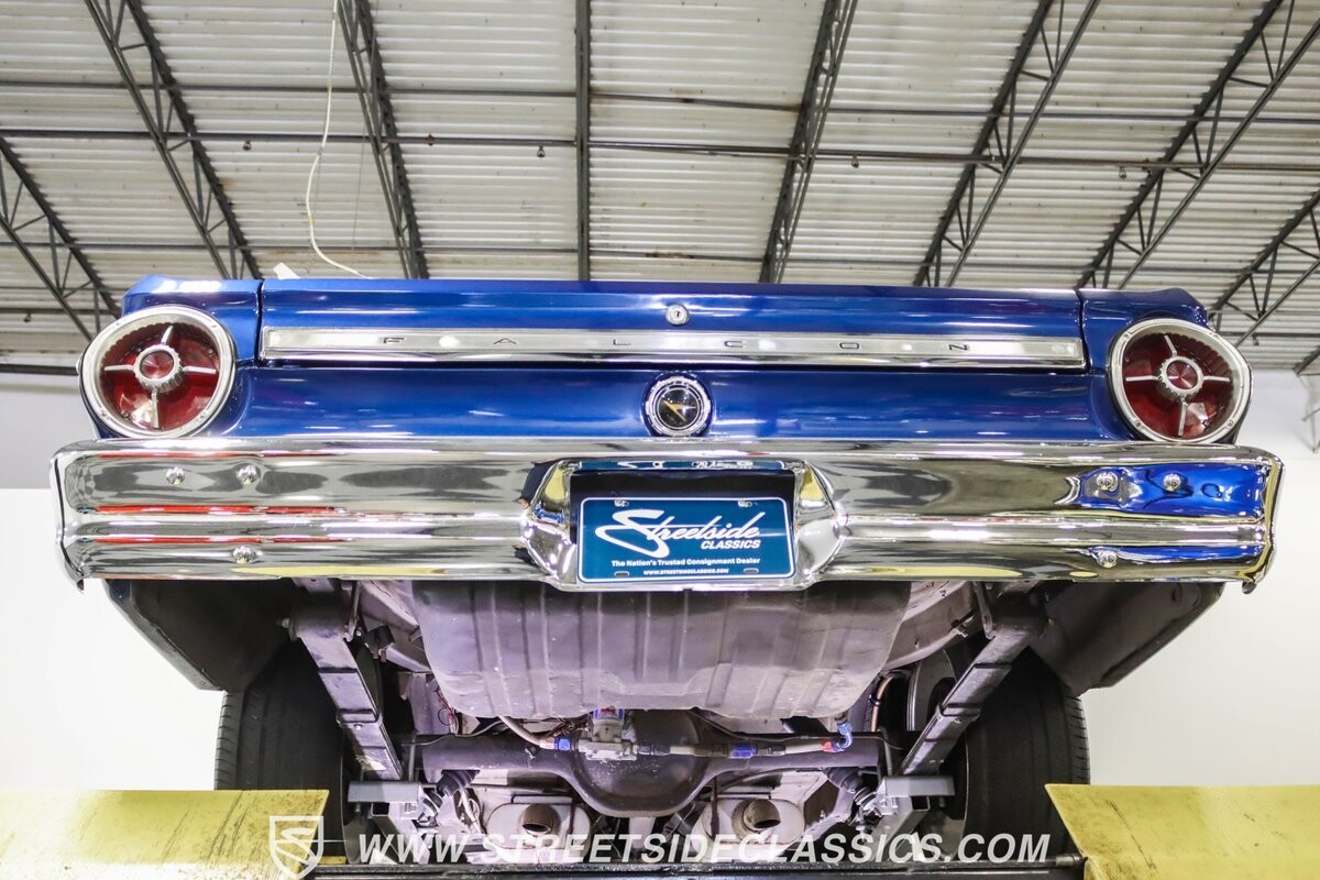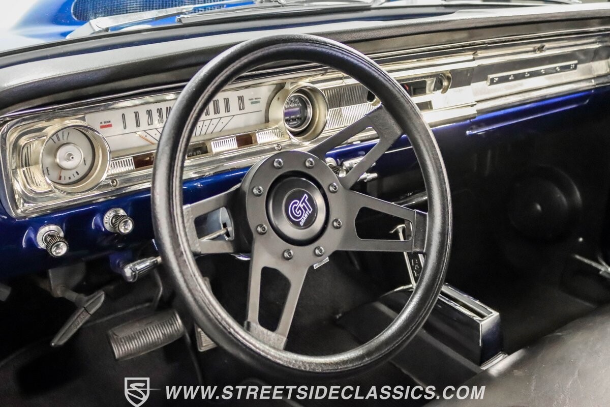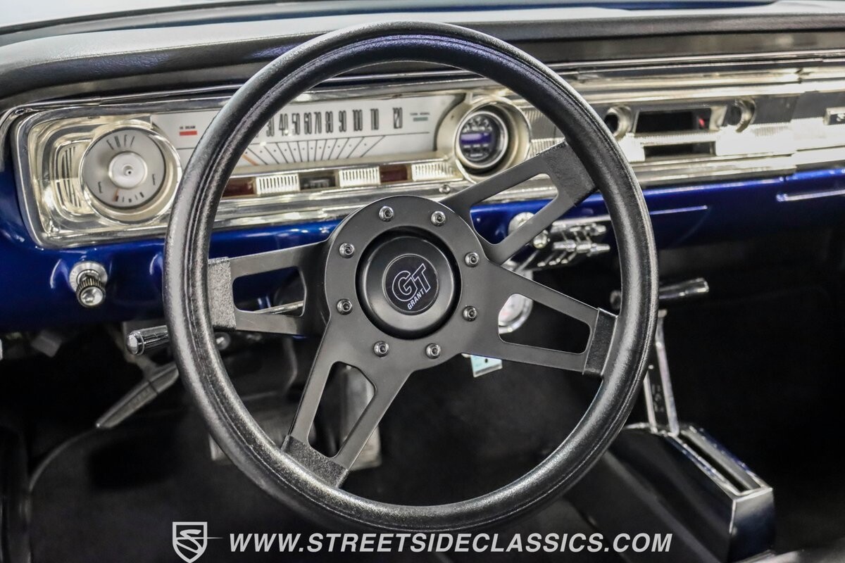 This 1965 Ford Falcon Futura Hardtop sports a striking Dark Blue Metallic paint job, a bold departure from its original Twilight Turquoise. The sleek body lines are complemented by gleaming chrome trim, creating a look that's both classic and aggressive. A custom fiberglass Thunderbolt-style hood gives the car a muscular profile. The Falcon sits low on 17" Rev wheels, wrapped in meaty 215/45ZR17 front and 225/45ZR17 rear tires. This exterior makeover showcases a perfect blend of vintage style and modern performance aesthetics.