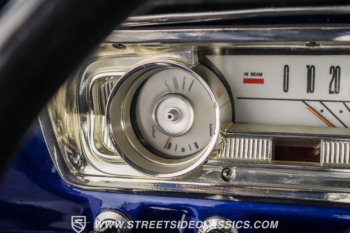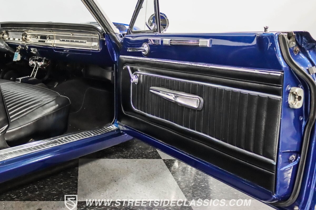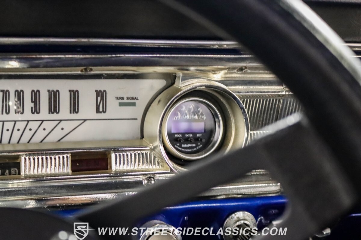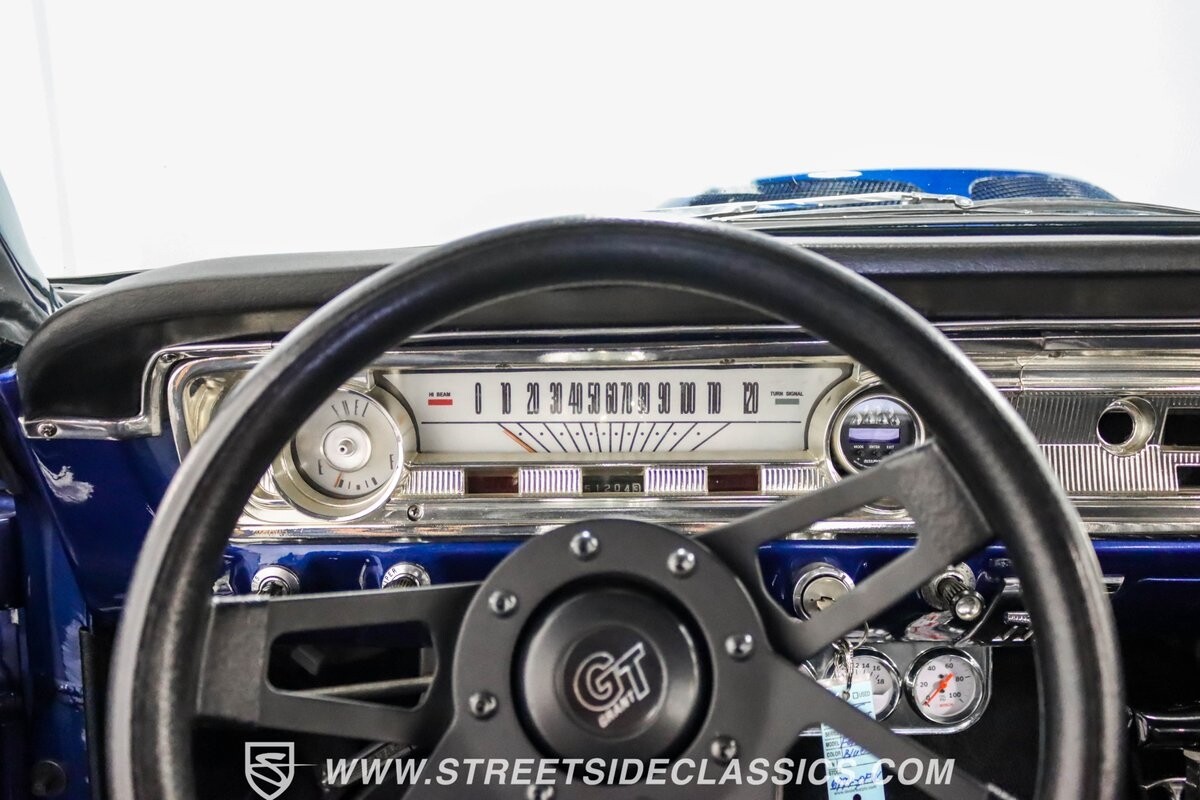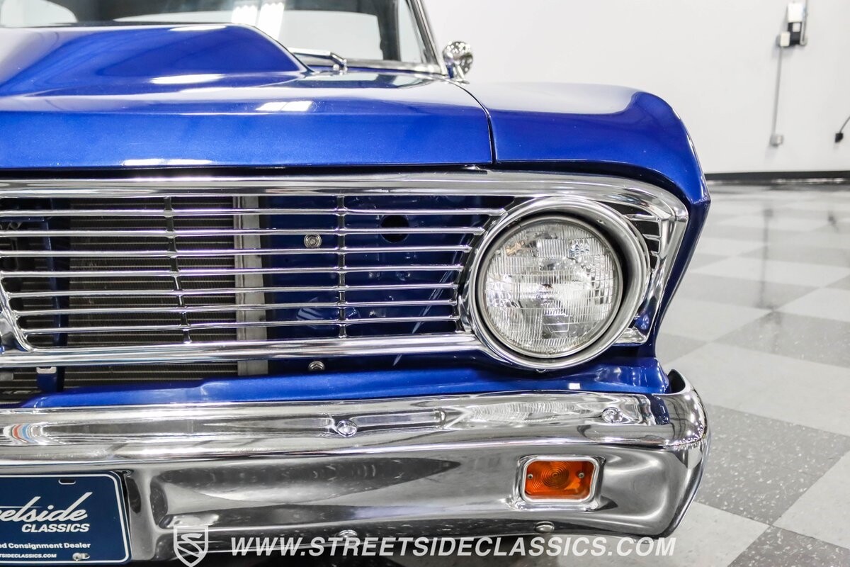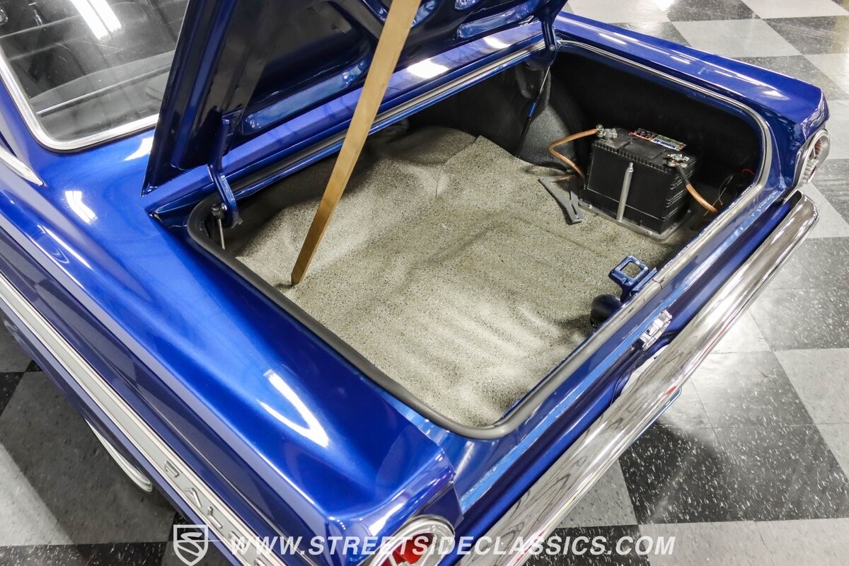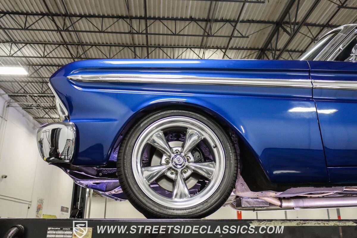 This 1965 Ford Falcon Futura Hardtop sports a striking Dark Blue Metallic paint job, a bold departure from its original Twilight Turquoise. The sleek body lines are complemented by gleaming chrome trim, creating a look that's both classic and aggressive. A custom fiberglass Thunderbolt-style hood gives the car a muscular profile. The Falcon sits low on 17" Rev wheels, wrapped in meaty 215/45ZR17 front and 225/45ZR17 rear tires. This exterior makeover showcases a perfect blend of vintage style and modern performance aesthetics.