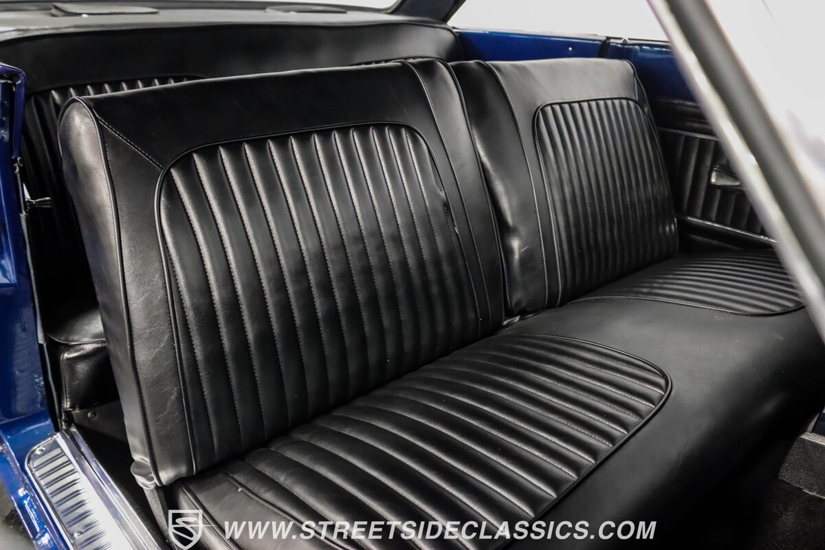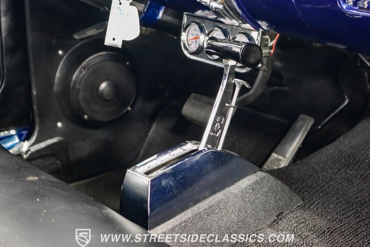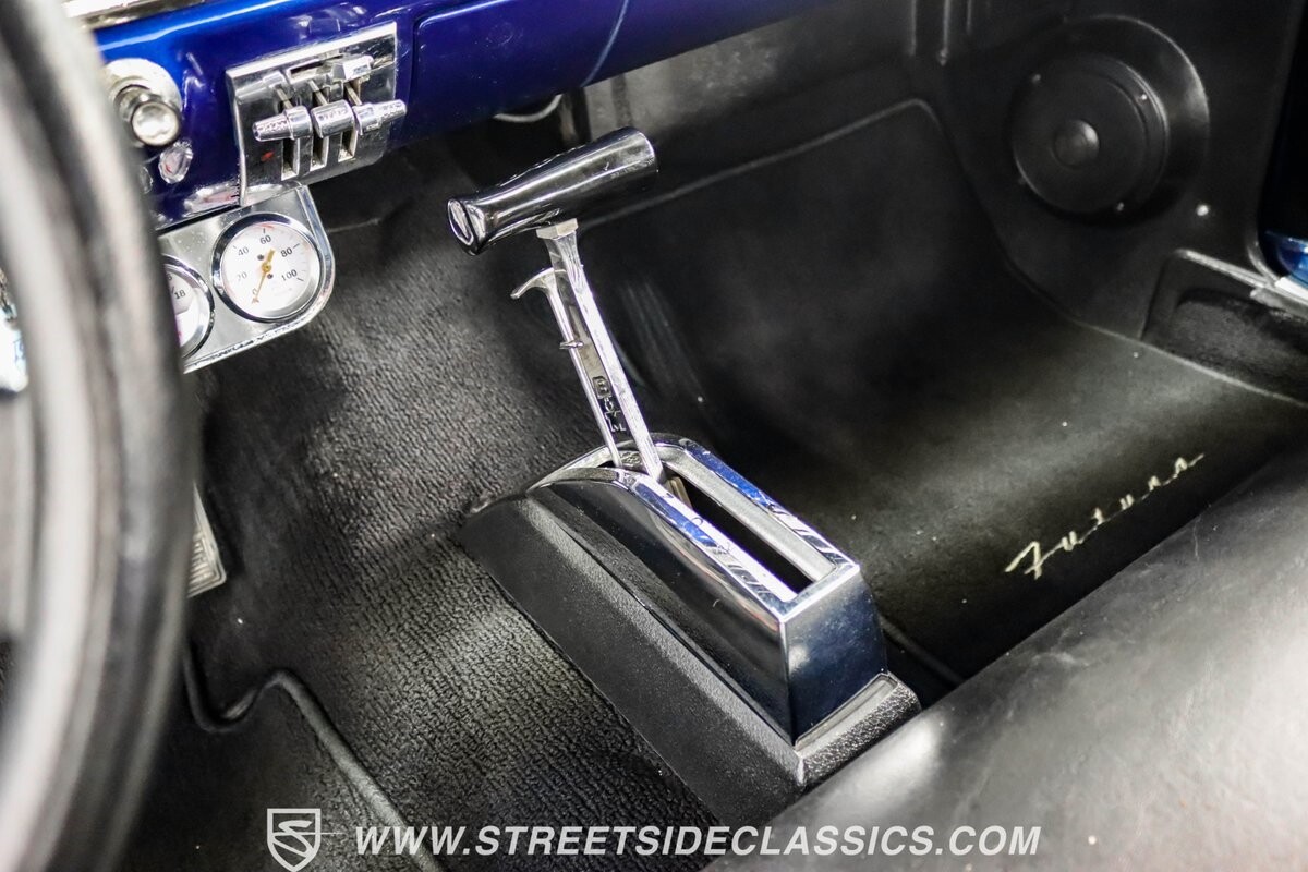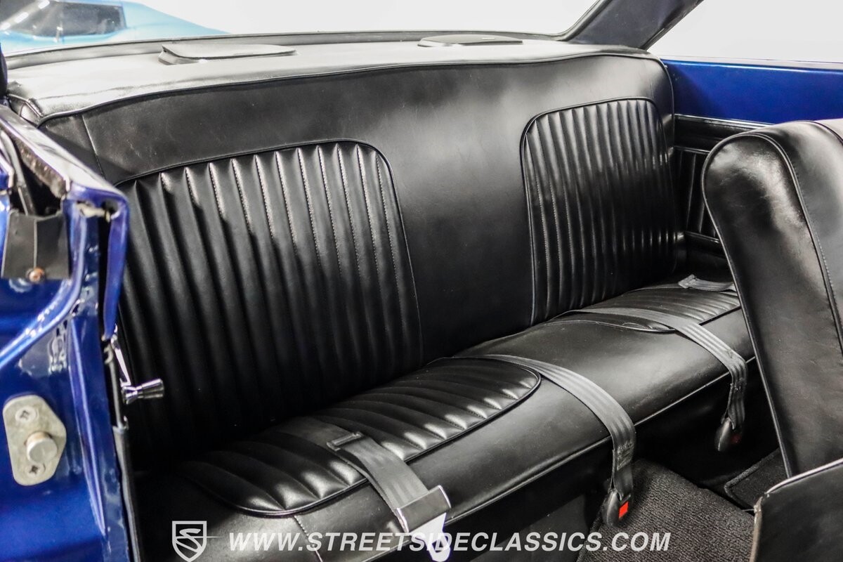 The black vinyl interior with bench seats combines classic elements with strategic upgrades. A custom steering wheel serves as the focal point, accompanied by white-faced gauges for crucial information display. The B&M shifter is positioned for quick action, aligning with the car's performance-oriented nature. An under-dash gauge cluster adds both functionality and style. And speakers in the rear deck lid allow for a personalized audio experience.
