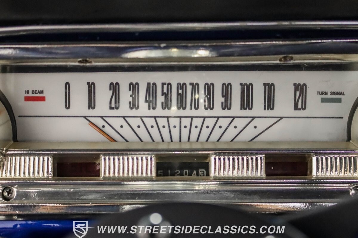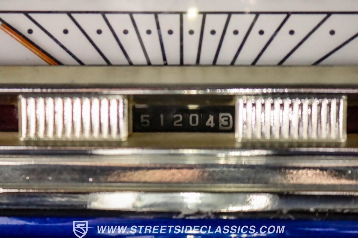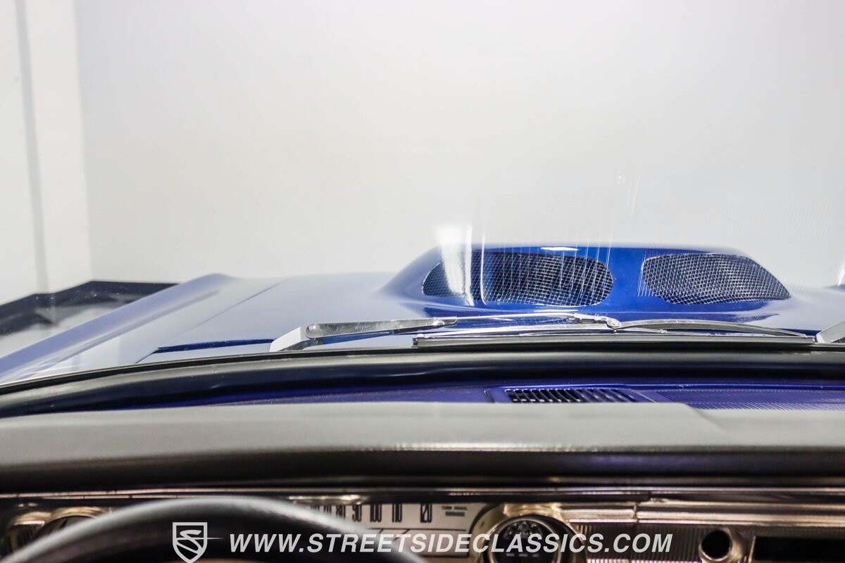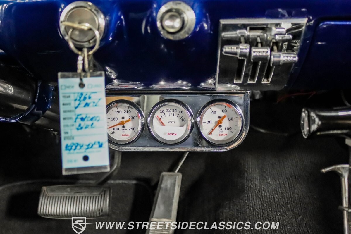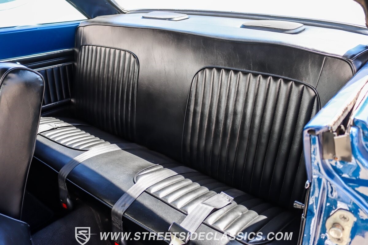 The black vinyl interior with bench seats combines classic elements with strategic upgrades. A custom steering wheel serves as the focal point, accompanied by white-faced gauges for crucial information display. The B&M shifter is positioned for quick action, aligning with the car's performance-oriented nature. An under-dash gauge cluster adds both functionality and style. And speakers in the rear deck lid allow for a personalized audio experience.