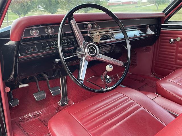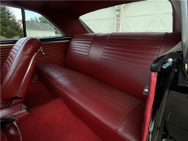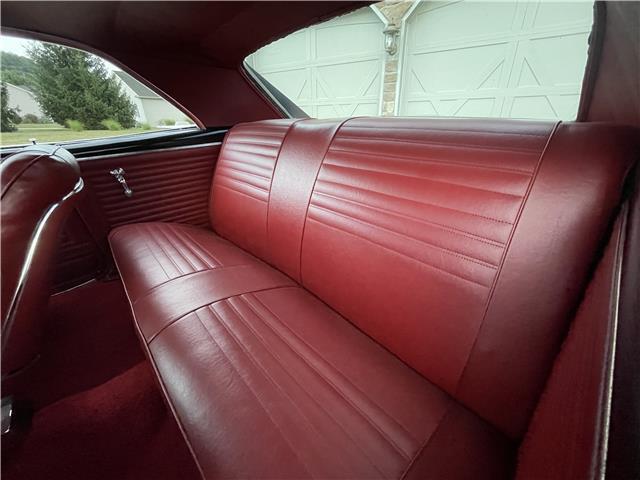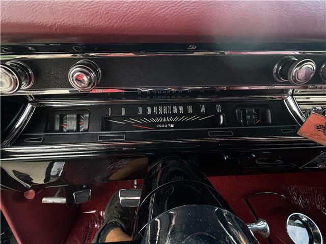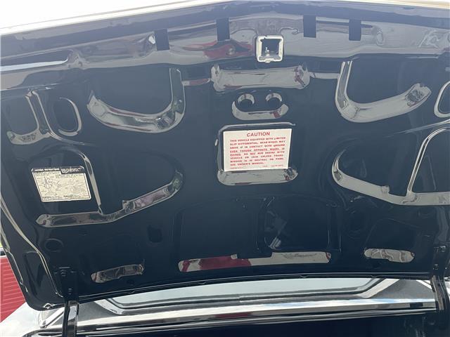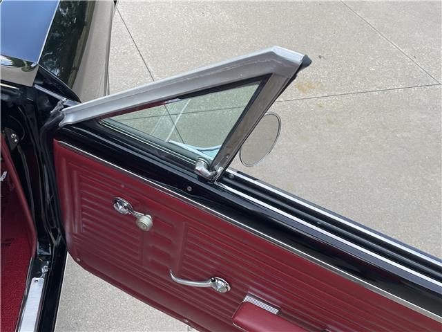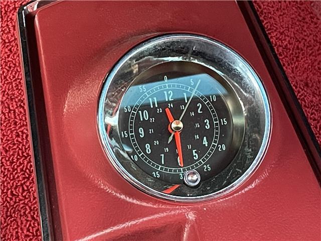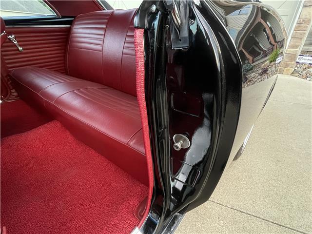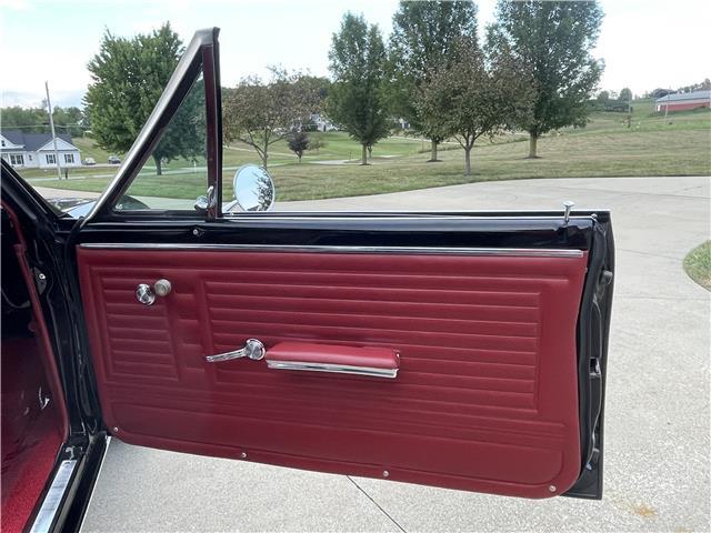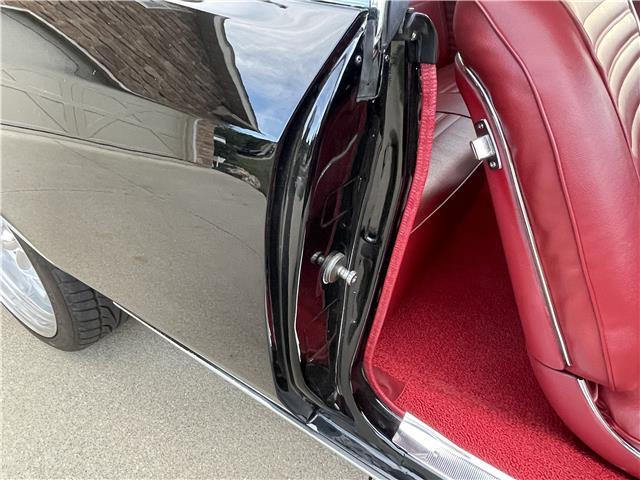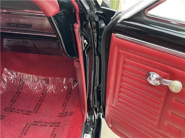 The red interior really pops up against the mirror like Tuxedo Black exterior. The seat upholstery, door panels, armrests, carpet and headliner all look real good. All the interior lights work. Looking forward to the dash: it has the factory gauges and the lenses are crystal clear. The heater controls slide with ease and has new bright work on the dash. The factory steering wheel is nice. It has its original AM radio. Nothing appears cut-up or altered.