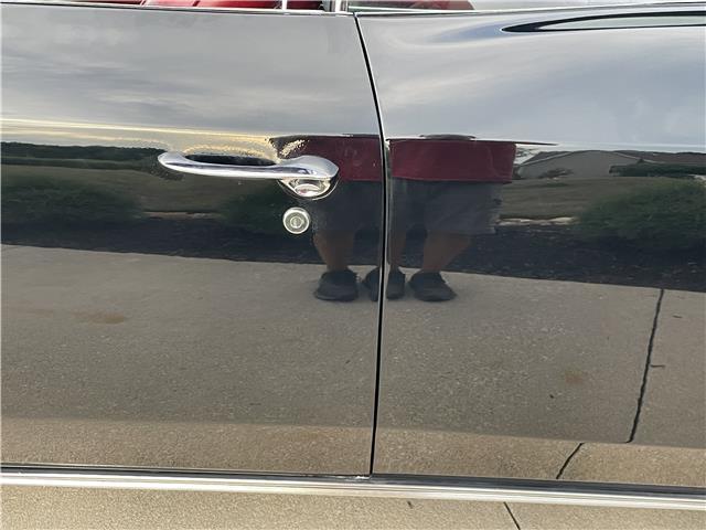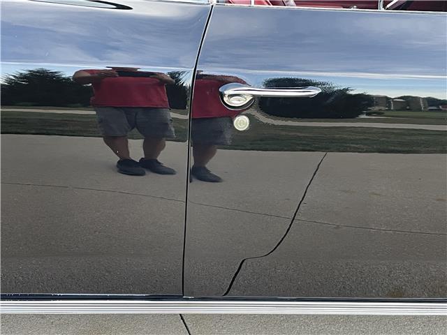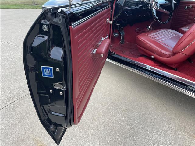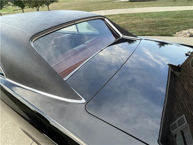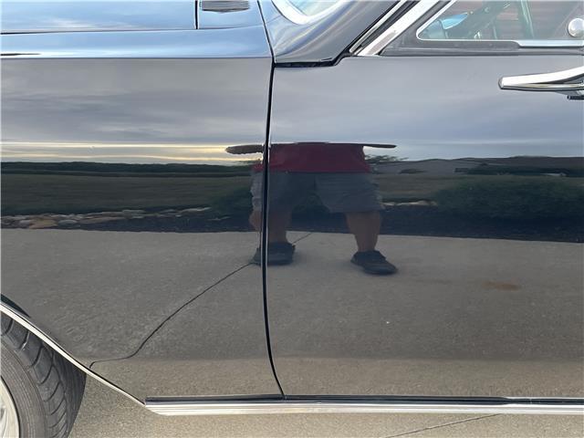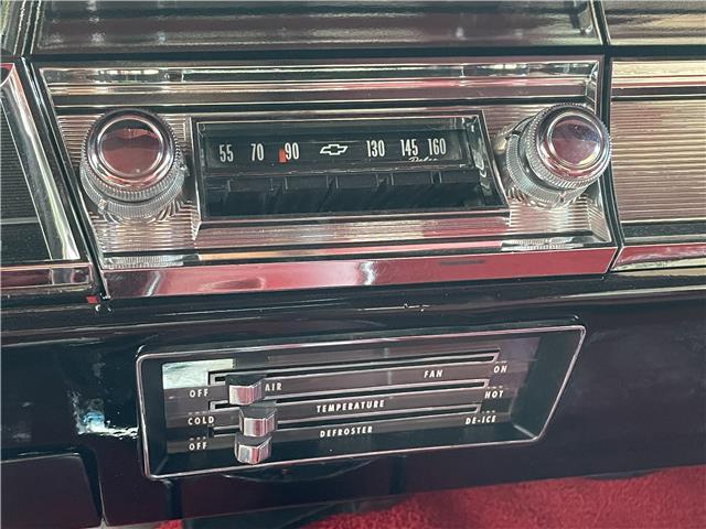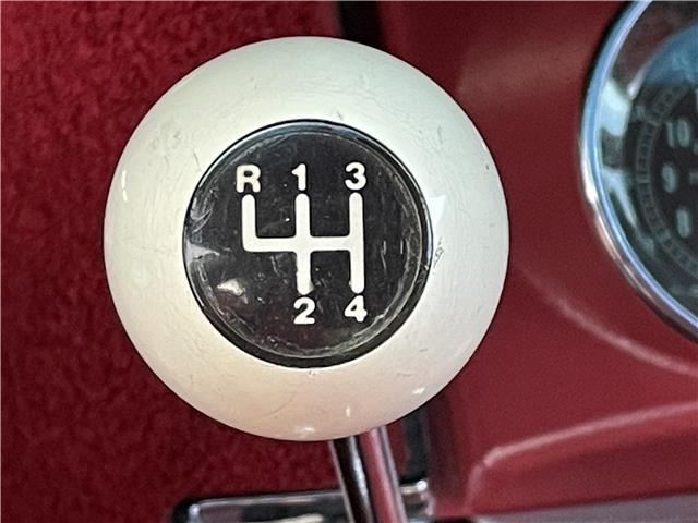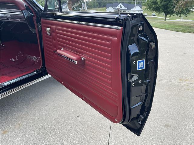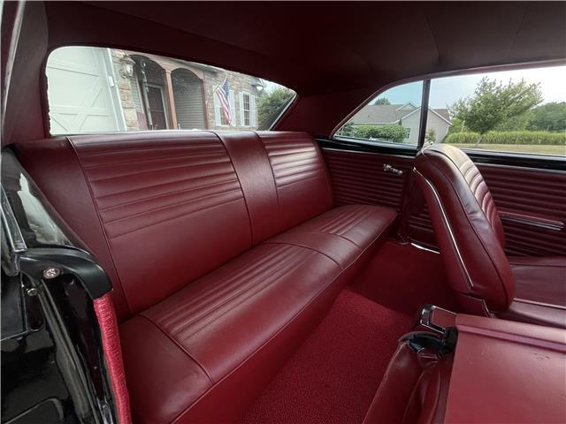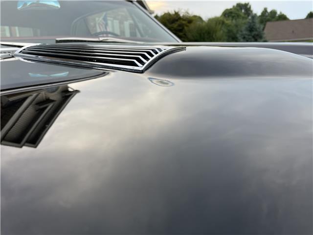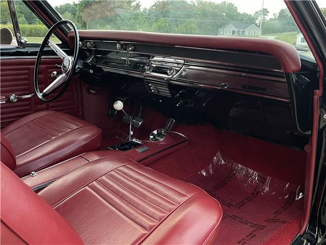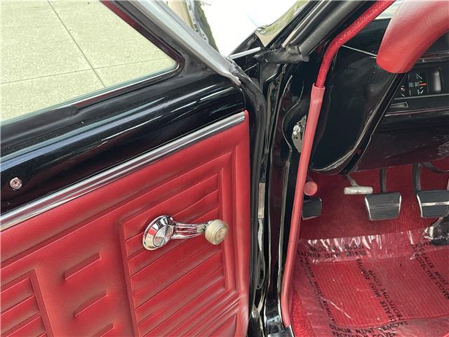 The red interior really pops up against the mirror like Tuxedo Black exterior. The seat upholstery, door panels, armrests, carpet and headliner all look real good. All the interior lights work. Looking forward to the dash: it has the factory gauges and the lenses are crystal clear. The heater controls slide with ease and has new bright work on the dash. The factory steering wheel is nice. It has its original AM radio. Nothing appears cut-up or altered.