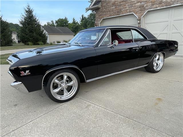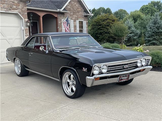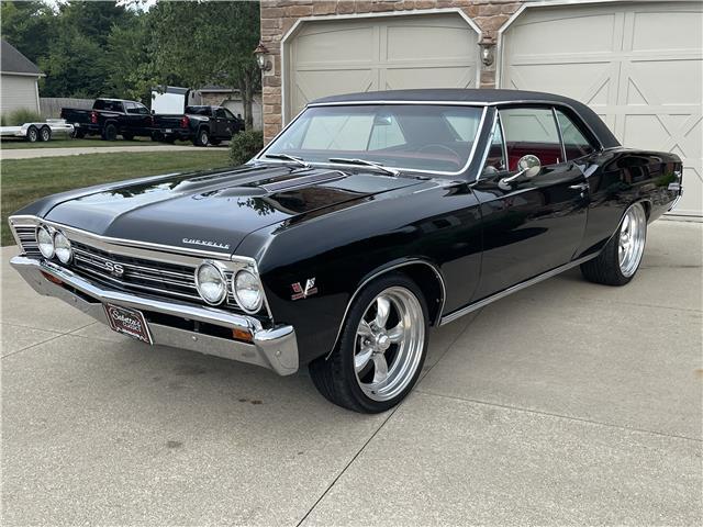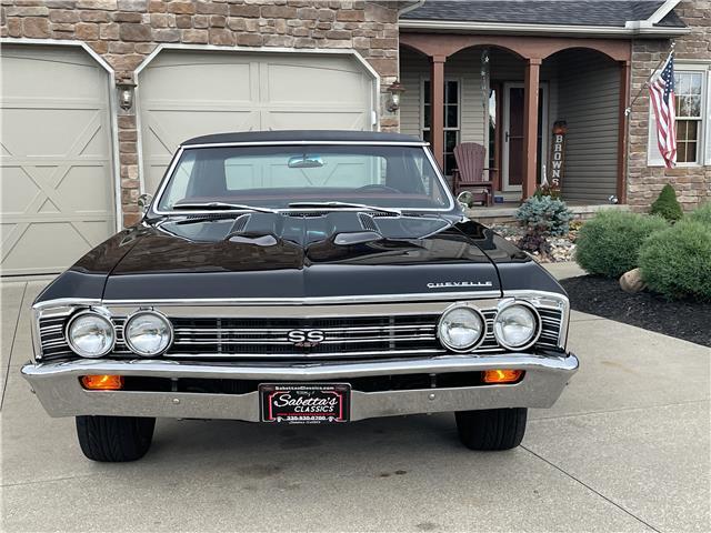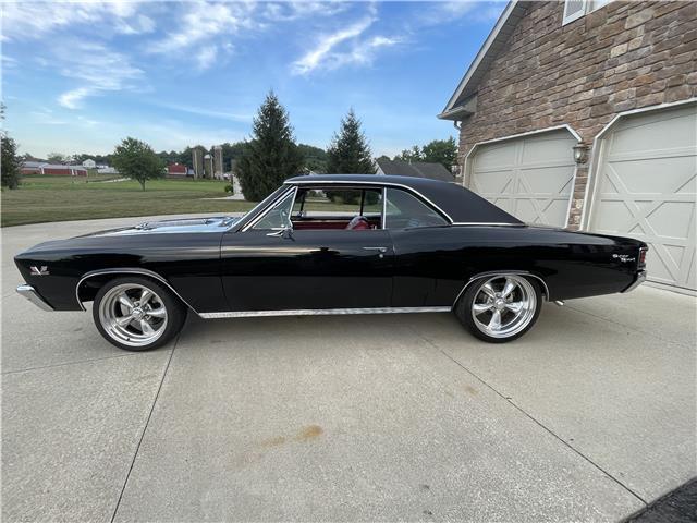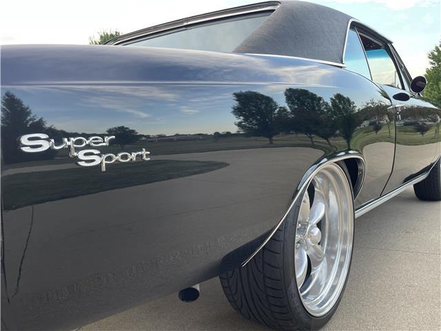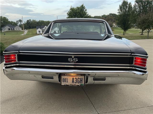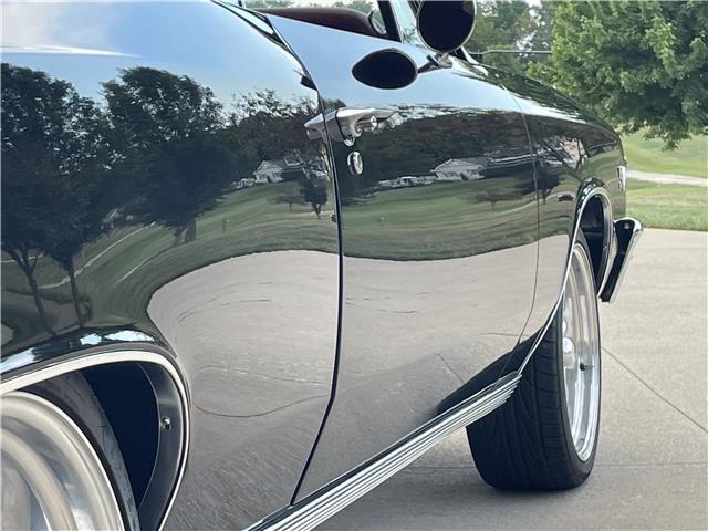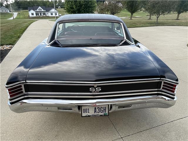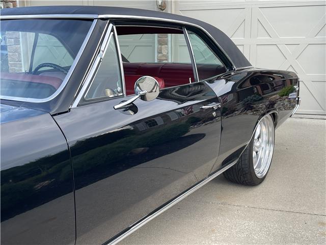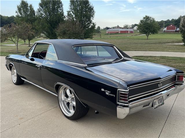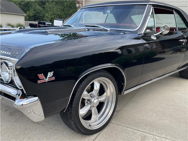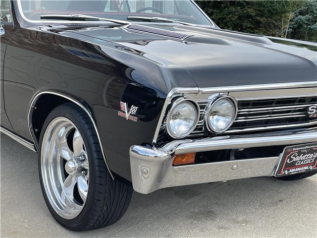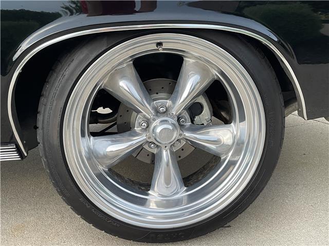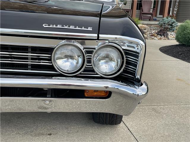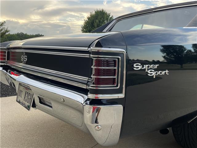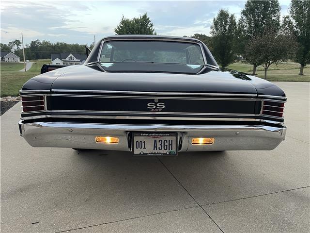 This 1967 Chevrolet Chevelle SS is great looking! It presents itself very well. Looking down both sides, the body is straight. It wears its factory color Tuxedo Black, code A. The door jambs are very clean and glossy. The chrome and trim are bright and shiny including the door handles, emblems, taillights, front and rear bumpers. The windshield and windows are crystal clear, the weather stripping and window seals have all been replaced. It sits on a set of staggered American Racing Torq Thrust wheels with performance tires 275/30/20 inch in rear and 225/40/18 inch in front, they really give the car a great stance!