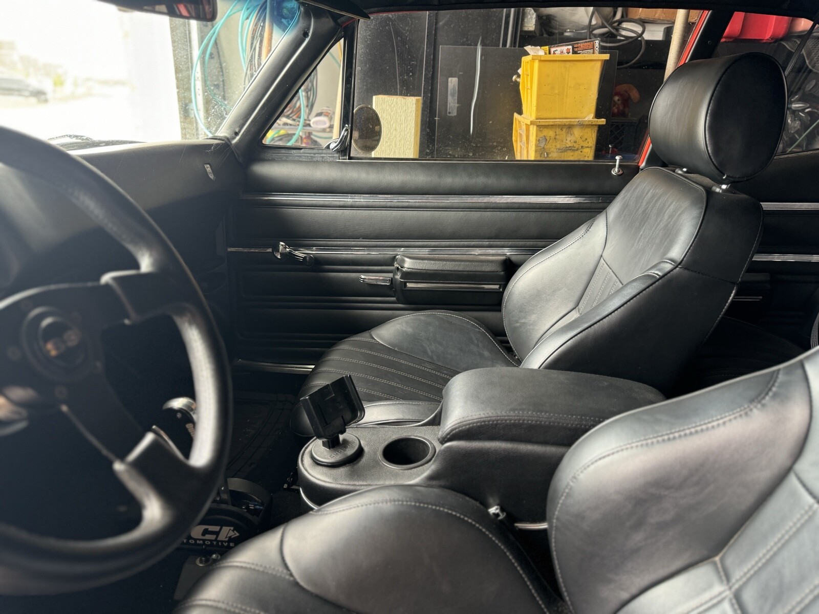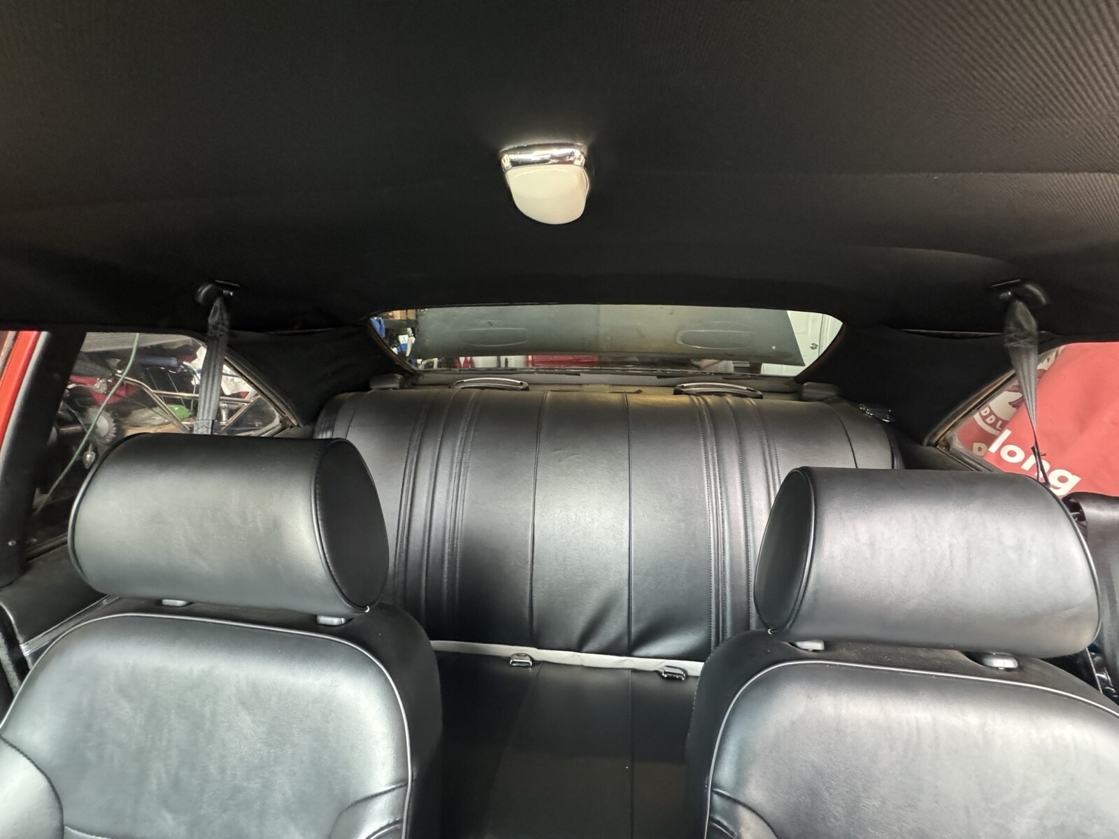 -leather bucket front seats, leather bench seat in the back, new carpet and headliner, leather side panels, new door handles and window cranks, new glove box