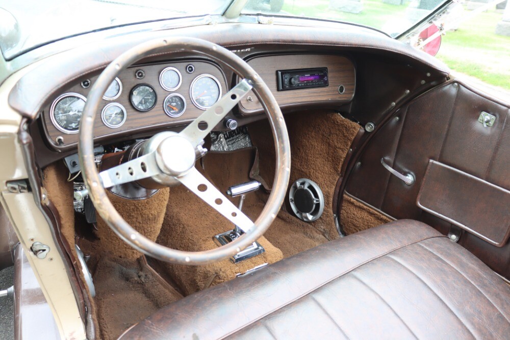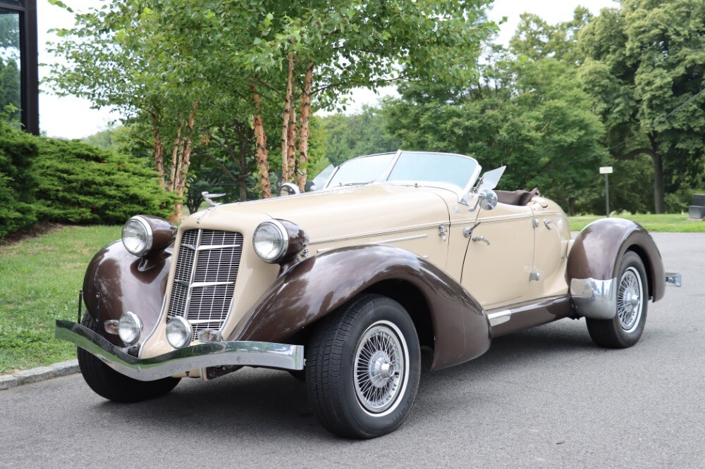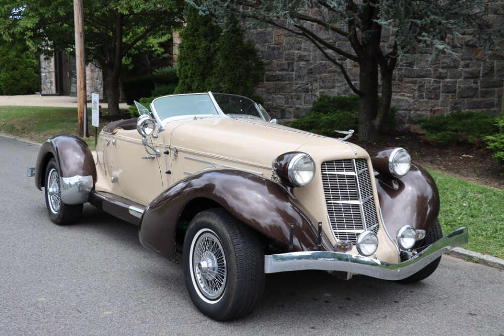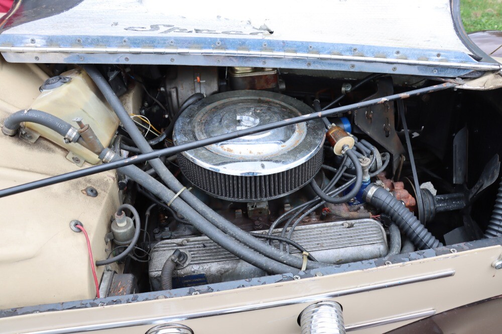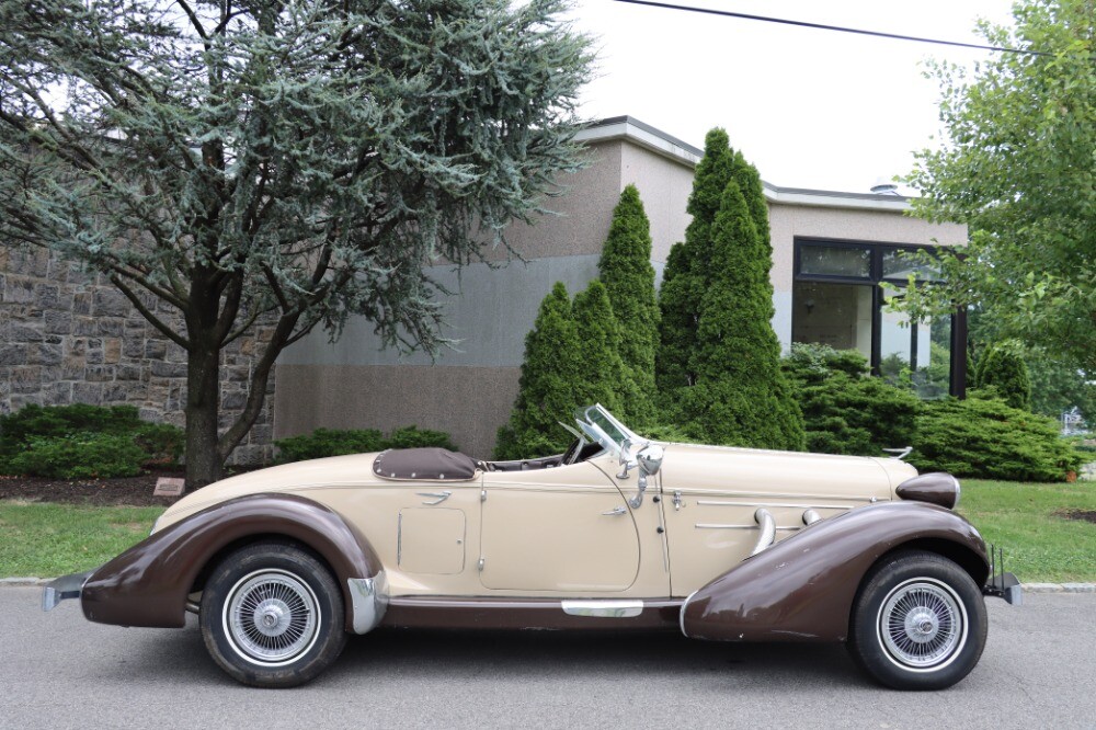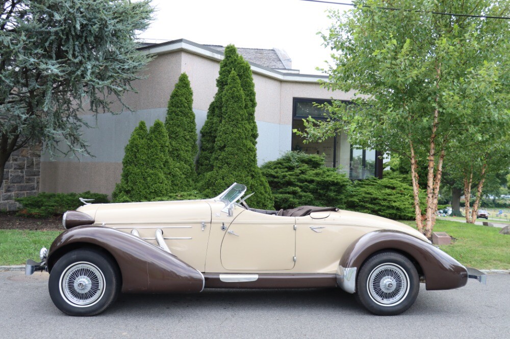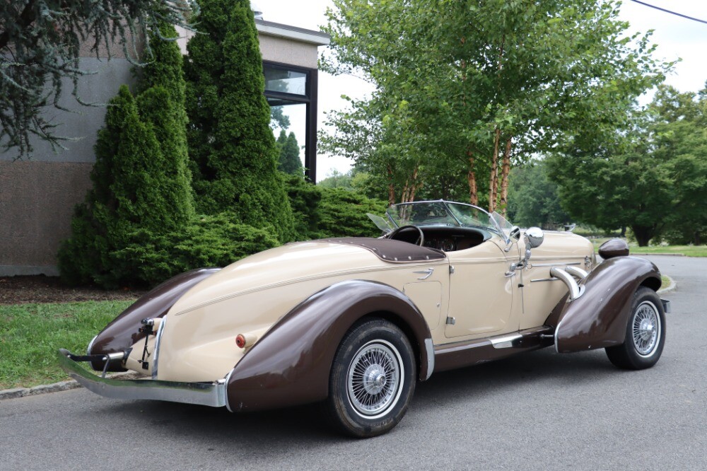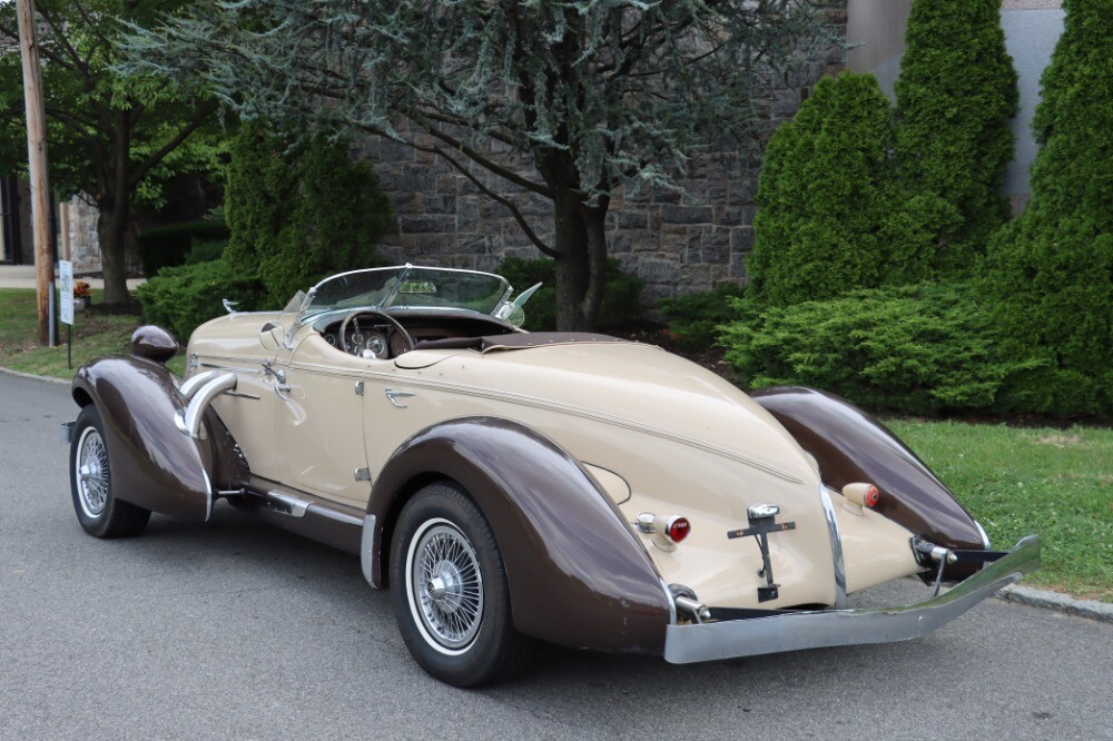 This 1972 Auburn Boat Tail Speedster Recreation was built by Auburn Speedsters Company of Buffalo, NY. Tan and brown with brown interior. It was built on a Lincoln chassis with a 429 ford V8 engine and automatic transmission. It was last running 10 years ago. Just out of storage and in need of servicing. It's also ready for paintwork but the interior is overall clean. The body is in good shape and the underside is solid. Offered with soft top and tonneau cover. Showing 40k miles on the odometer. Once sorted, the Ford V8 and its three-speed automatic transmission are easy to maintain and well within budget to do so. A rare opportunity to acquire a car that captures the stunning presence of the Auburn Speedster for a small fraction of the price of an original.