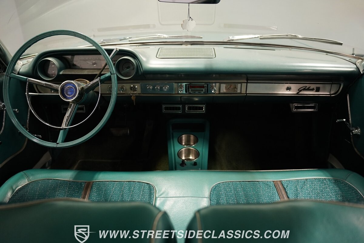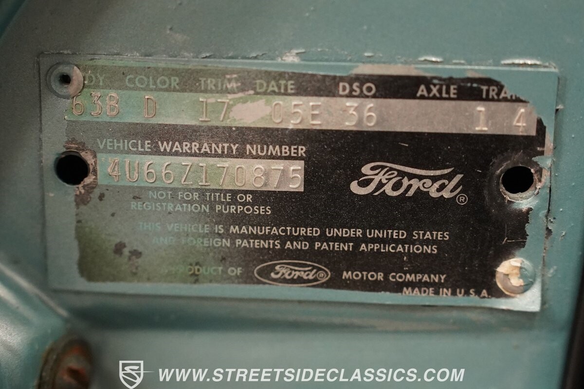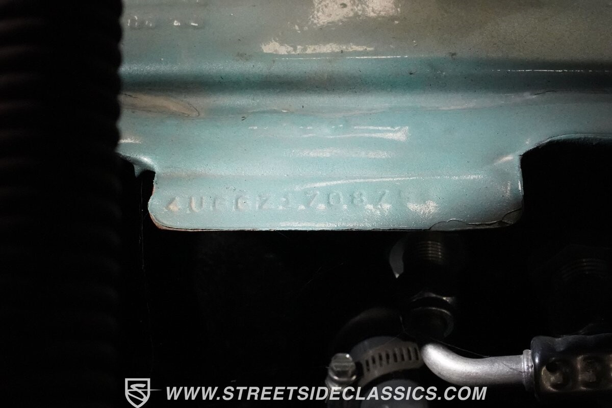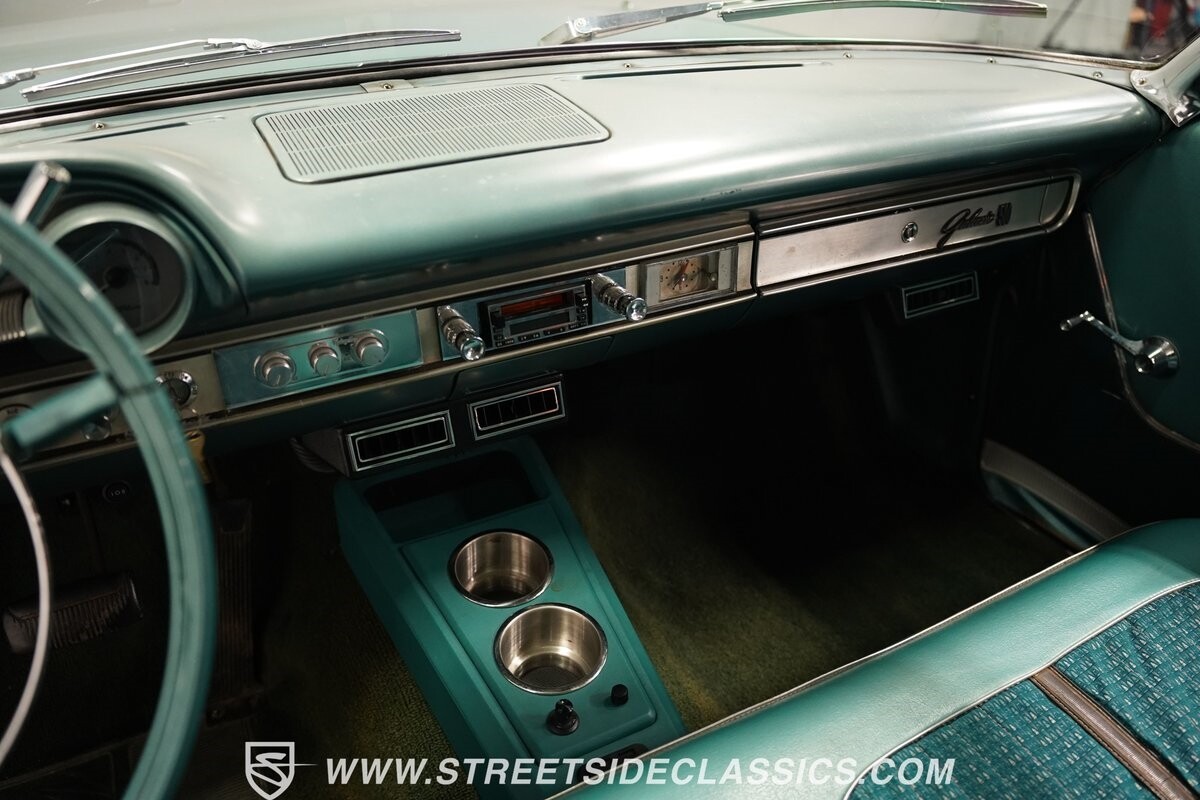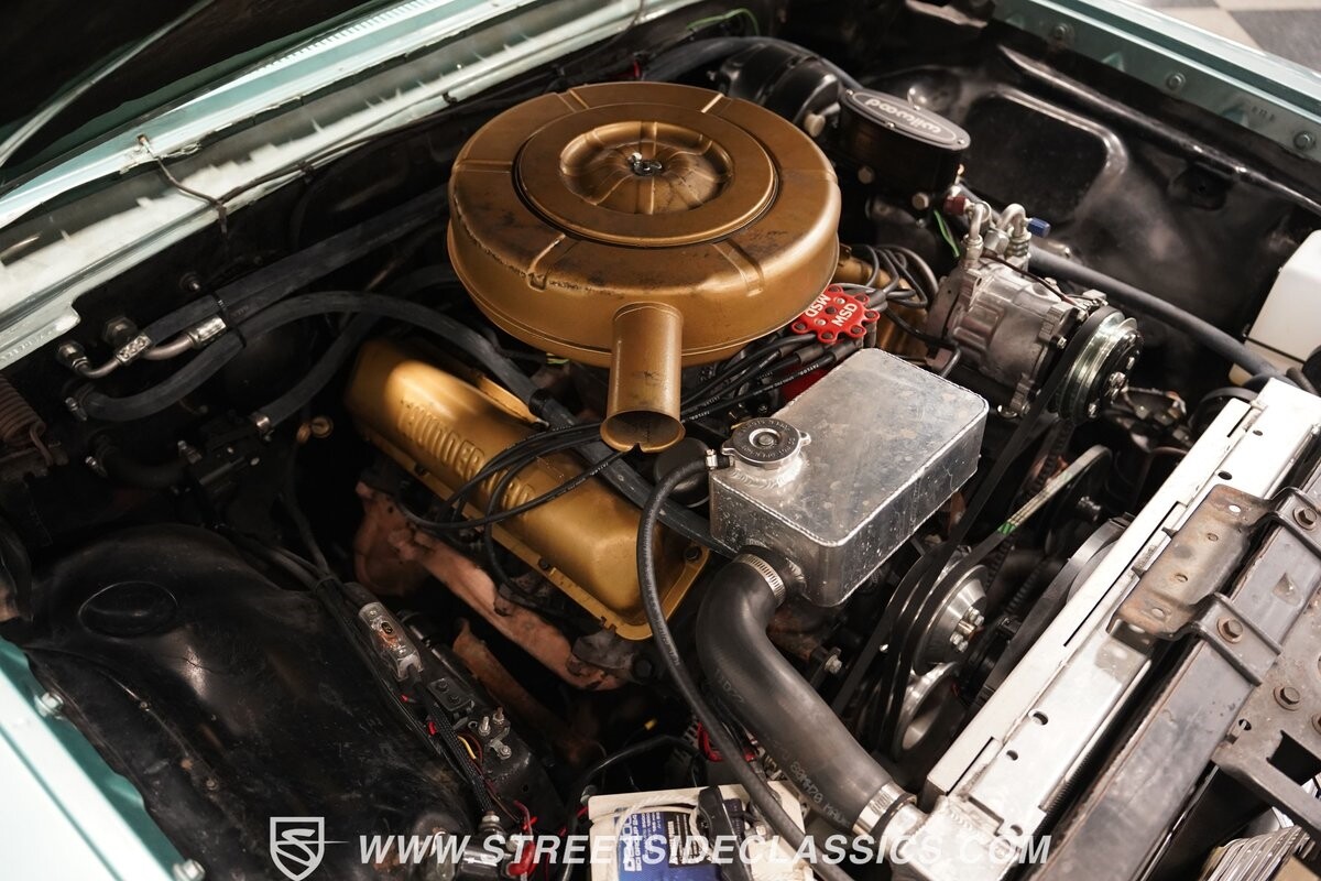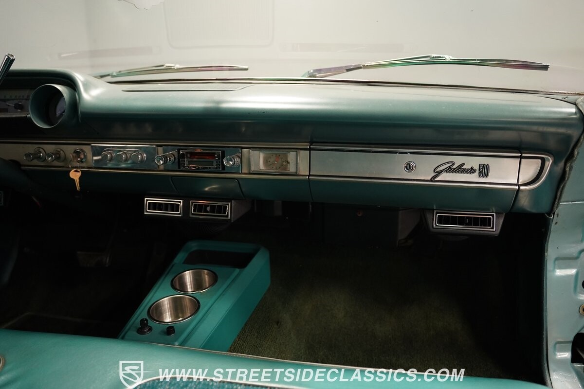 Step inside this Ford Galaxie 500 and you're enveloped in a turquoise realm that immediately sets a retro tone, thanks to original vinyl bench seats and matching door panels. Modern touches like a new custom center console equipped with USB ports, Dakota digital gauges, and an Alpine sound system blend seamlessly, enhancing the cabin's functionality. With Power steering it's got the right mix of original and modern to let you cruise in comfort.