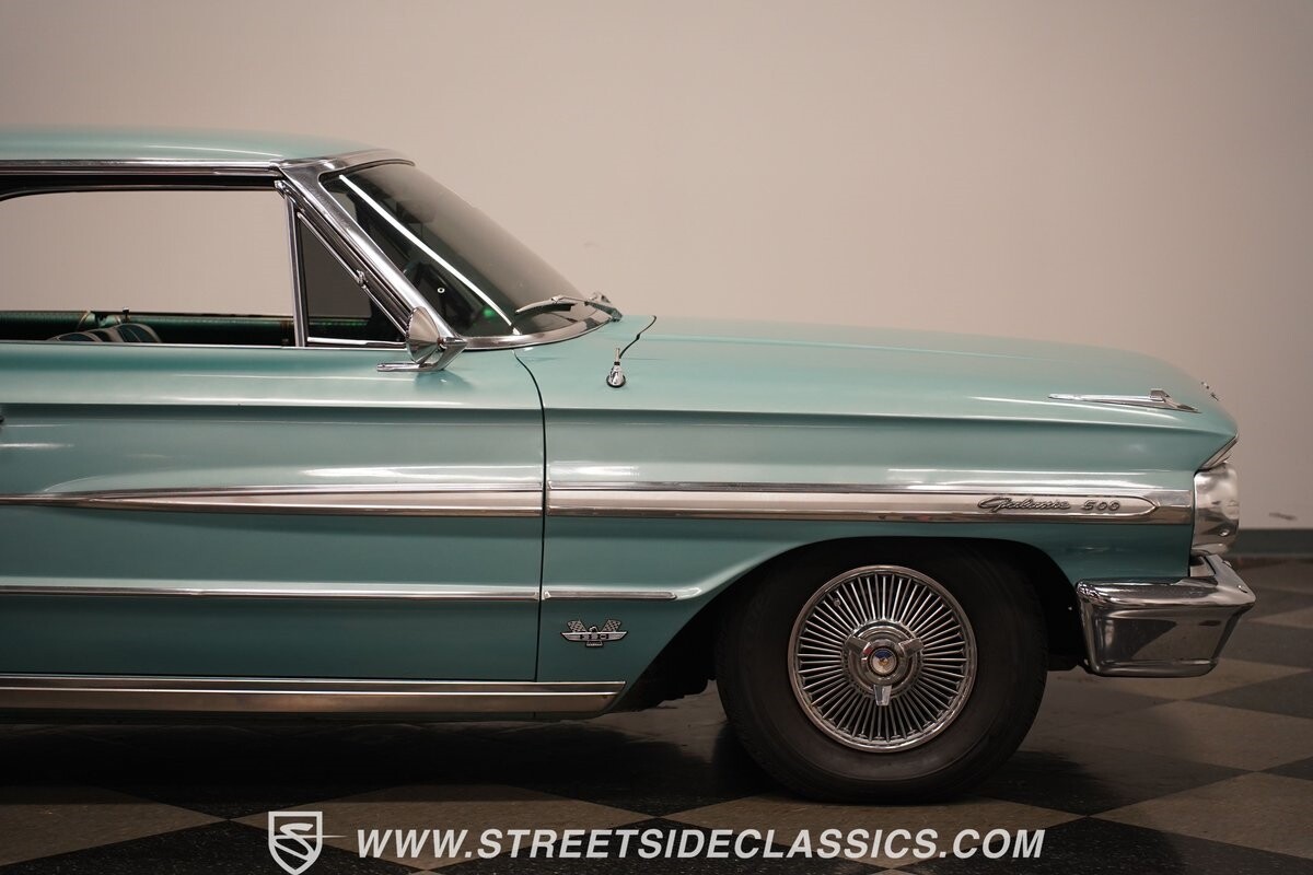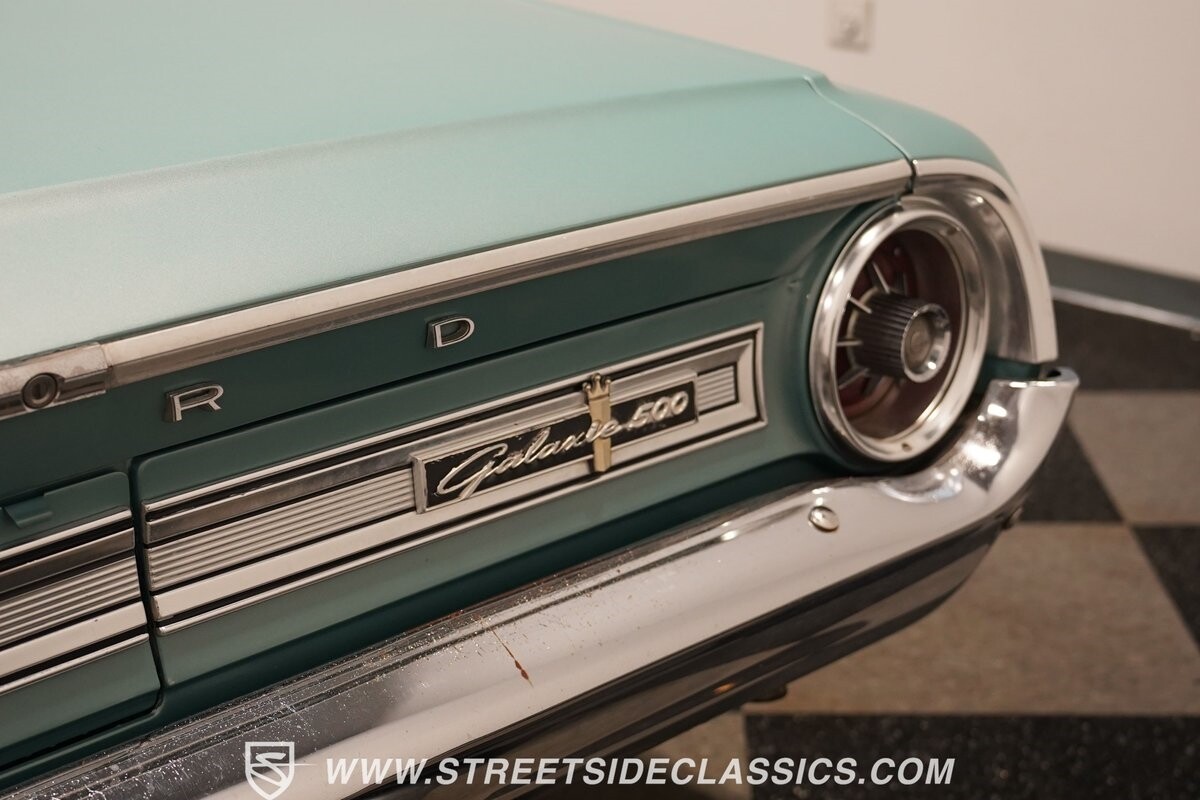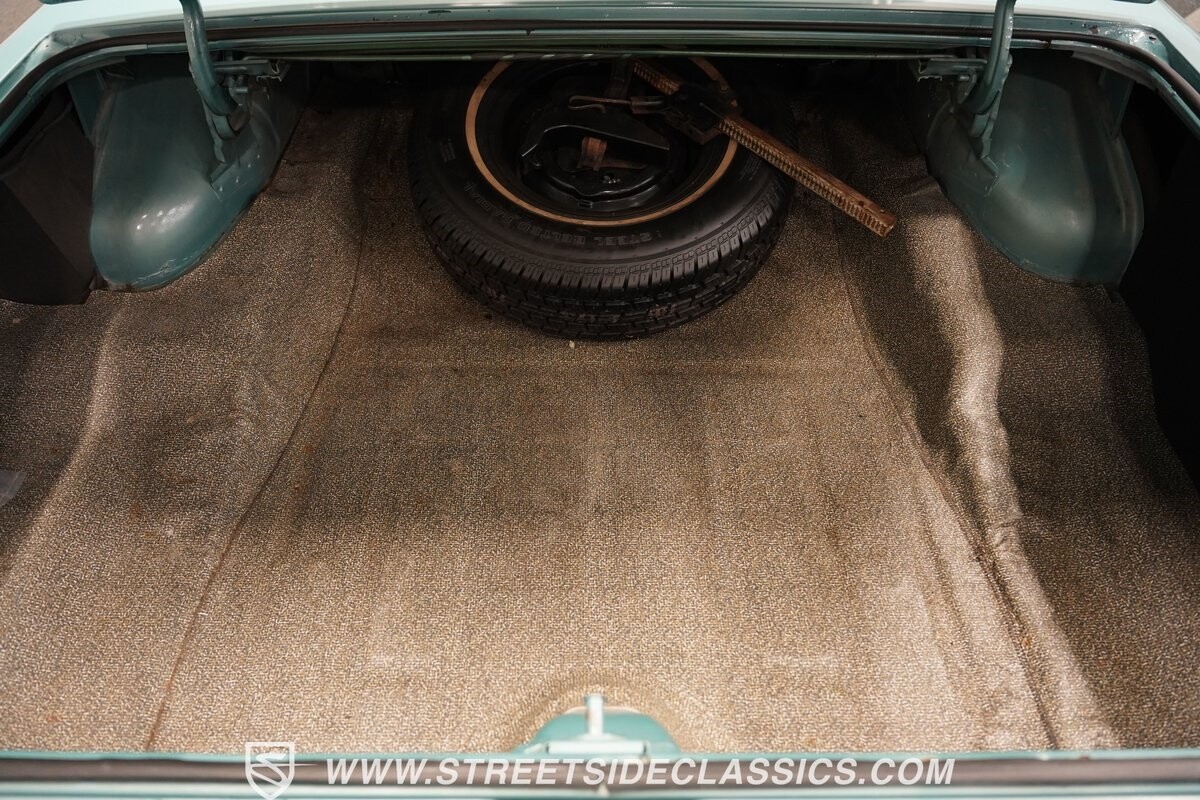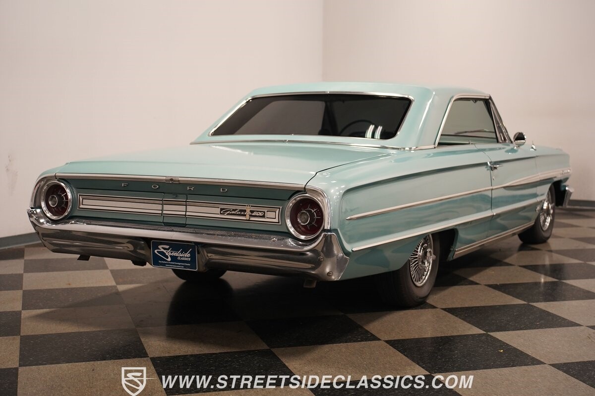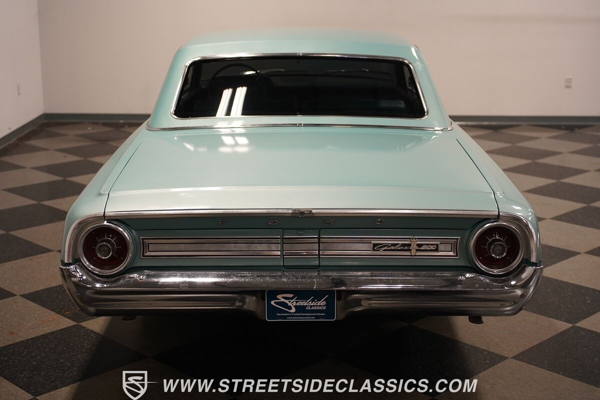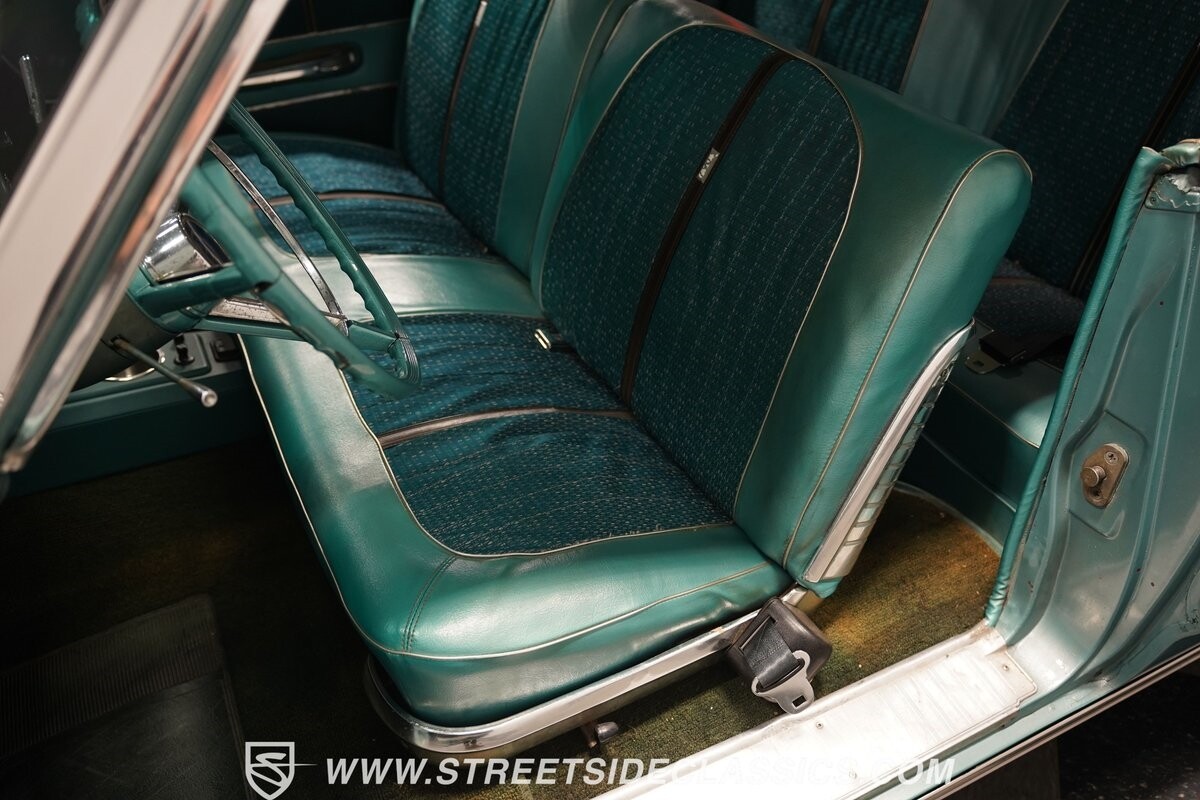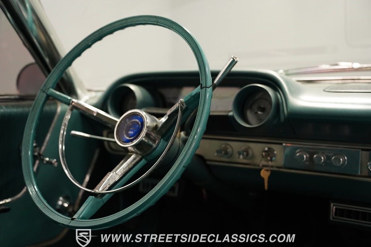 Step inside this Ford Galaxie 500 and you're enveloped in a turquoise realm that immediately sets a retro tone, thanks to original vinyl bench seats and matching door panels. Modern touches like a new custom center console equipped with USB ports, Dakota digital gauges, and an Alpine sound system blend seamlessly, enhancing the cabin's functionality. With Power steering it's got the right mix of original and modern to let you cruise in comfort.