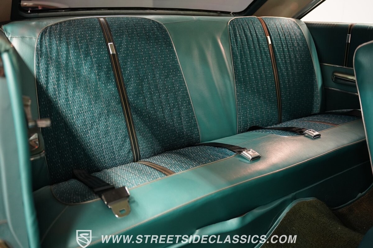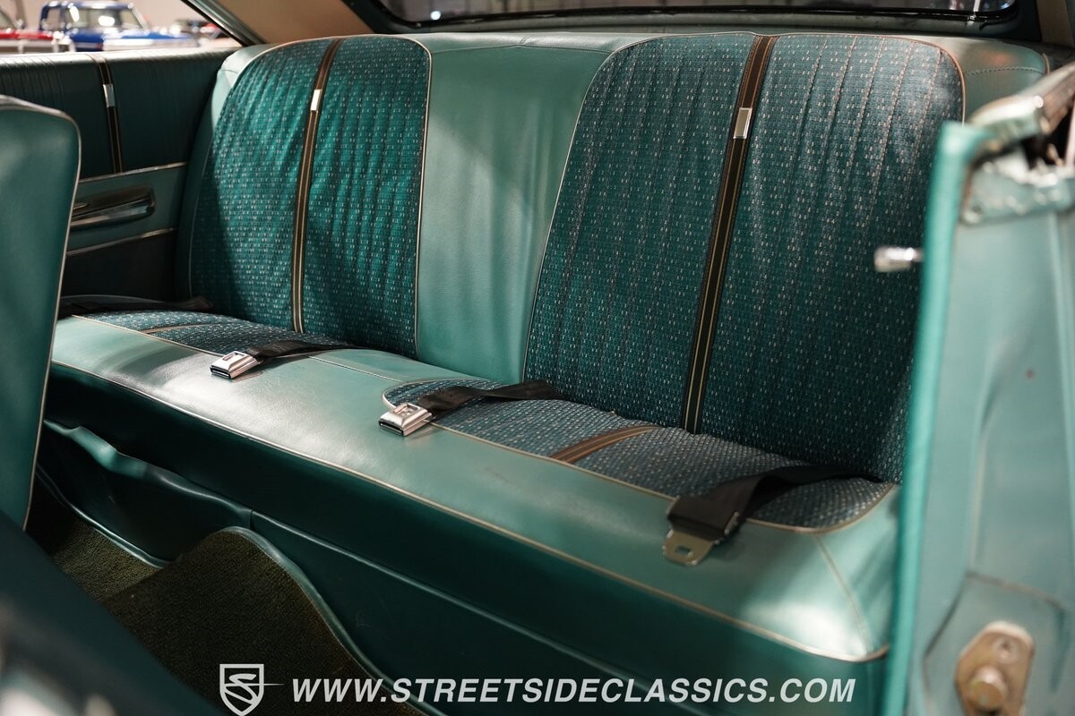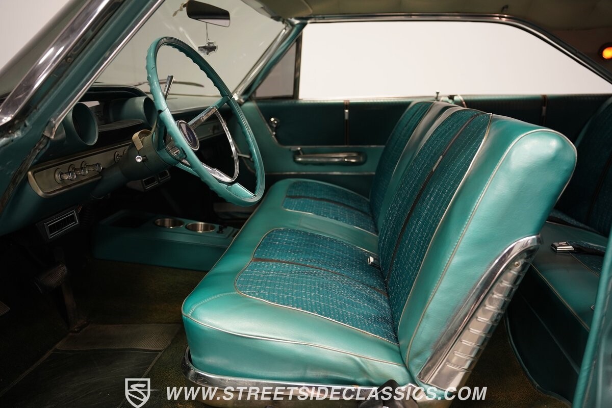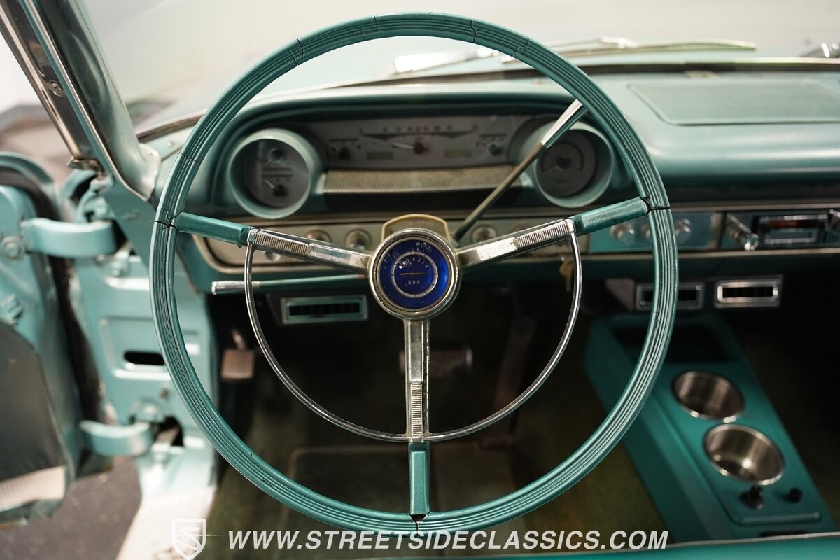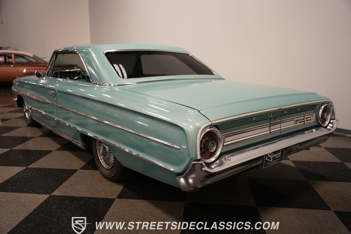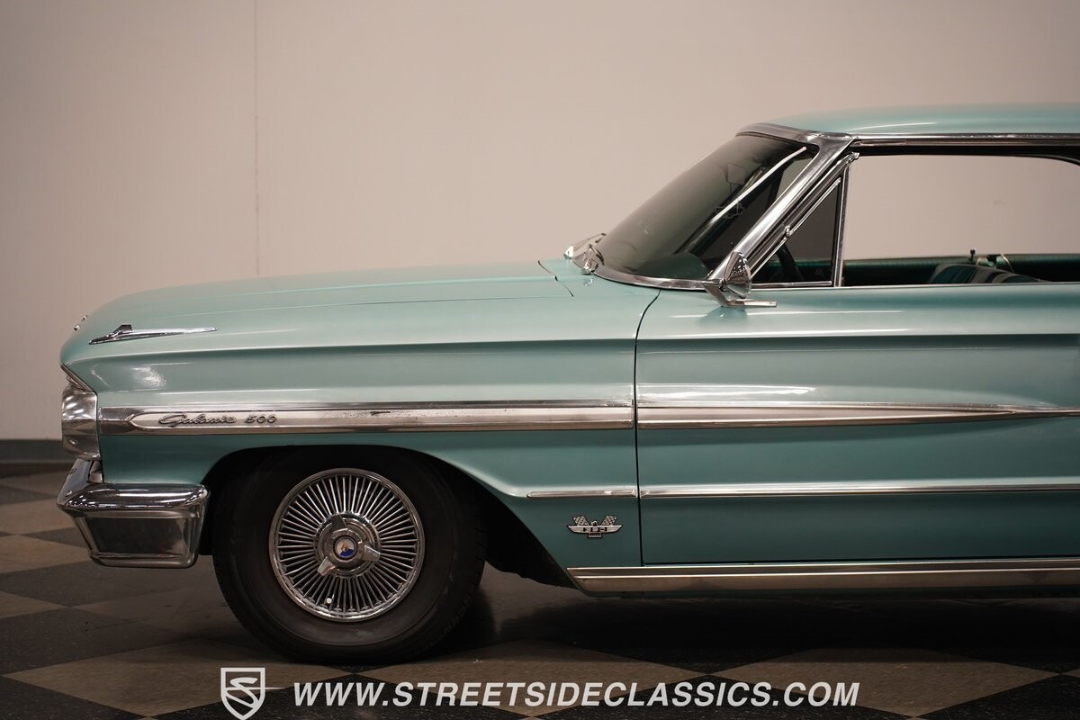 Step inside this Ford Galaxie 500 and you're enveloped in a turquoise realm that immediately sets a retro tone, thanks to original vinyl bench seats and matching door panels. Modern touches like a new custom center console equipped with USB ports, Dakota digital gauges, and an Alpine sound system blend seamlessly, enhancing the cabin's functionality. With Power steering it's got the right mix of original and modern to let you cruise in comfort.