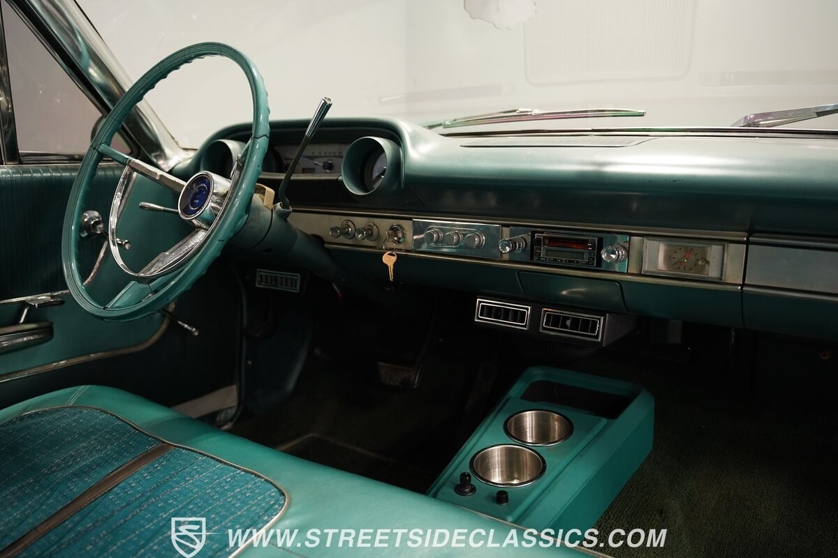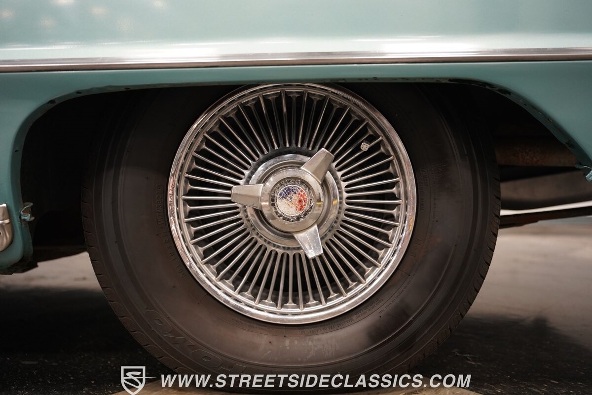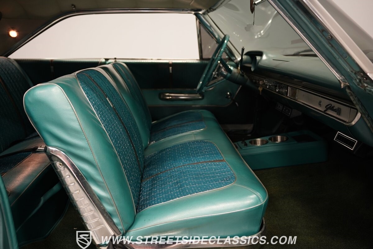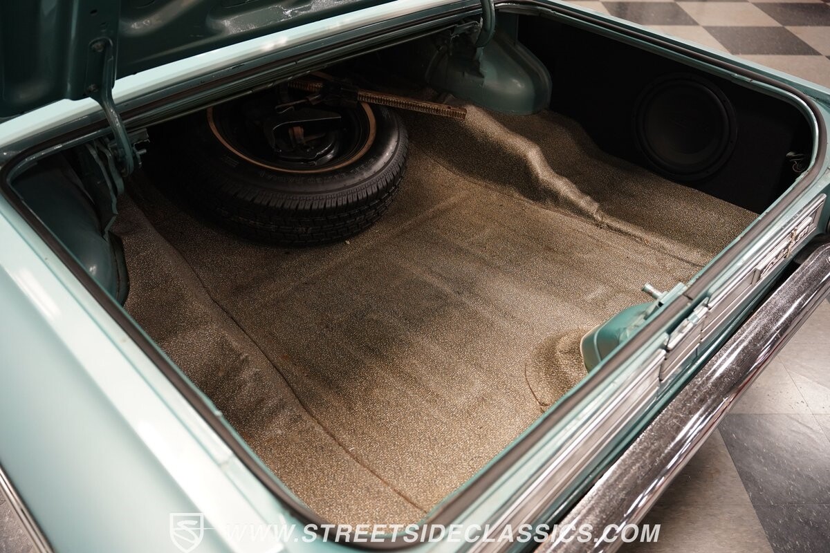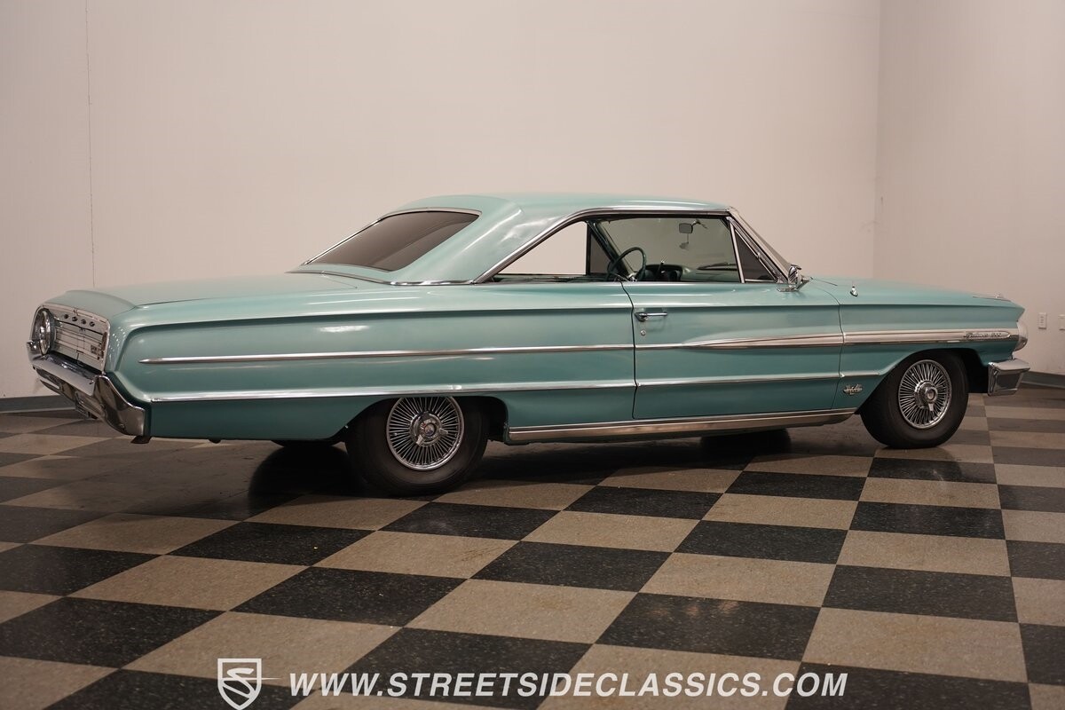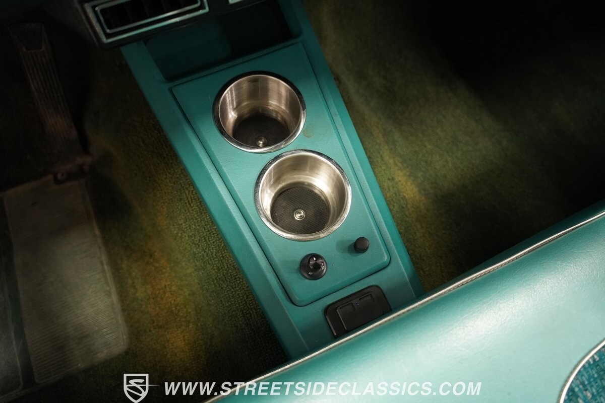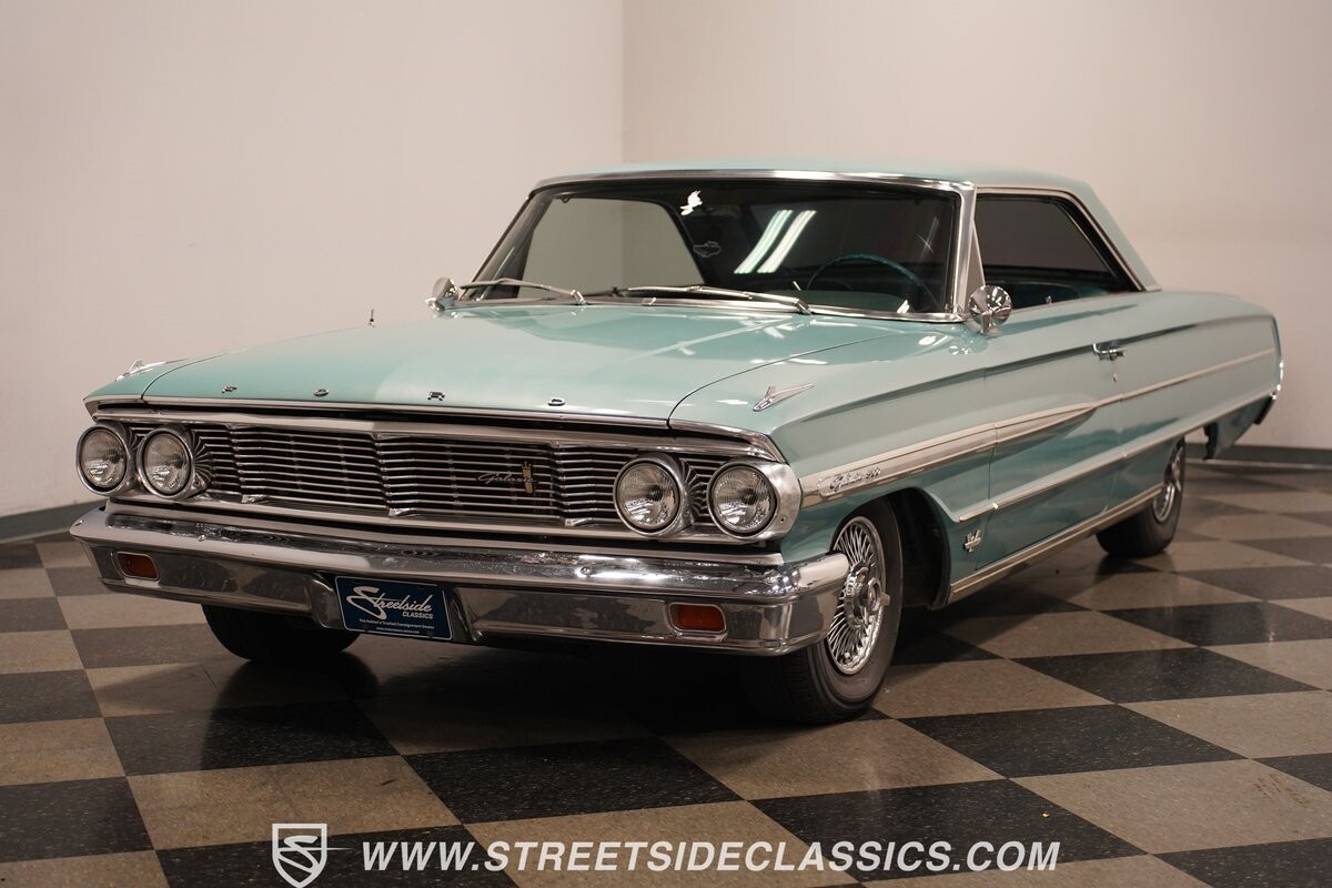 Step inside this Ford Galaxie 500 and you're enveloped in a turquoise realm that immediately sets a retro tone, thanks to original vinyl bench seats and matching door panels. Modern touches like a new custom center console equipped with USB ports, Dakota digital gauges, and an Alpine sound system blend seamlessly, enhancing the cabin's functionality. With Power steering it's got the right mix of original and modern to let you cruise in comfort.