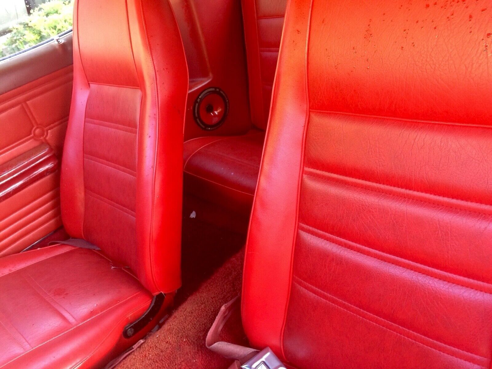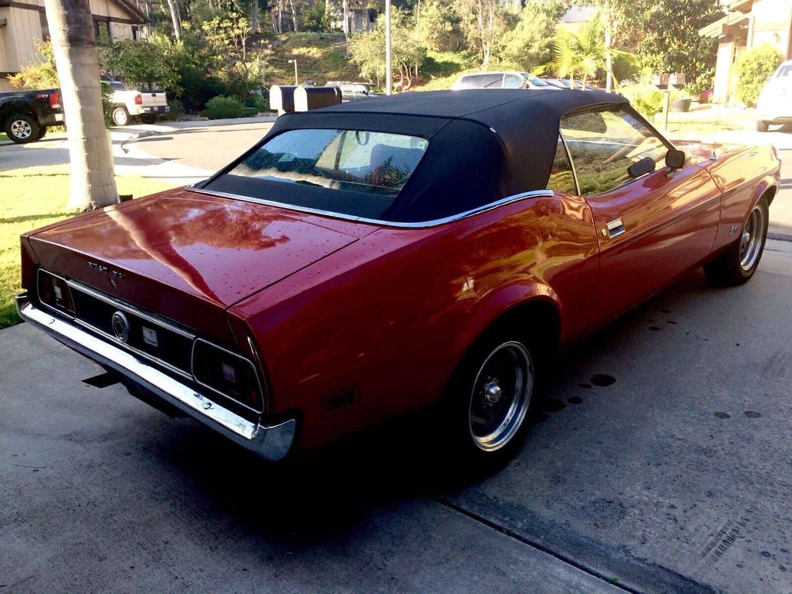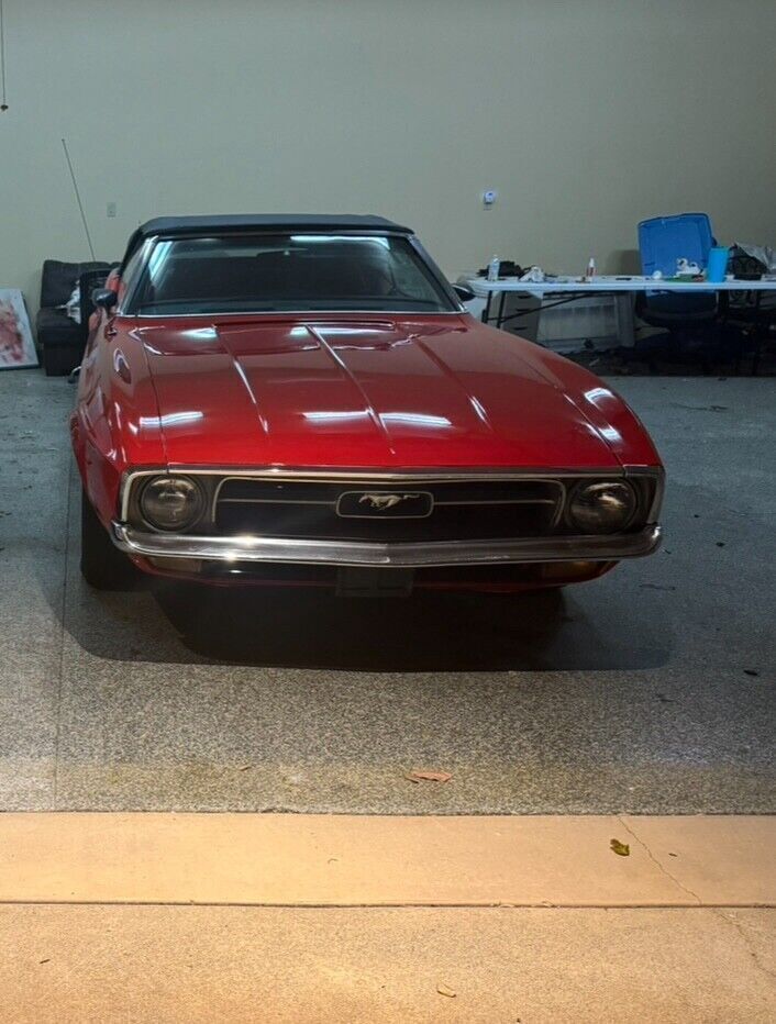 This is a 1971 classic red convertible mustang with a red leather interior in pristine condition. It has a candy apple red paint job and runs smoothly.