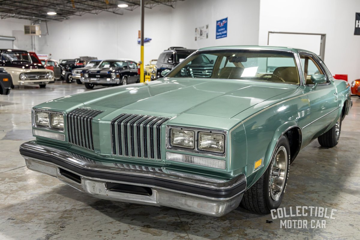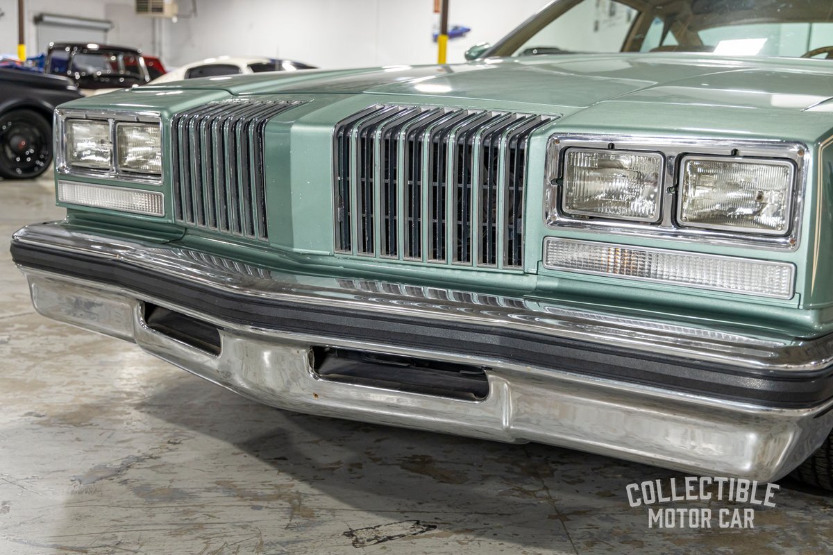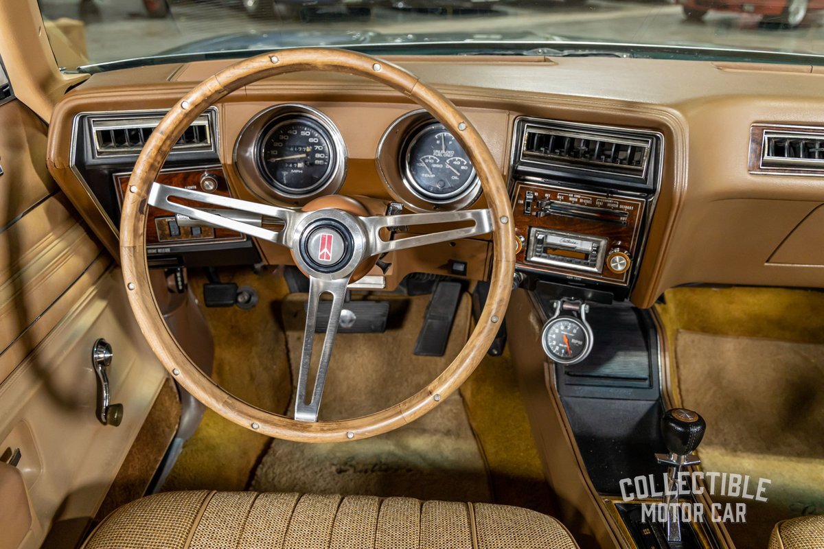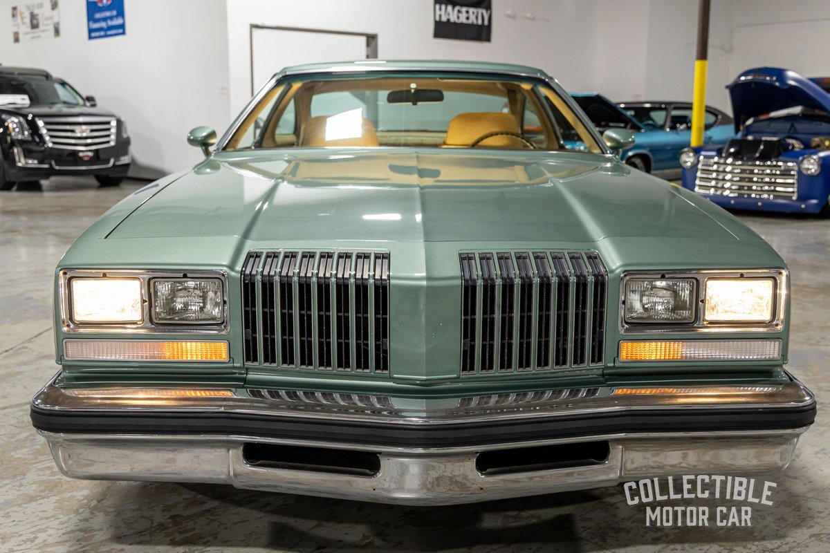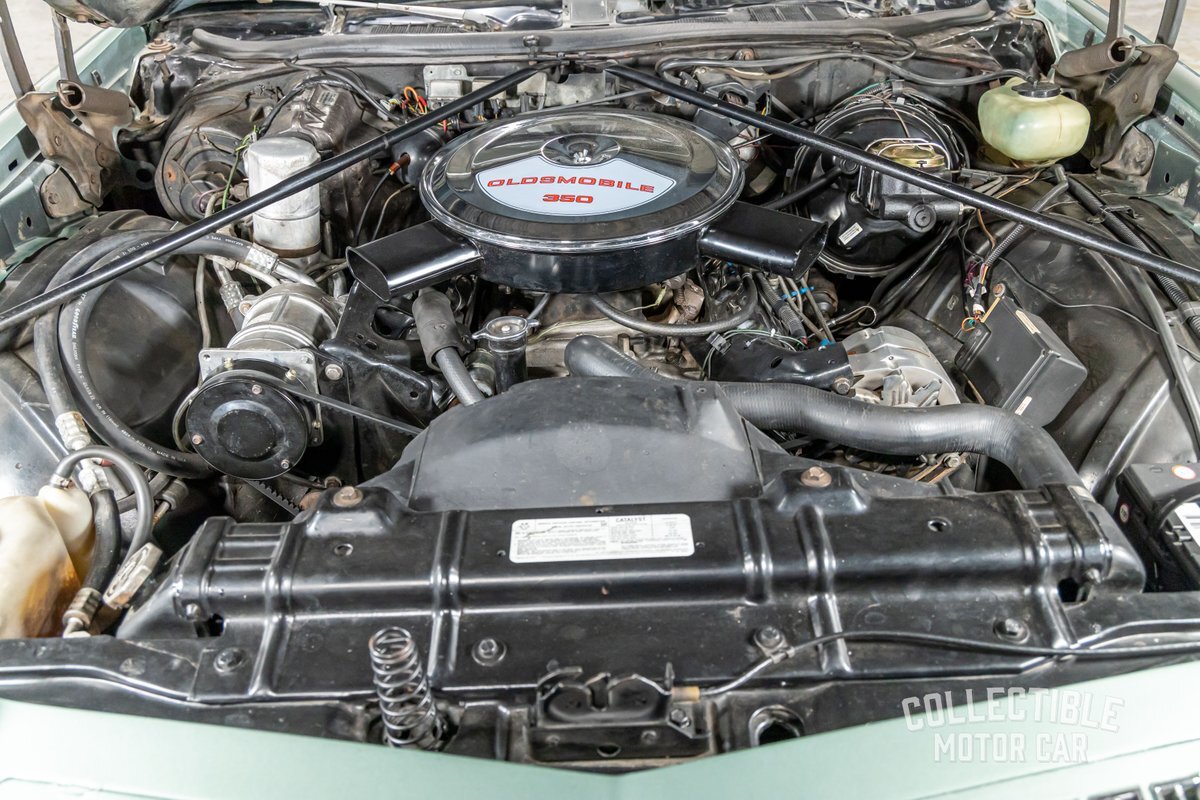 Oldsmobile always seemed to know how to deliver style. The front end makes a well-defined statement with a pointed middle and waterfall grilles that have the sharp drop-off of Niagara Falls. The rear shows off more of the crisply-defined look, and it's nicely detailed, right down to the badging within the taillights. This is said to be a factory paint vehicle, and it has not only survived but thrived! So, you'll love the brightness that's still in the finish. It's the kind of preservation you get on a low-mileage car. And since it's believed that the odometer reflects the full actual mileage, that would have this one averaging under 1200 miles annually. Even the Super Stock wheels are done in green, too!