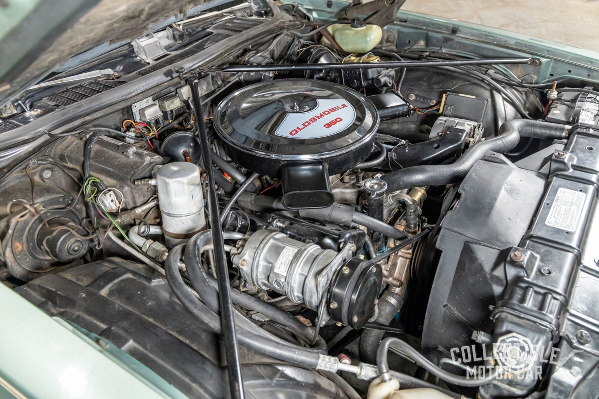 Open the hood to see a very honest and original engine bay. This is believed to be the numbers-matching 350 cubic-inch V8 with a four-barrel carb on top. The level of originality is seen everywhere, right down to the GM parts sticker on the factory air cleaner. But an affordable Olds like this is also the classic you want to drive. That's why you'll be happy that the V8 fires up easily and idles smoothly. Plus, with features like the three-speed automatic transmission, power steering, power brakes, and front discs, this survivor is an easy choice for your anytime classic.