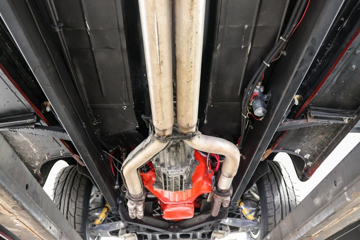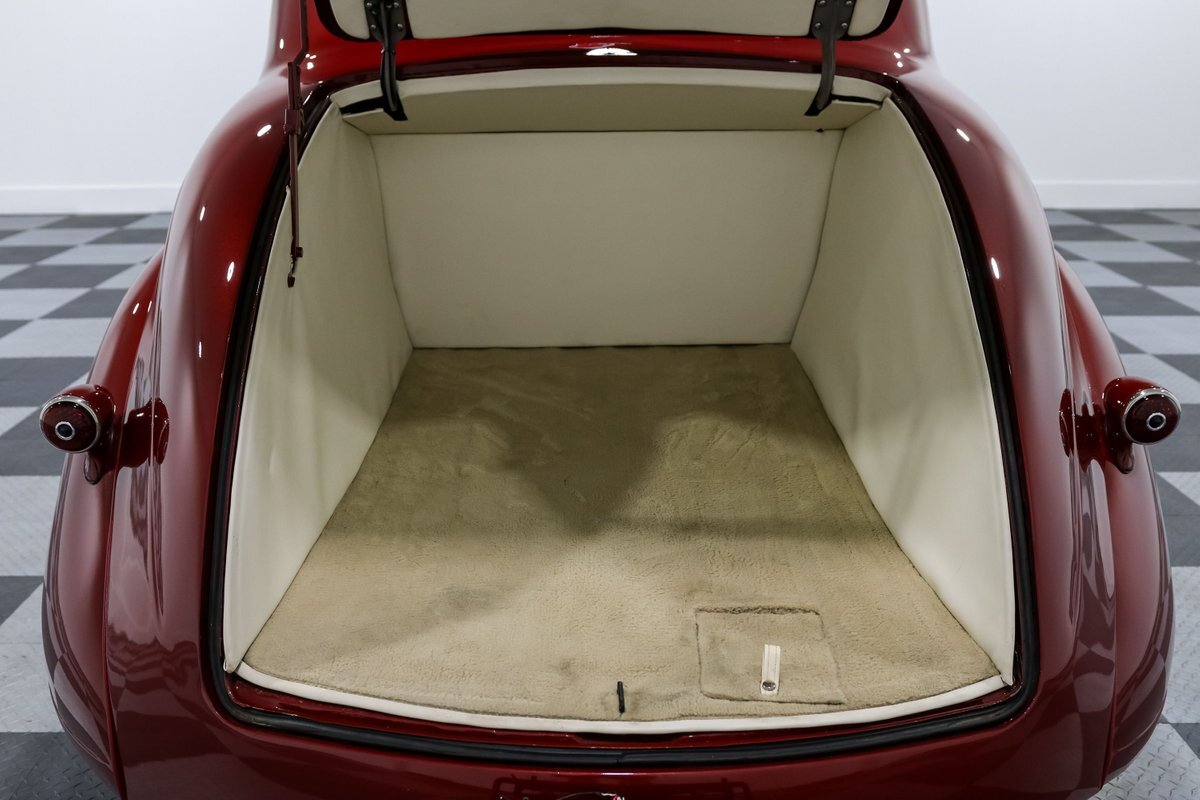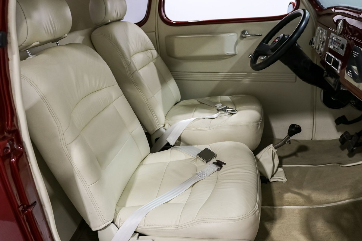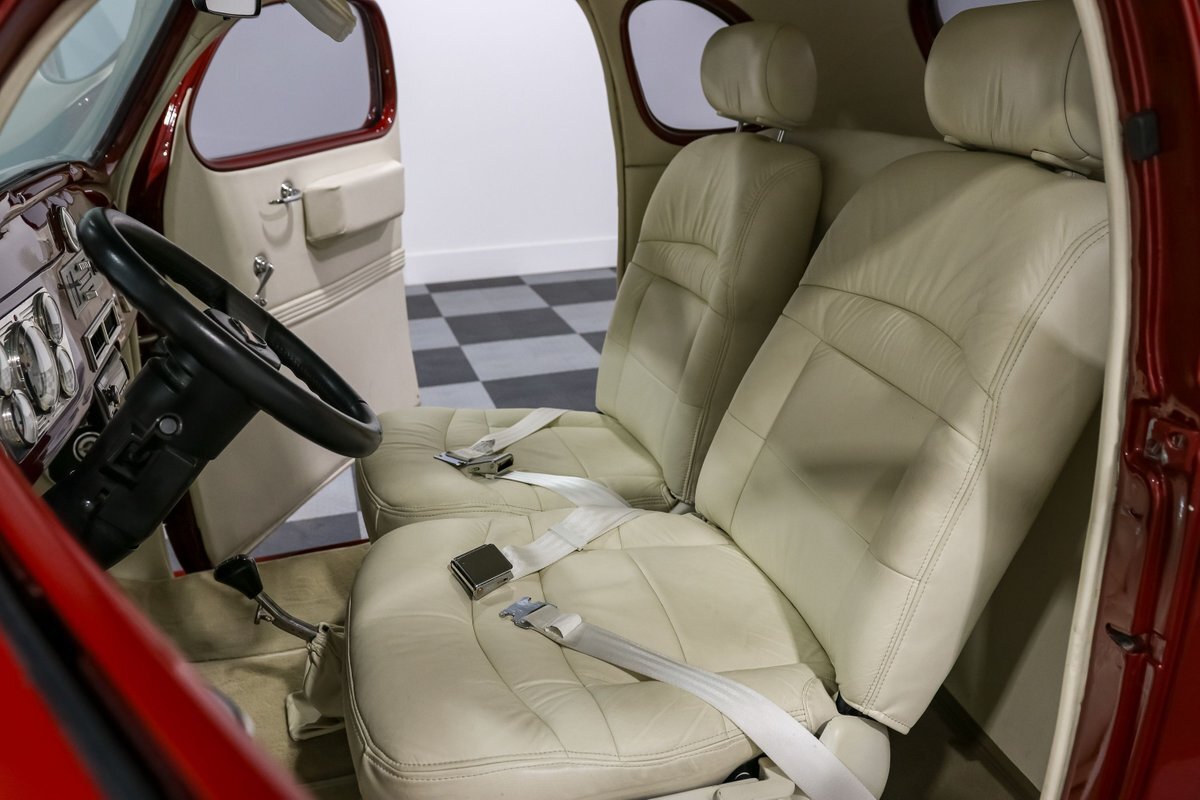 This 1938 Plymouth Coupe isn't just about looks; it's built on a C4 Corvette chassis, providing a rock-solid foundation and exceptional handling. The independent front and rear suspension, coupled with rack and pinion steering, ensures that this beauty drives as well as it looks. Long tube headers and dual exhausts not only enhance performance but also deliver that unmistakable V8 growl. The polished Edelbrock intake and carburetor, along with aluminum finned valve covers, highlight the engine bay with a touch of shine and sophistication.