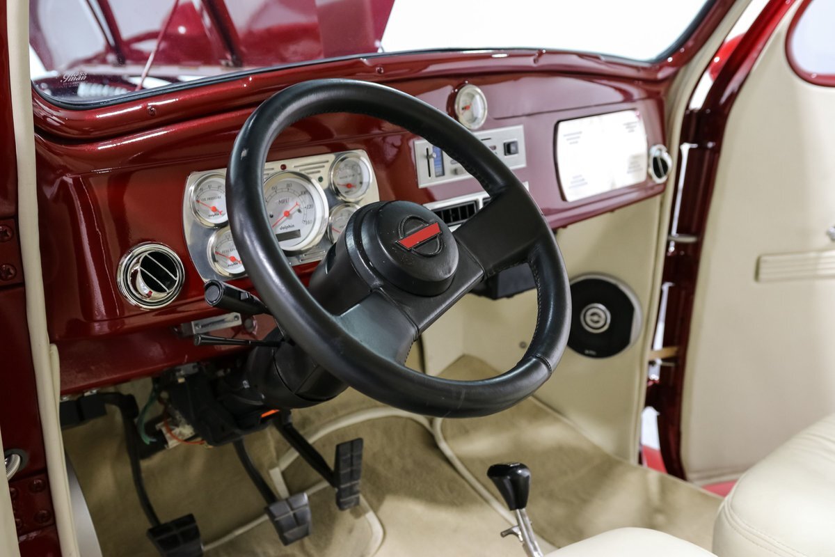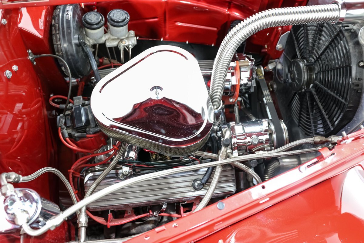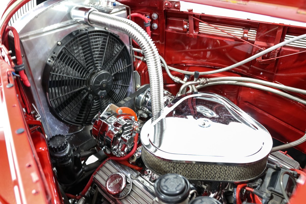 The exterior is finished with shaved door handles and custom mirrors, giving the car a sleek and modern look. The 17-inch aluminum wheels and four-wheel disc brakes ensure that this street rod stops on a dime and handles corners with ease. The aluminum radiator with an electric fan keeps the engine cool, even during spirited drives, while the electronic wiper conversion ensures clear visibility in all conditions.