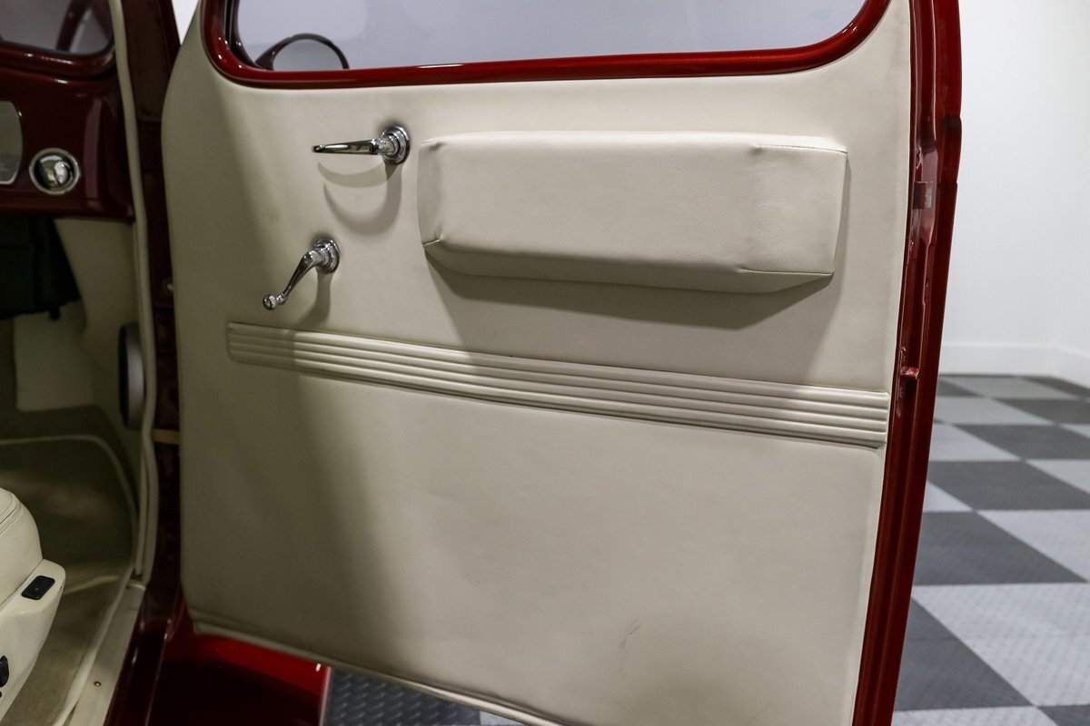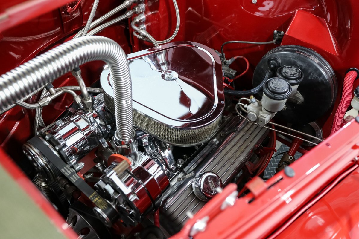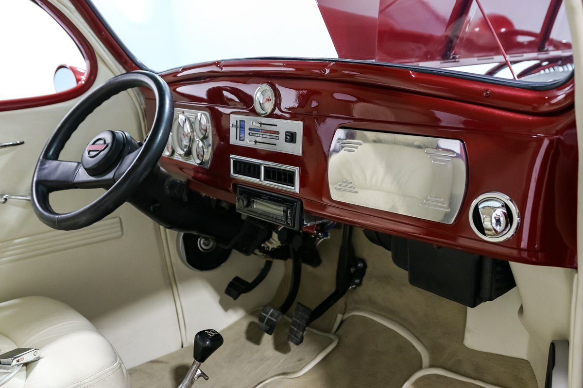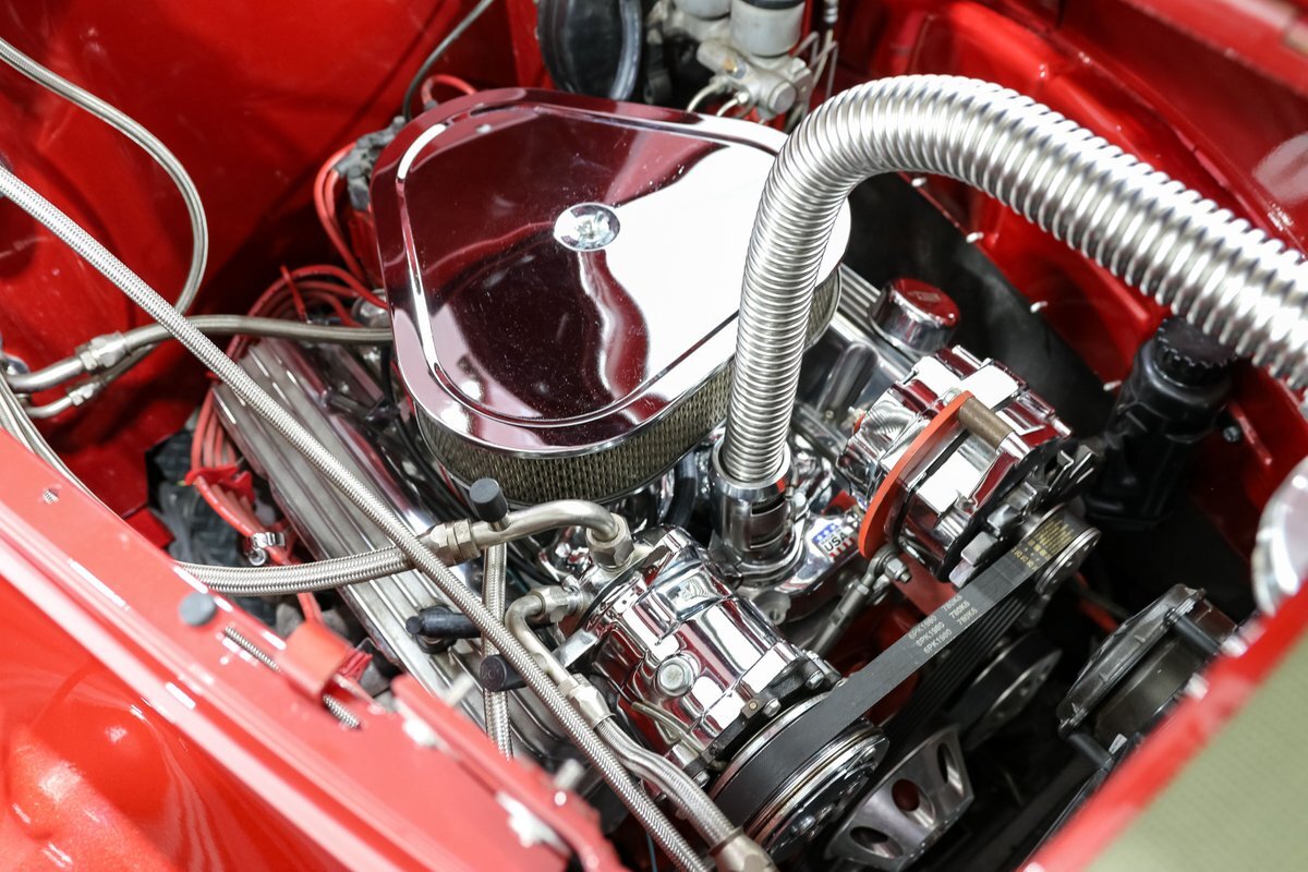 The exterior is finished with shaved door handles and custom mirrors, giving the car a sleek and modern look. The 17-inch aluminum wheels and four-wheel disc brakes ensure that this street rod stops on a dime and handles corners with ease. The aluminum radiator with an electric fan keeps the engine cool, even during spirited drives, while the electronic wiper conversion ensures clear visibility in all conditions.
