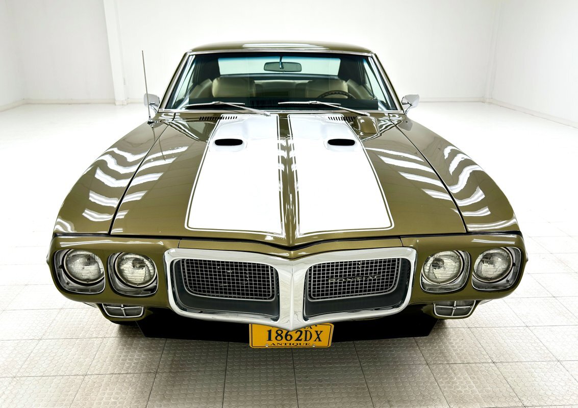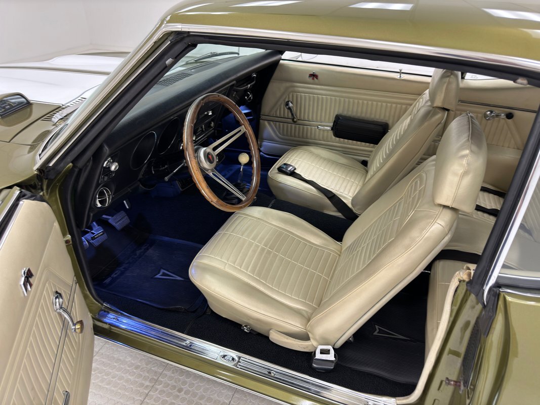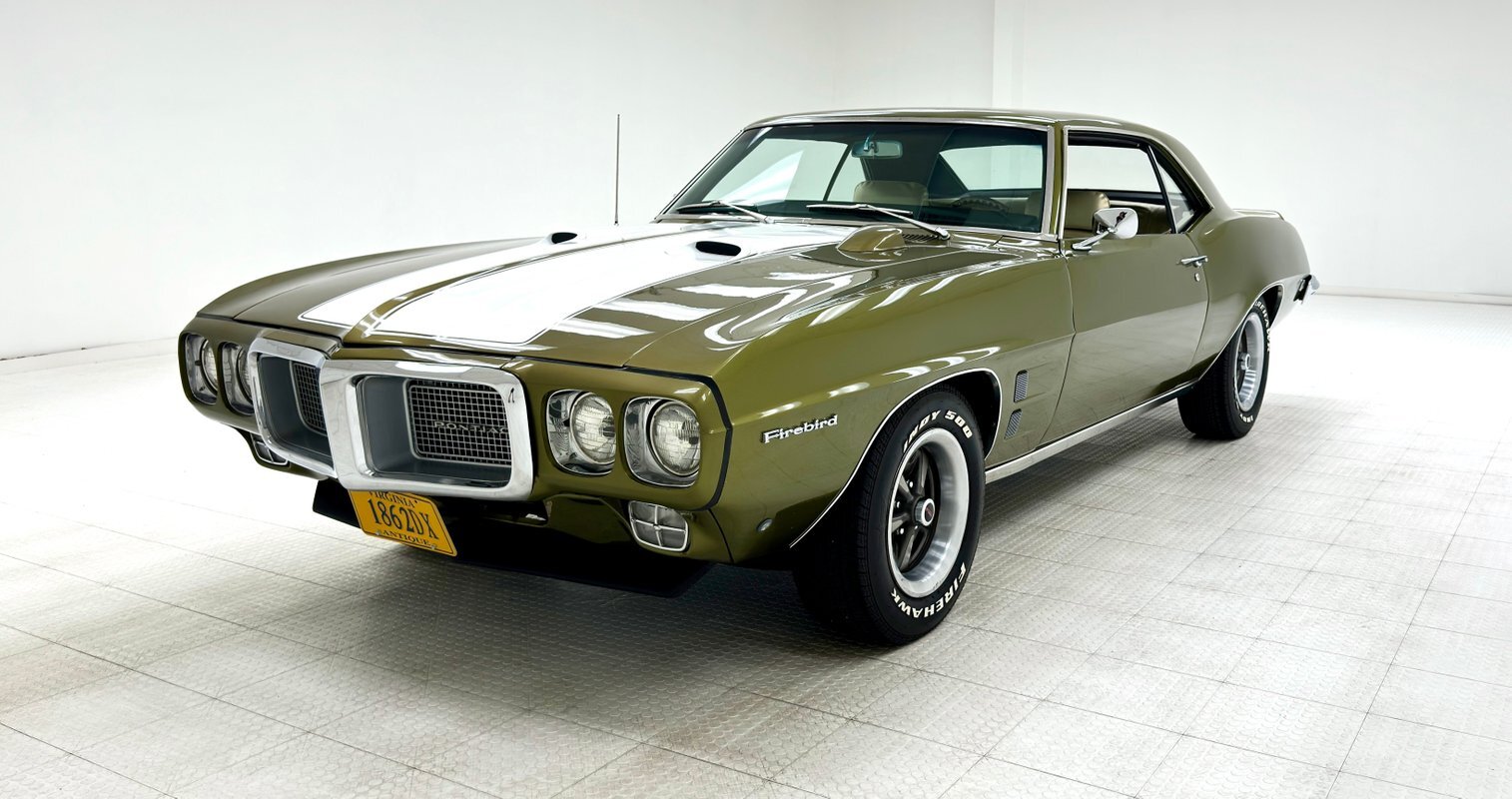For consignment, a 1969 Pontiac Firebird hardtop, restored in 2021 and possessing a title verified 41,205 actual miles. It's wearing a color we don't see often and the coordination of the white exterior stripes with the parchment interior is very nice.