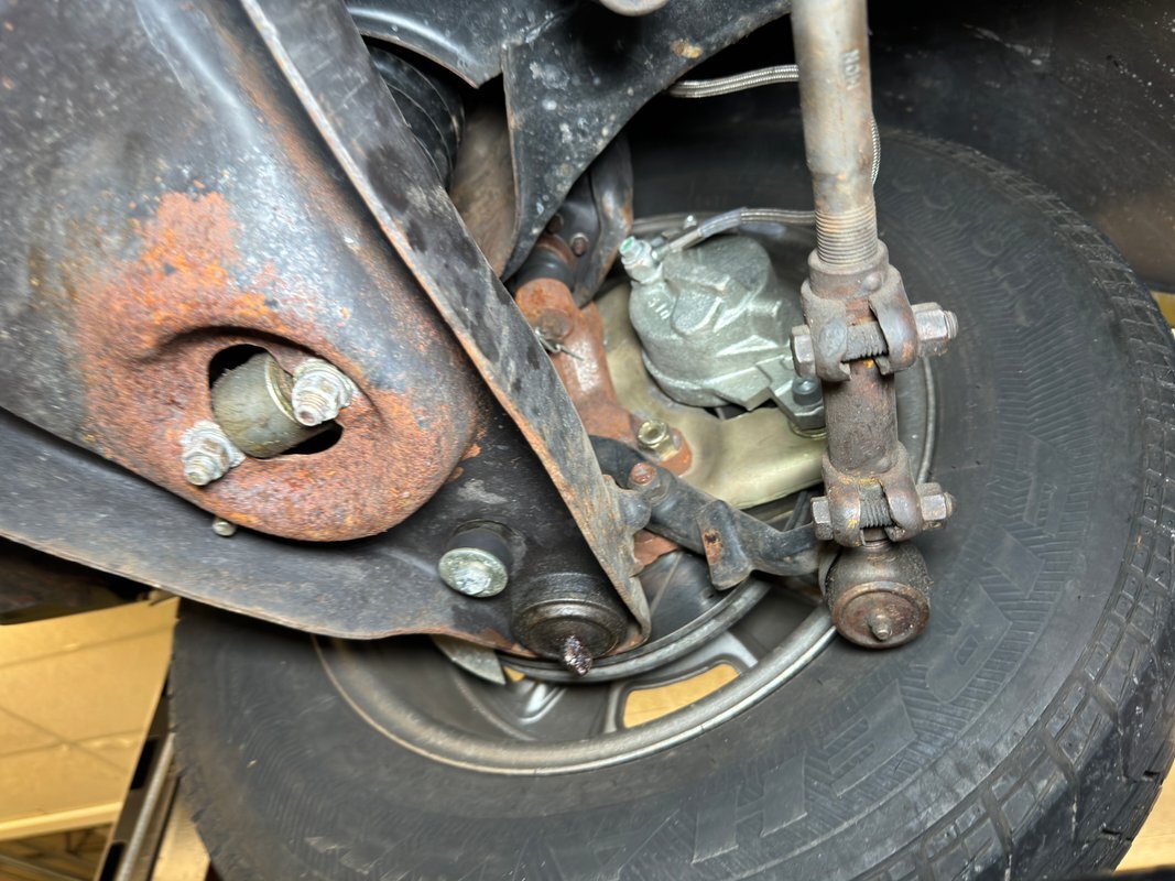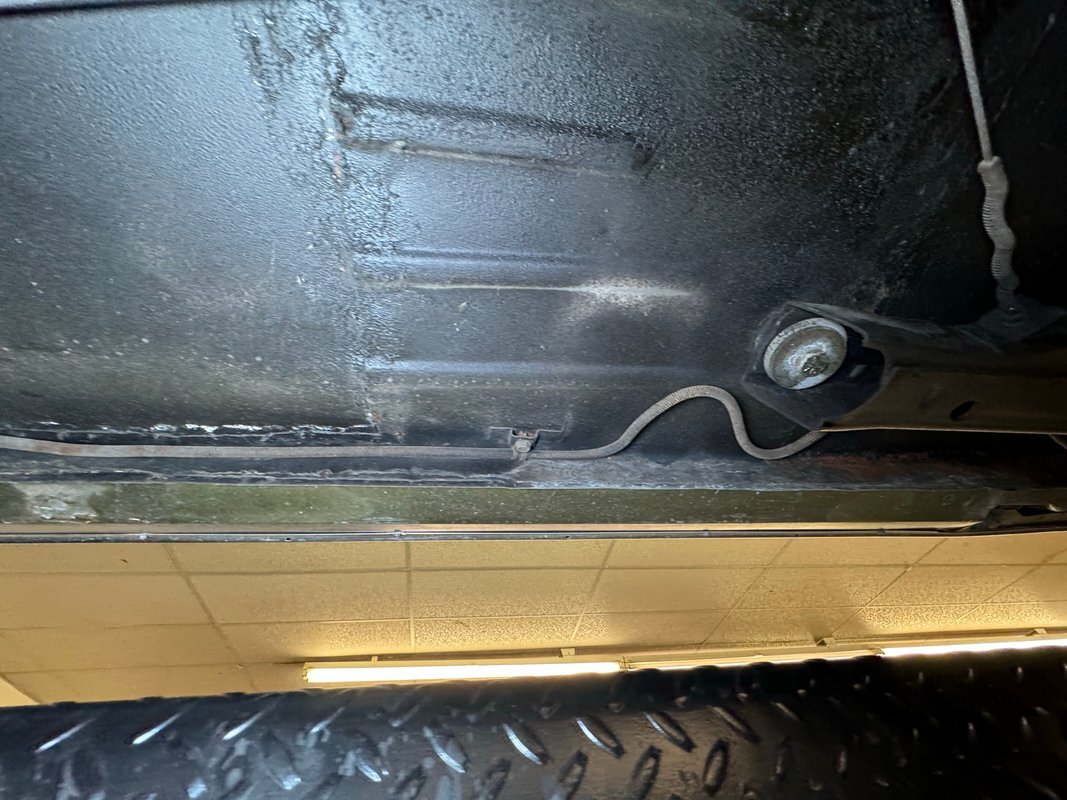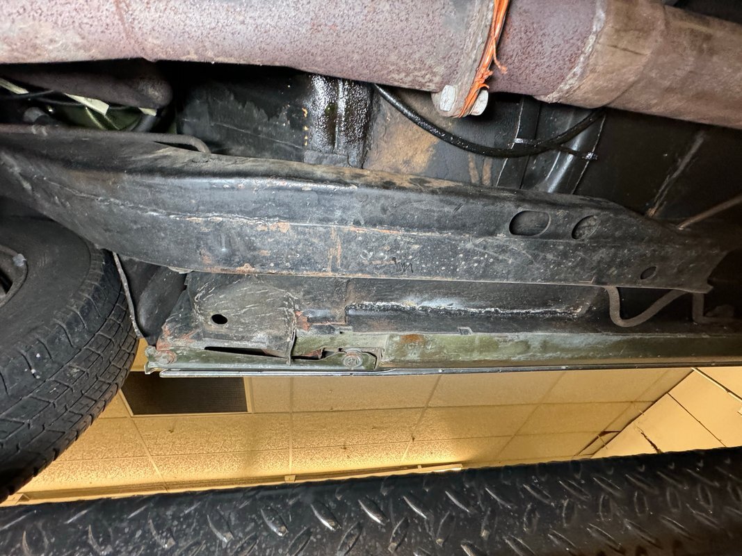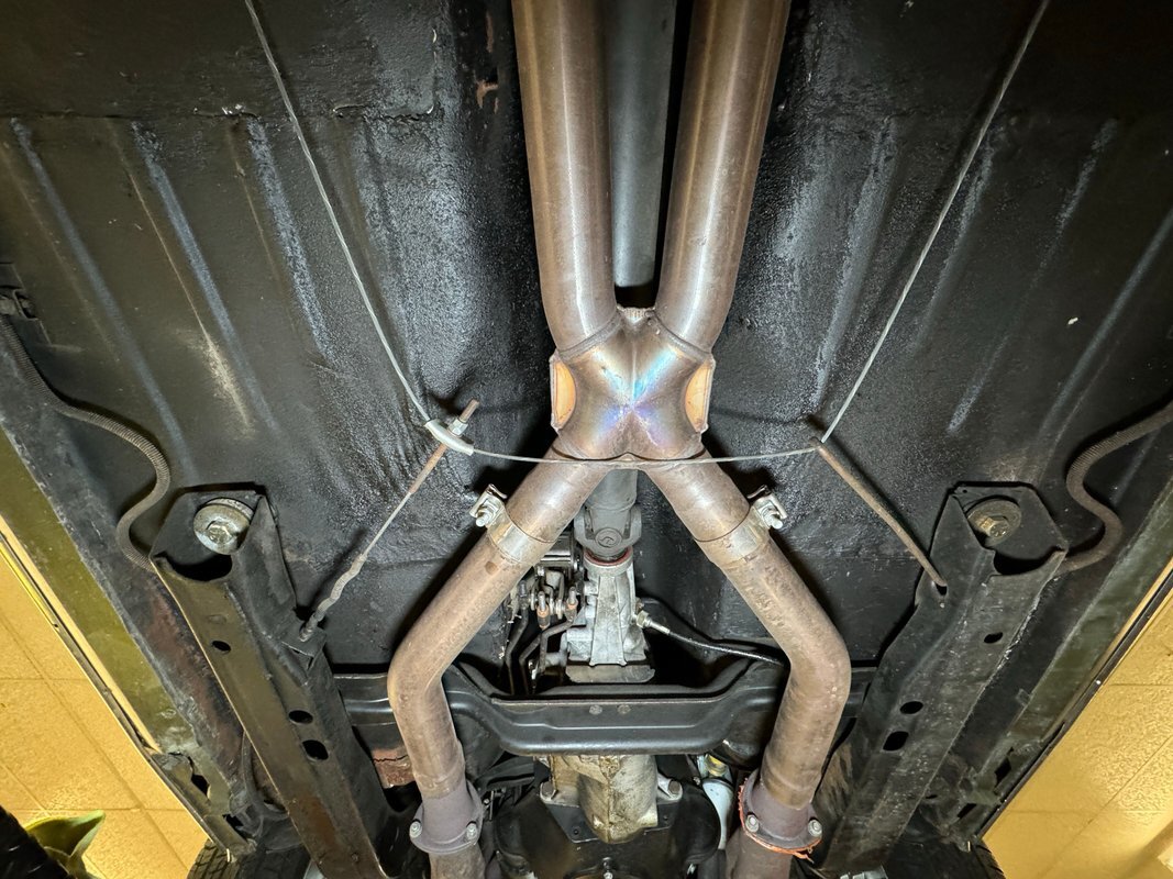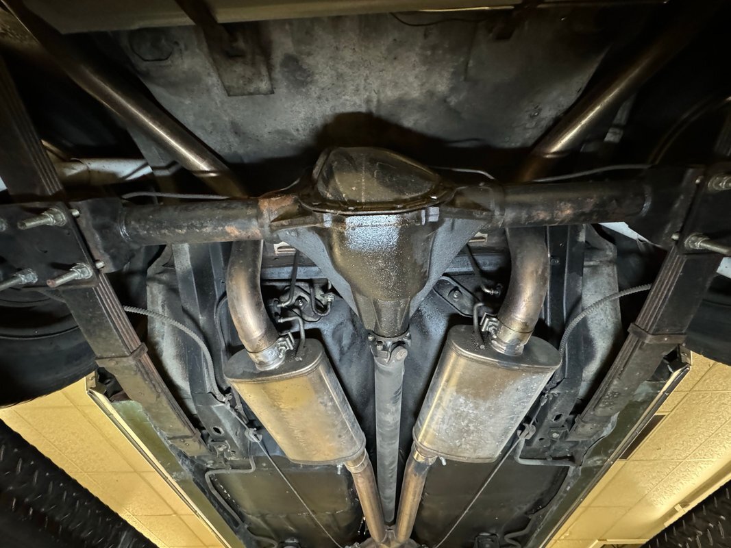 Clean underneath with no grease or grime. Surface rust is present on typical areas and some oil is seen on the rear differential, possibly from the pinion seal. Dual exhaust flows from headers to an X-pipe, then through a set of MagnaFlow mufflers before exiting unceremoniously with down-facing polished tips. Suspension is standard here with coil springs in front and leaf springs in the back.