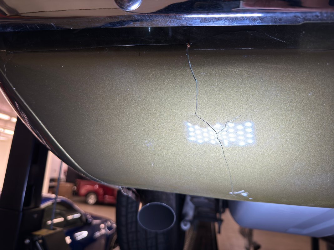 Two stage Brasilia Gold colors this car and can best be described as a greenish bronze. Pontiac's distinct split grille and center beak fronts this car, dual headlights and twin hood intake ducts create a symmetrical line, and a hood mounted tachometer breaks that up and creates interest. Fantastic white stripes race over the hood, skipping the roof, and then reconvene on the trunk lid and up and over the rear wing. The muscular tail continues with horizontal slit tail lights which differentiated the Pontiacs from Camaros and a Firebird emblem in Native American motif on the center further solidifies its identity. Another Firebird notable, fender vents behind the front wheel, in this case faux vents, but Firebirds would continue to go on to have functional vents in varying shapes and locations on the fender. 15-inch Pontiac Rally II wheels occupy the hubs and have PMD center caps. Overall, the paint and metal work are in beautiful condition. Imperfections noted include some unevenness where the roof meets window trim, a good amount of bubbling low on a fender, cracking paint on the rear valance, and some curb rash on a wheel.