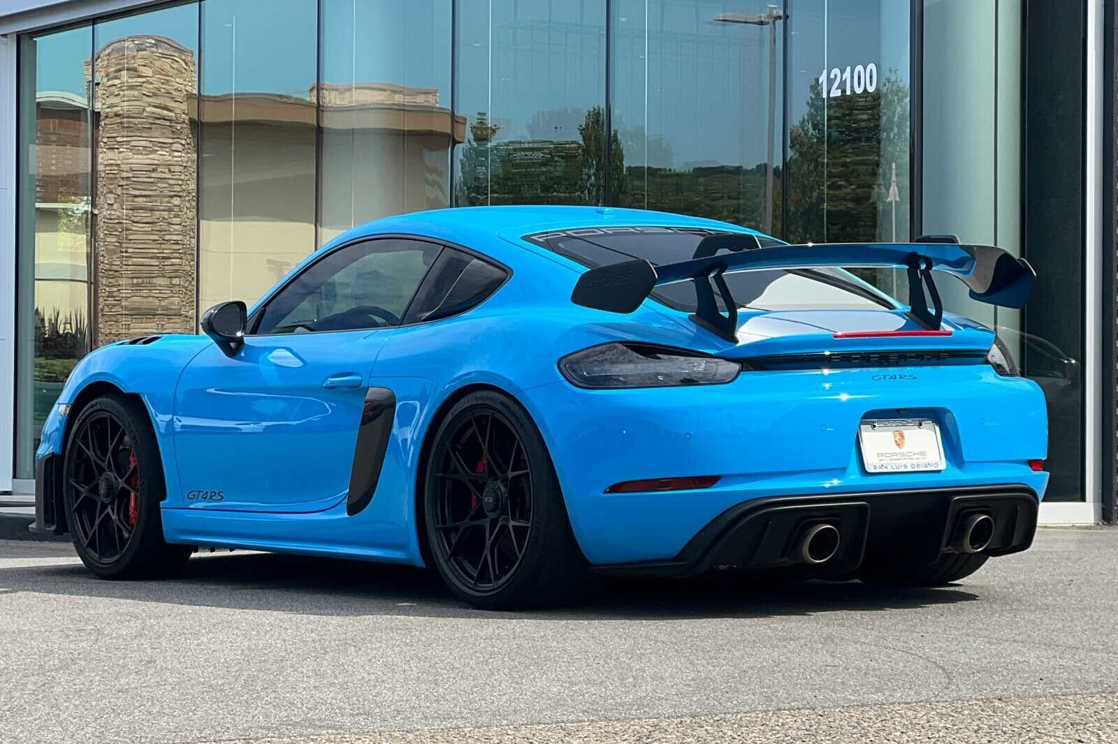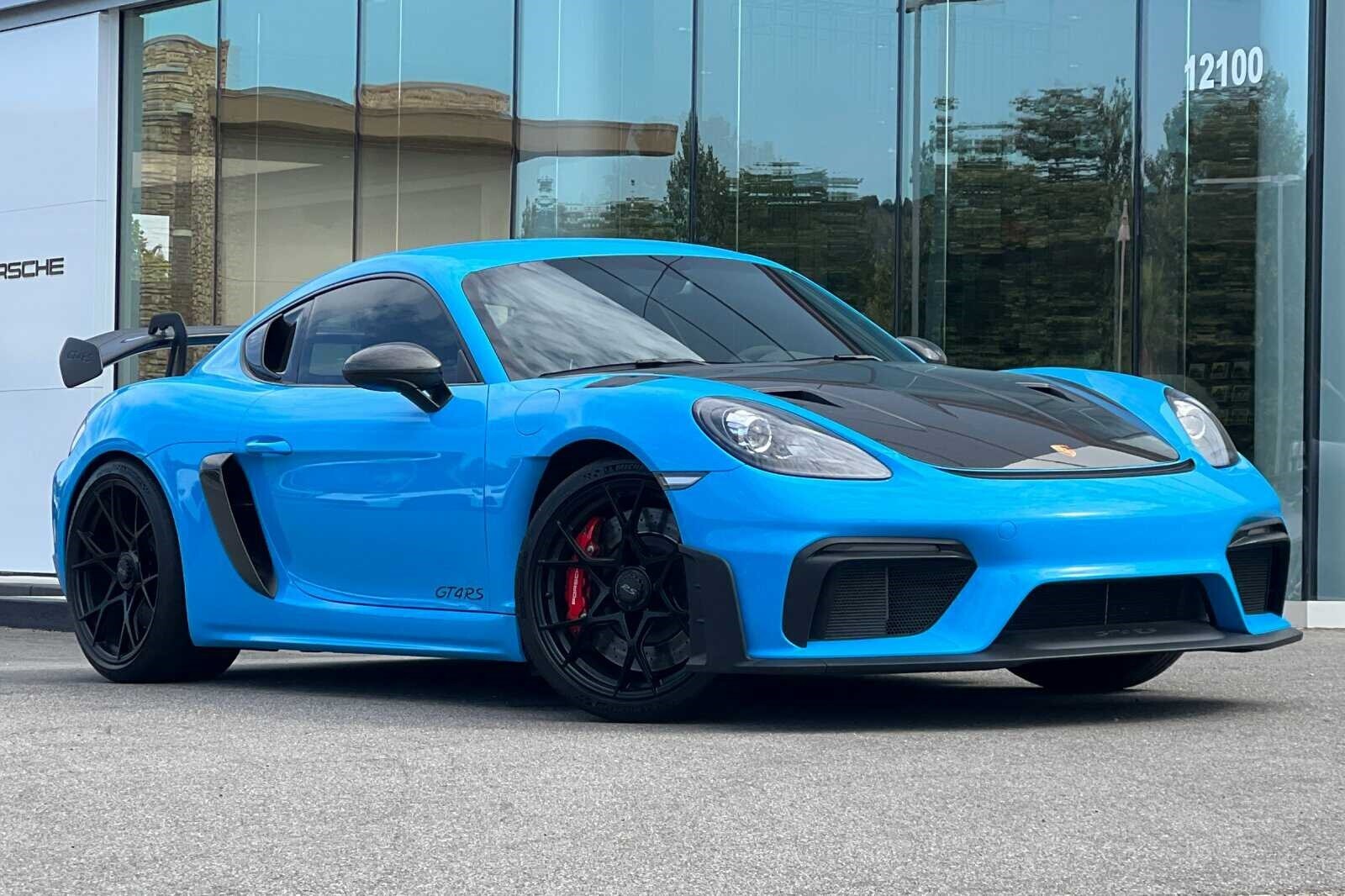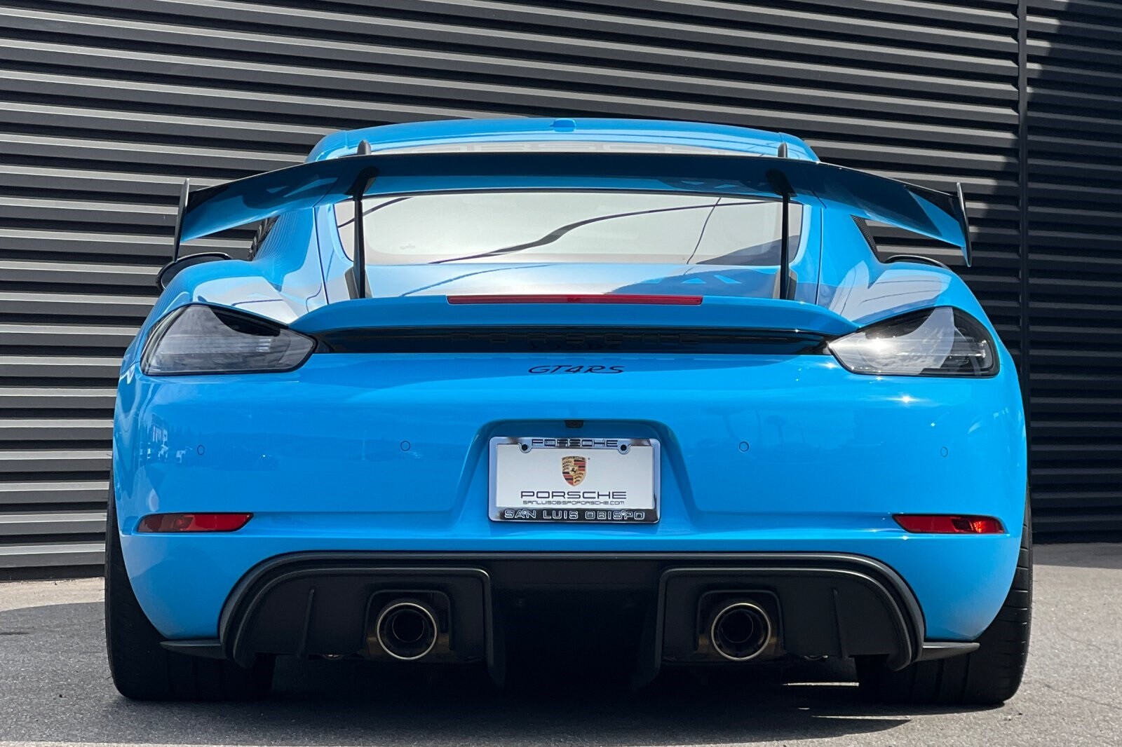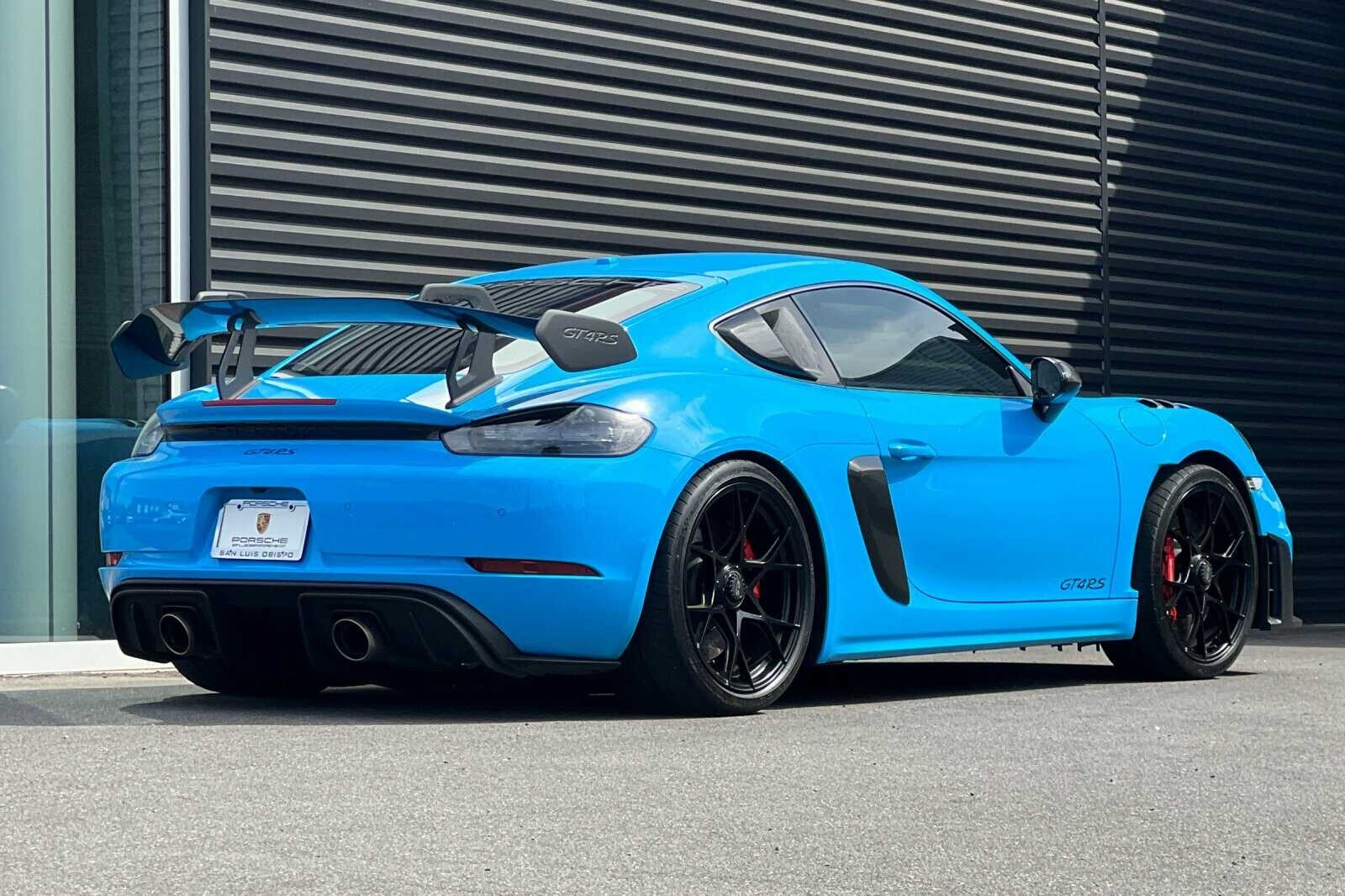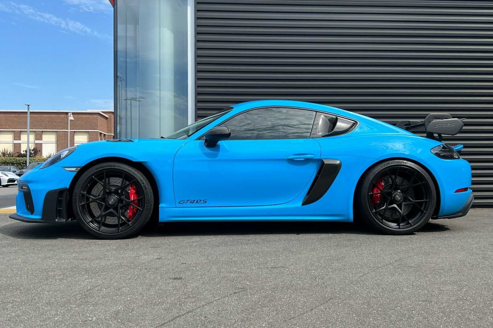 This Porsche San Luis Obispo 2023 Paint to Sample: Riviera Blue Porsche 718 Cayman GT4 RS RWD is well equipped and includes these features and benefits: Chrono Package, Weissach Package, Porsche Approved Certified Pre-Owned Certified, BOSE Surround Sound System, Front Axle Lift System, 4-Wheel Disc Brakes, 8 Speakers, ABS brakes, Adaptive suspension, Air Conditioning, Alloy wheels, AM/FM radio: SiriusXM, Apple CarPlay, Automatic temperature control, Brake assist, Bumpers: body-color, CD player, Delay-off headlights, Driver door bin, Driver vanity mirror, Dual front impact airbags, Dual front side impact airbags, DVD-Audio, Electronic Stability Control, Exterior Parking Camera Rear, Four wheel independent suspension, Front anti-roll bar, Front Bucket Seats, Front Center Armrest, Front dual zone A/C, Front reading lights, Full Bucket Seats, Fully automatic headlights, Garage door transmitter: HomeLink, Heated door mirrors, High intensity discharge headlights: Bi-Xenon, Illuminated entry, Knee airbag, Leather Seat Trim w/Race-Tex Seat Centers, Low tire pressure warning, Navigation System, Occupant sensing airbag, Outside temperature display, Overhead airbag, Passenger door bin, Passenger vanity mirror, Power door mirrors, Power driver seat, Power passenger seat, Power steering, Power windows, Radio data system, Radio: Navigation w/Porsche Connect, Rear anti-roll bar, Rear window defroster, Remote keyless entry, Security system, Speed control, Spoiler, Sport steering wheel, Tachometer, Telescoping steering wheel, Tilt steering wheel, Traction control, Trip computer, Variably intermittent wipers, and Wheels: 20 718 Cayman GT4 RS Forged Aluminum. BOSE Surround Sound System, Chrono Package, Front Axle Lift System, Weissach Package.
