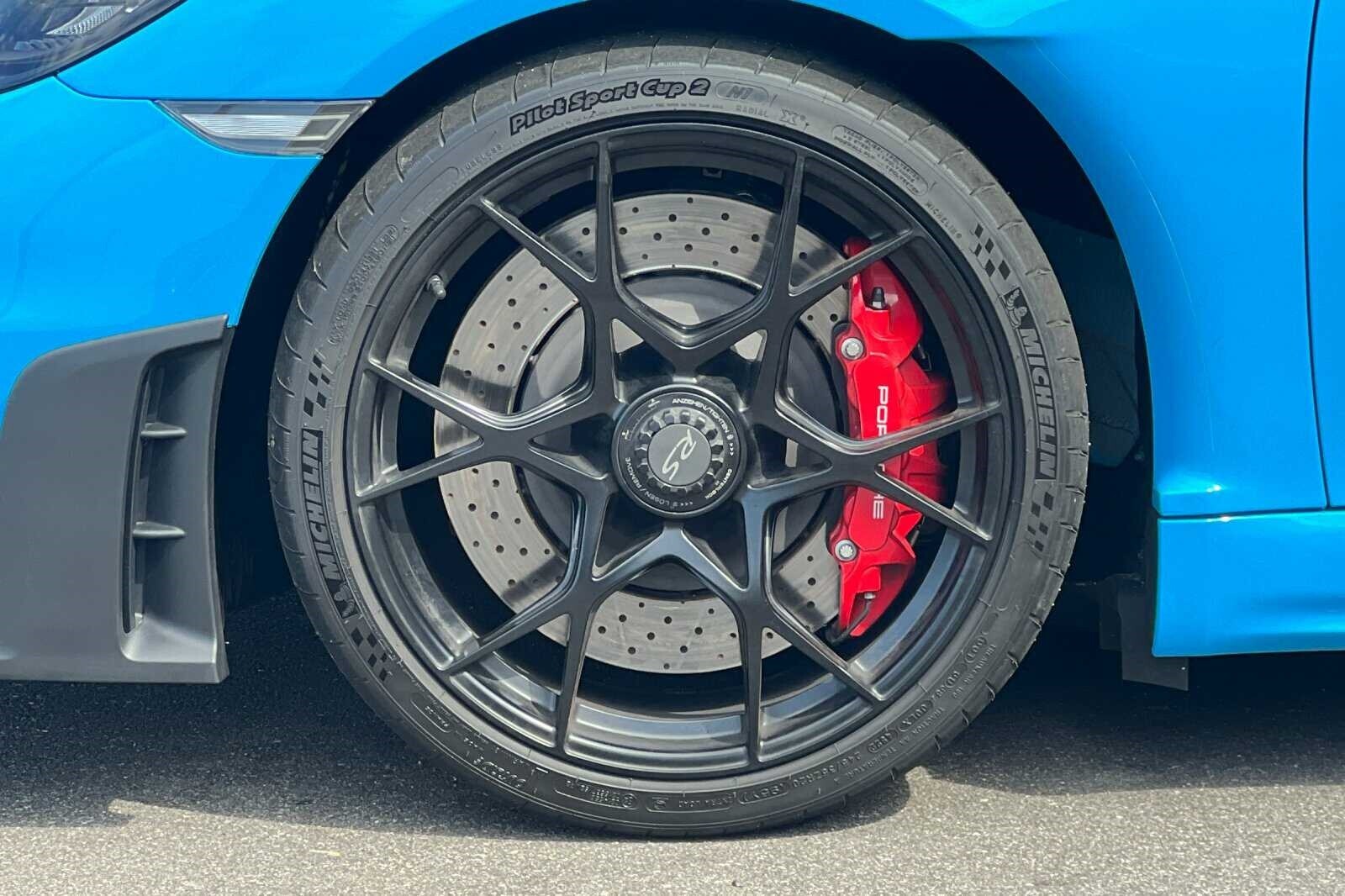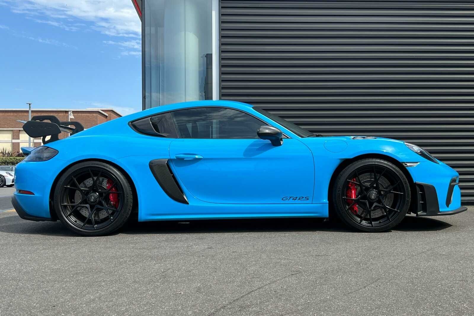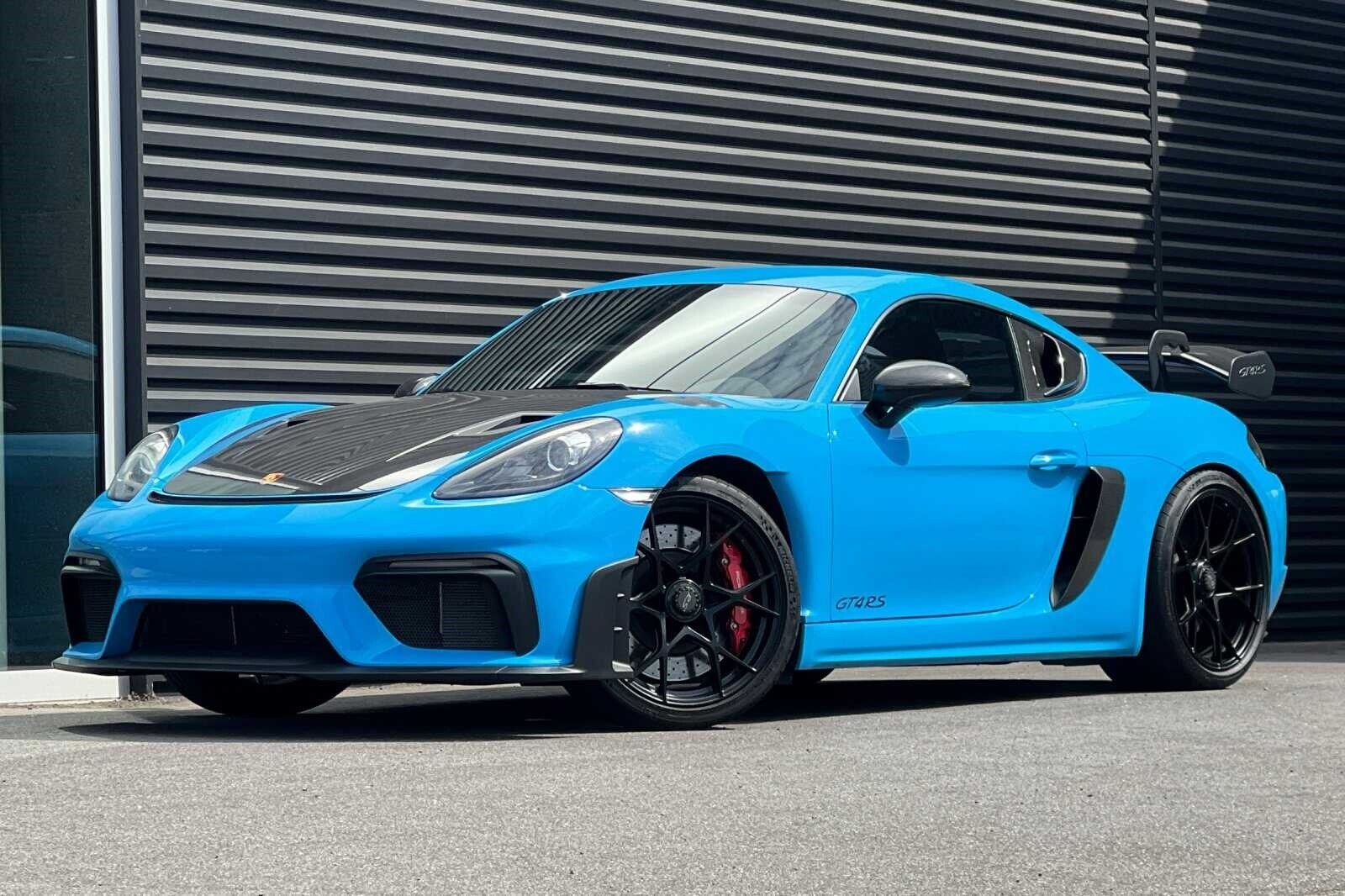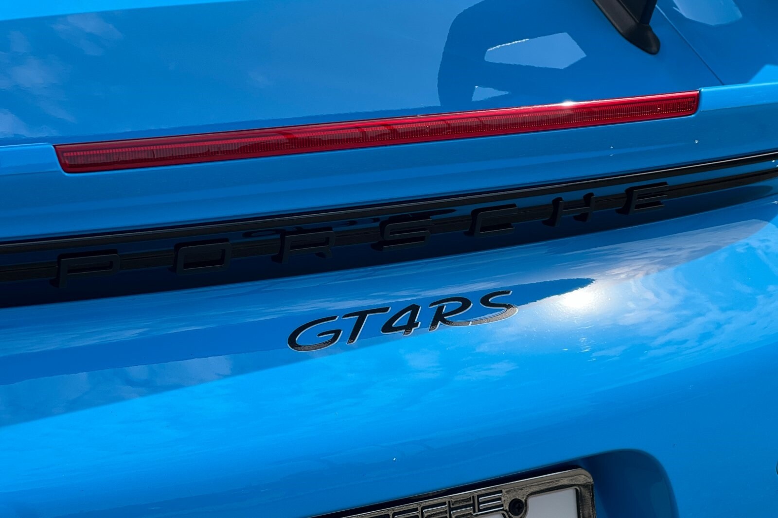 This Porsche San Luis Obispo 2023 Paint to Sample: Riviera Blue Porsche 718 Cayman GT4 RS RWD is well equipped and includes these features and benefits: Chrono Package, Weissach Package, Porsche Approved Certified Pre-Owned Certified, BOSE Surround Sound System, Front Axle Lift System, 4-Wheel Disc Brakes, 8 Speakers, ABS brakes, Adaptive suspension, Air Conditioning, Alloy wheels, AM/FM radio: SiriusXM, Apple CarPlay, Automatic temperature control, Brake assist, Bumpers: body-color, CD player, Delay-off headlights, Driver door bin, Driver vanity mirror, Dual front impact airbags, Dual front side impact airbags, DVD-Audio, Electronic Stability Control, Exterior Parking Camera Rear, Four wheel independent suspension, Front anti-roll bar, Front Bucket Seats, Front Center Armrest, Front dual zone A/C, Front reading lights, Full Bucket Seats, Fully automatic headlights, Garage door transmitter: HomeLink, Heated door mirrors, High intensity discharge headlights: Bi-Xenon, Illuminated entry, Knee airbag, Leather Seat Trim w/Race-Tex Seat Centers, Low tire pressure warning, Navigation System, Occupant sensing airbag, Outside temperature display, Overhead airbag, Passenger door bin, Passenger vanity mirror, Power door mirrors, Power driver seat, Power passenger seat, Power steering, Power windows, Radio data system, Radio: Navigation w/Porsche Connect, Rear anti-roll bar, Rear window defroster, Remote keyless entry, Security system, Speed control, Spoiler, Sport steering wheel, Tachometer, Telescoping steering wheel, Tilt steering wheel, Traction control, Trip computer, Variably intermittent wipers, and Wheels: 20 718 Cayman GT4 RS Forged Aluminum. BOSE Surround Sound System, Chrono Package, Front Axle Lift System, Weissach Package.