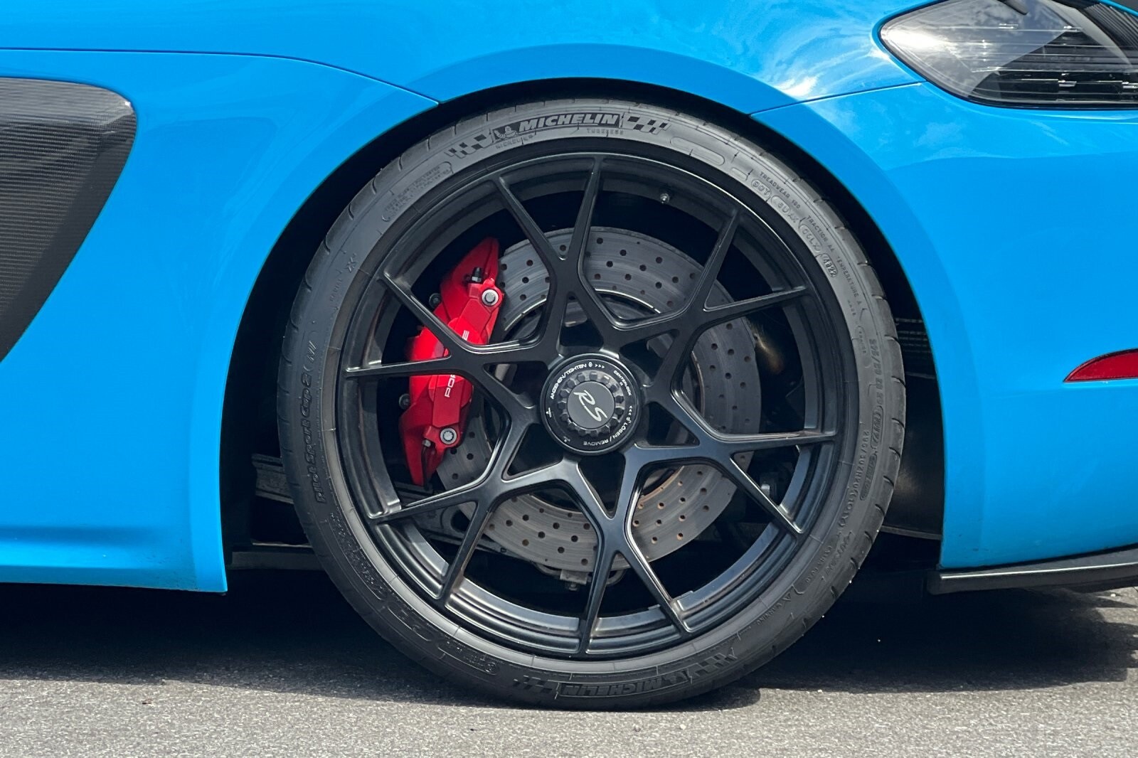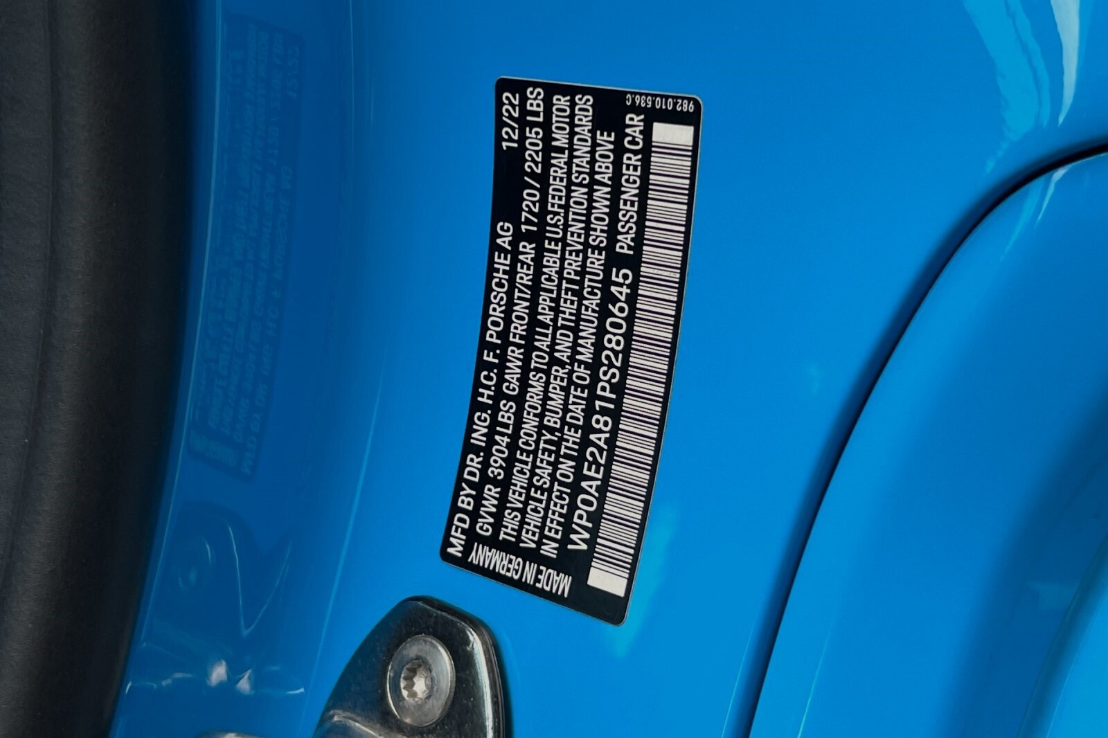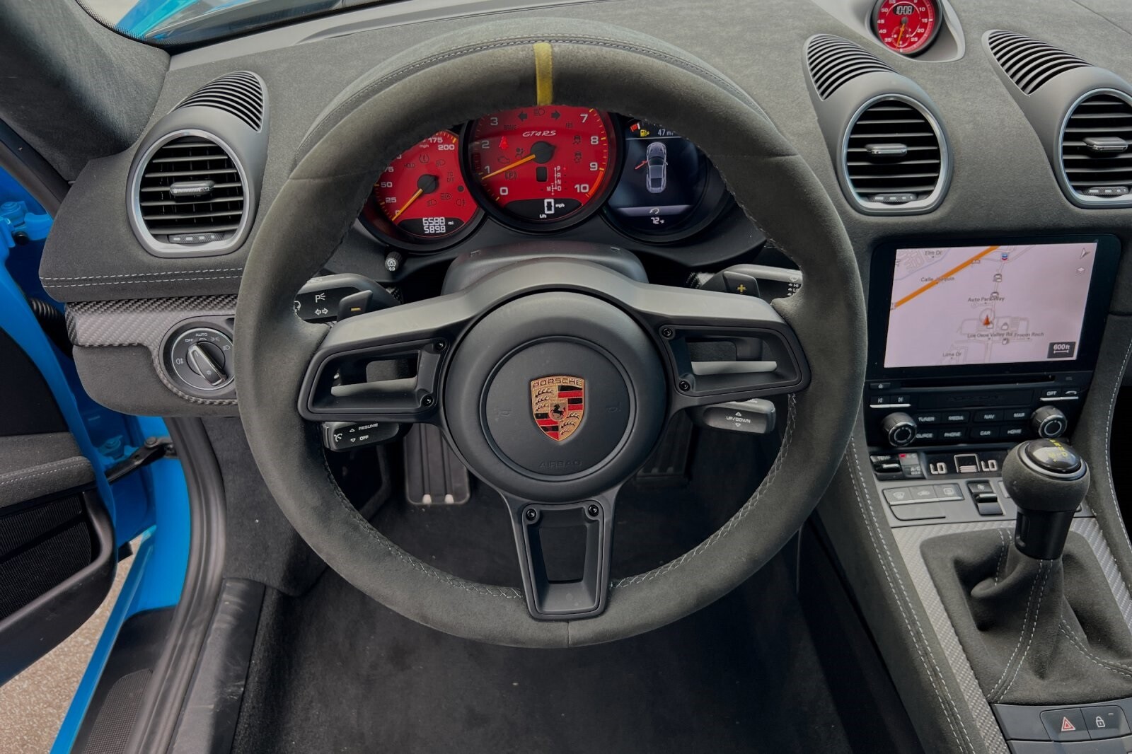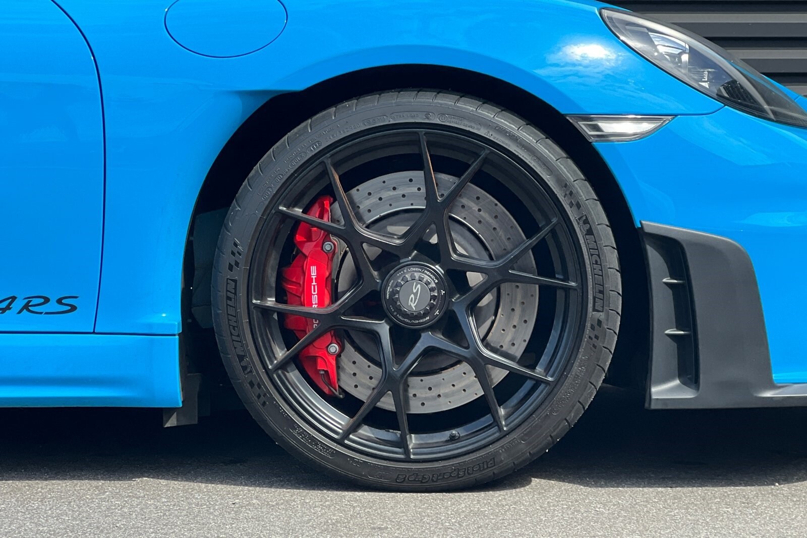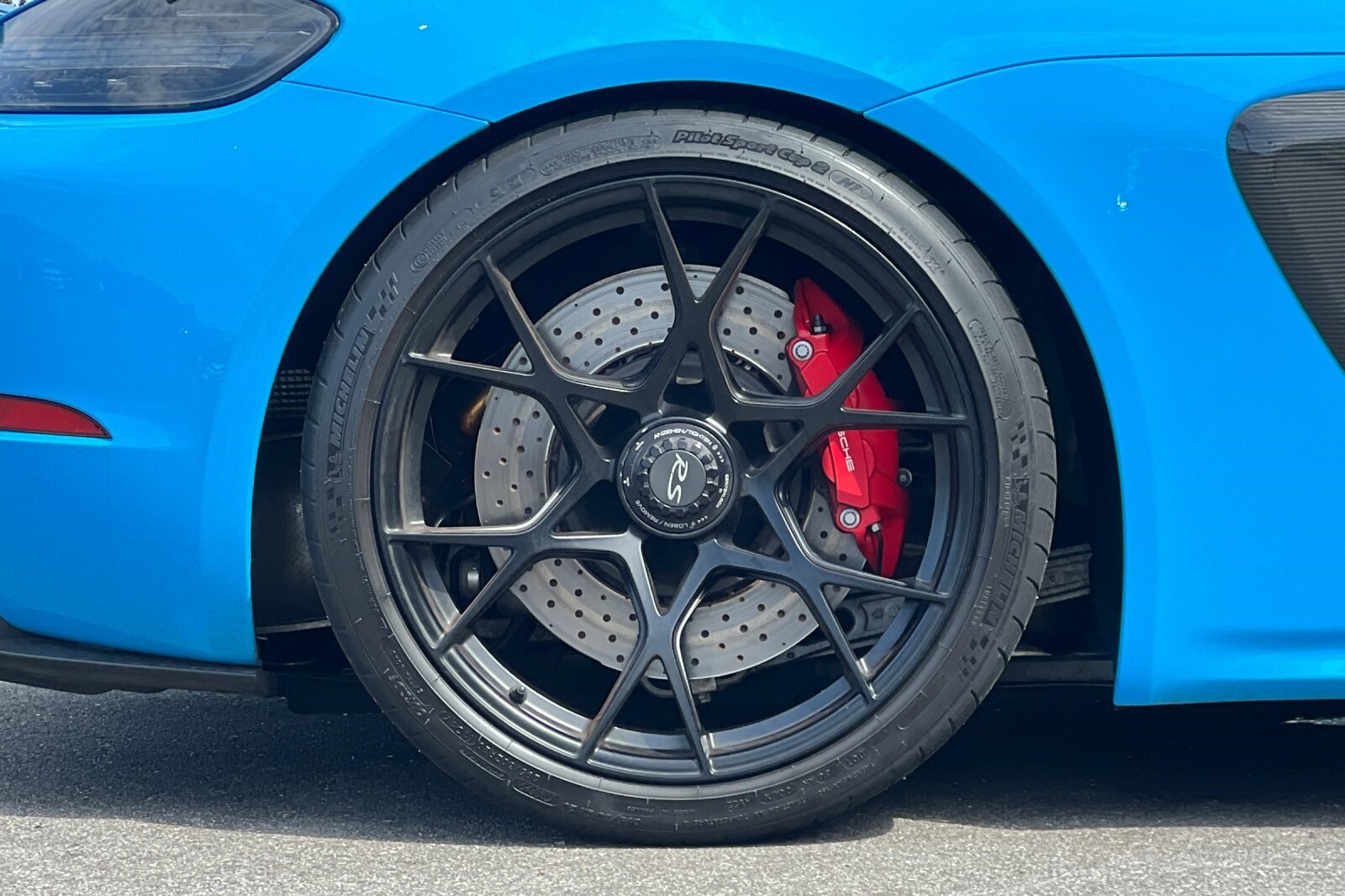 This Porsche San Luis Obispo 2023 Paint to Sample: Riviera Blue Porsche 718 Cayman GT4 RS RWD is well equipped and includes these features and benefits: Chrono Package, Weissach Package, Porsche Approved Certified Pre-Owned Certified, BOSE Surround Sound System, Front Axle Lift System, 4-Wheel Disc Brakes, 8 Speakers, ABS brakes, Adaptive suspension, Air Conditioning, Alloy wheels, AM/FM radio: SiriusXM, Apple CarPlay, Automatic temperature control, Brake assist, Bumpers: body-color, CD player, Delay-off headlights, Driver door bin, Driver vanity mirror, Dual front impact airbags, Dual front side impact airbags, DVD-Audio, Electronic Stability Control, Exterior Parking Camera Rear, Four wheel independent suspension, Front anti-roll bar, Front Bucket Seats, Front Center Armrest, Front dual zone A/C, Front reading lights, Full Bucket Seats, Fully automatic headlights, Garage door transmitter: HomeLink, Heated door mirrors, High intensity discharge headlights: Bi-Xenon, Illuminated entry, Knee airbag, Leather Seat Trim w/Race-Tex Seat Centers, Low tire pressure warning, Navigation System, Occupant sensing airbag, Outside temperature display, Overhead airbag, Passenger door bin, Passenger vanity mirror, Power door mirrors, Power driver seat, Power passenger seat, Power steering, Power windows, Radio data system, Radio: Navigation w/Porsche Connect, Rear anti-roll bar, Rear window defroster, Remote keyless entry, Security system, Speed control, Spoiler, Sport steering wheel, Tachometer, Telescoping steering wheel, Tilt steering wheel, Traction control, Trip computer, Variably intermittent wipers, and Wheels: 20 718 Cayman GT4 RS Forged Aluminum. BOSE Surround Sound System, Chrono Package, Front Axle Lift System, Weissach Package.