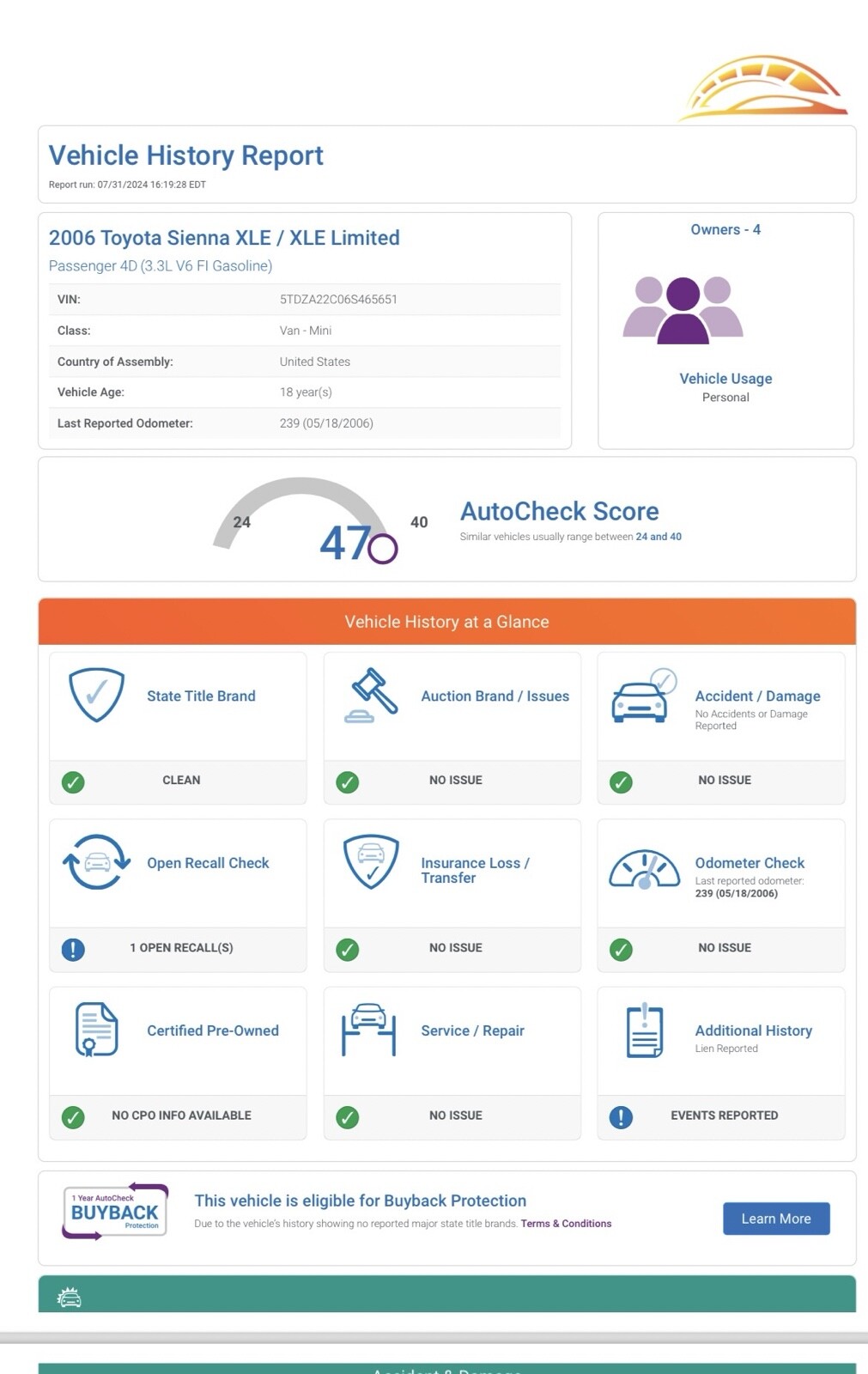 2006 Toyota Sienna 4D Passenger Van needs work .