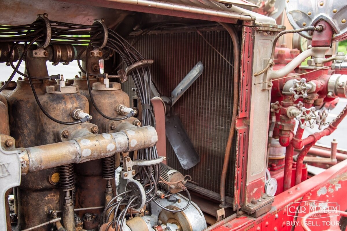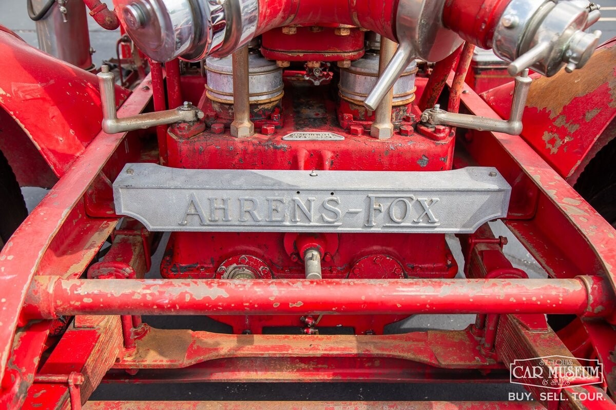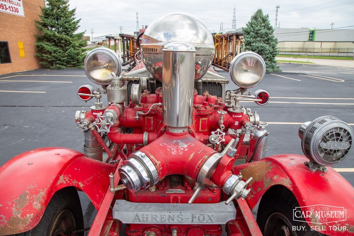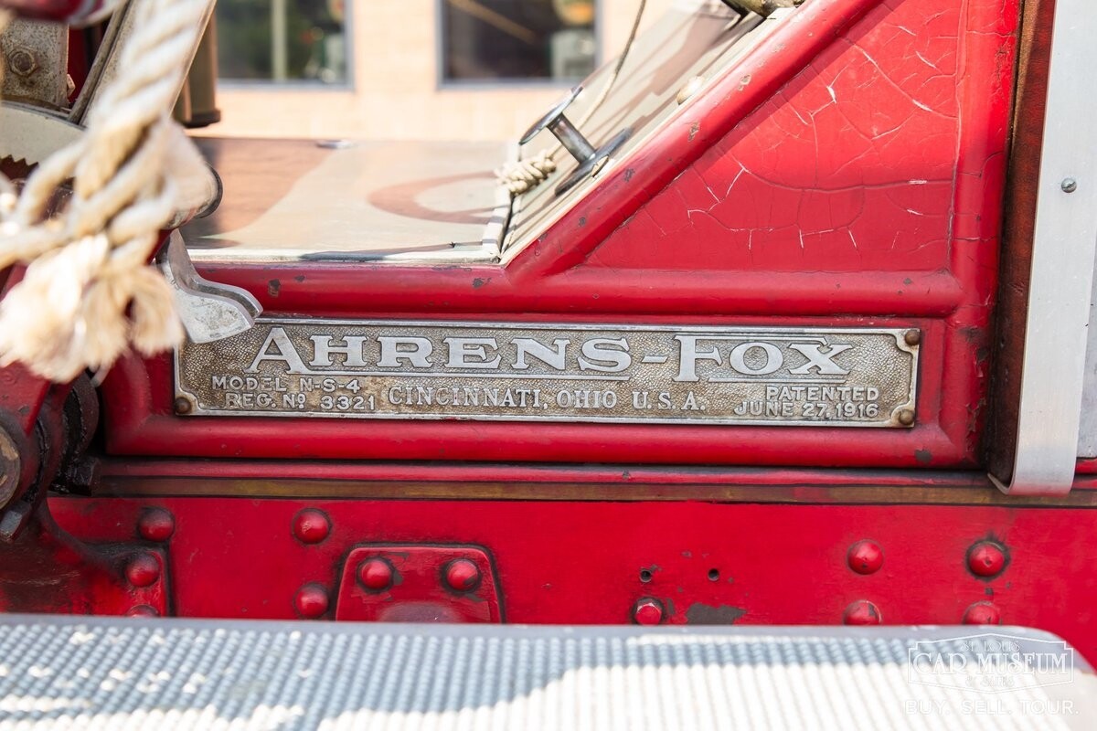 The super original example offered here is a 1928 Ahrens-Fox N-S-4 triple combination pumper powered by a 998ci T-Head 6-cylinder Super Power engine with dual exhaust valves producing 110 horsepower. It retains its Register No. 3321 identification body tags and was rated with a 1000gpm flow rate when in use. For extra starting reliability in all conditions, the factory electrical system consists of a Delco Magneto and Bosch distributor. It also features traditional right-hand-drive controls, 3-speed manual transmission, 40-gallon fuel tank, front & rear solid axles with leaf springs, and mechanical drum brakes. Apparatus equipment still retained on our well survived N-S-4 include two extension ladders, correct Ryan-Lite heads lights, forward-mounted Sterling electric siren, 12" chrome hand bell, hose bin & reel, onboard water/chemical tank, 2.5" hose, under hood service light & oiling can, 2 standard fire extinguishers (Rough-Riders), 2 small extinguishers, 2 large diameter hose hook-ups, 1 screened pick up, 4 spray nozzles, 1 spear pick, 1 pry bar, and more connections and spare pieces in the storage bins including period hand tools.