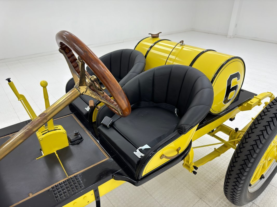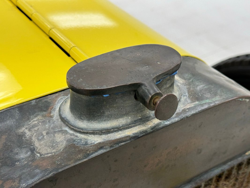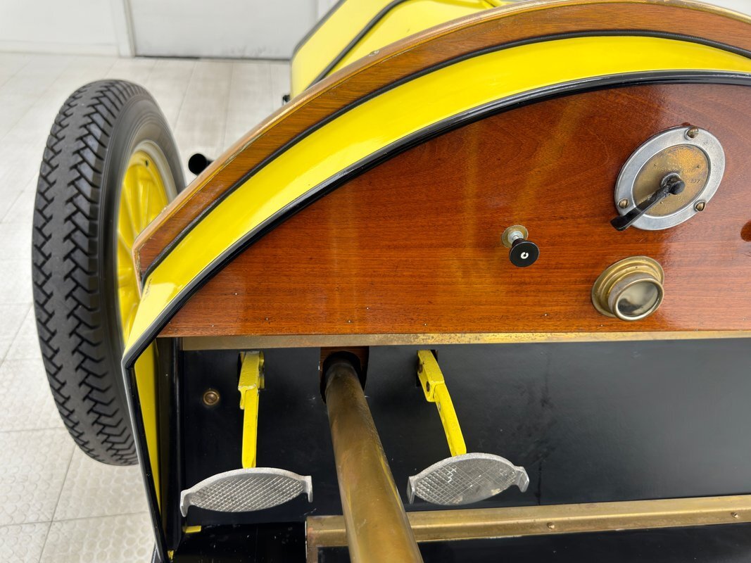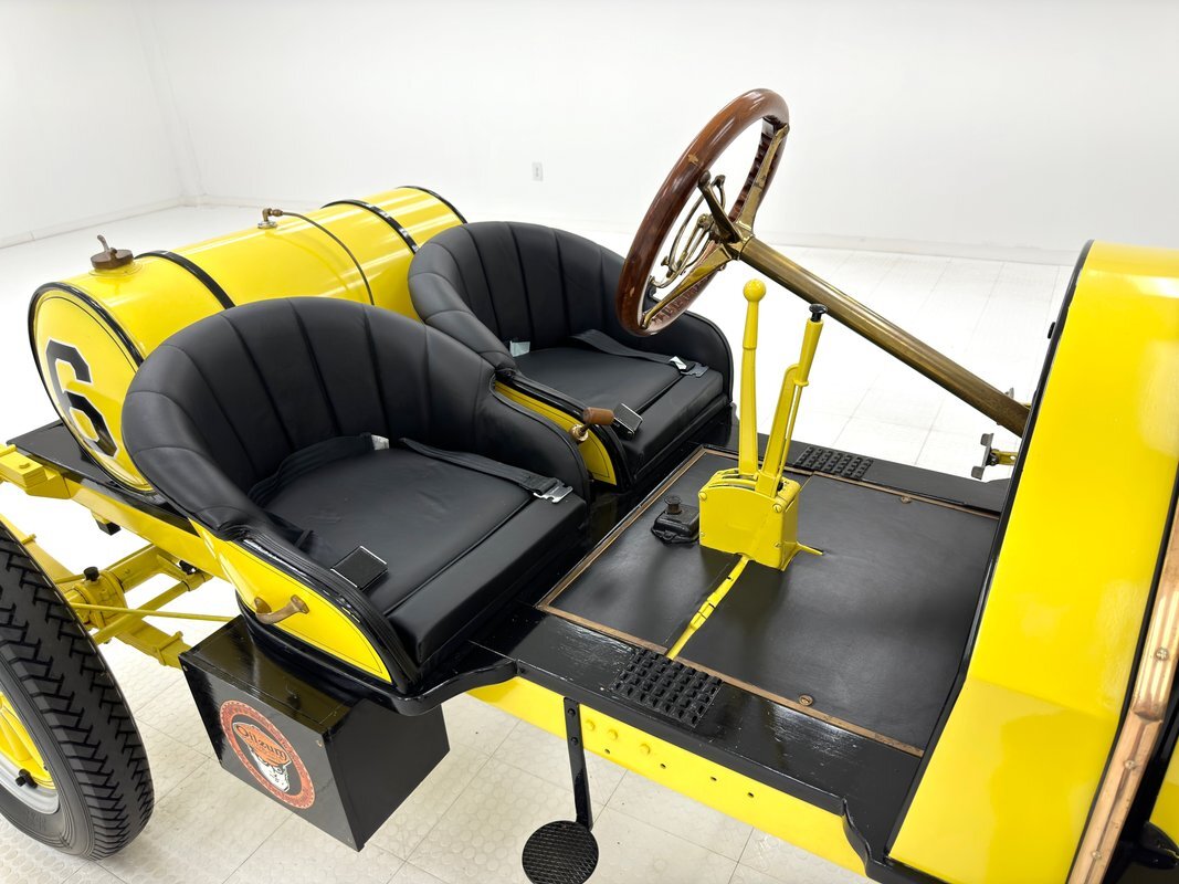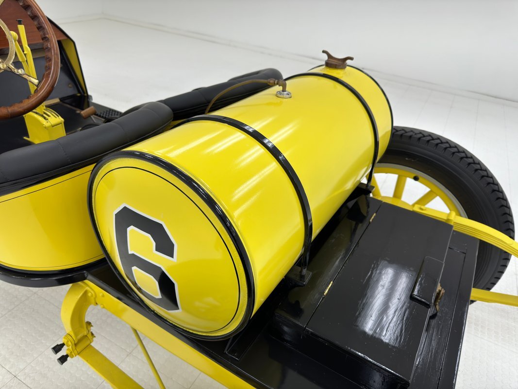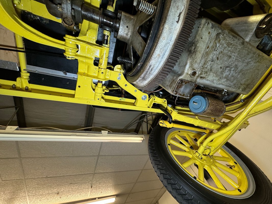 Think of a flat platform and then add wheels below, an engine on top, throw a couple of seats up there along with a gas tank and you essentially have a racer that is light due to its sparsity and purposeful in its construction. Frame, axles, 35-inch wood spoke wheels, engine cover, gas tank, and seat shells are all painted a bright yellow which contrasts well with most other features that are black. Each spoke has decorative black accents and a black number six is on each side of the gas tank and is also seen in the mesh grille up front. A black leather strap holds down the engine cover which rises above black exhaust pipes on one side. Glossy black covers a small wooden trunk in back and a vintage Oilzum decal dresses up the battery box below. The brass radiator shell has tarnished but beyond that, the exterior presentation is just about flawless.