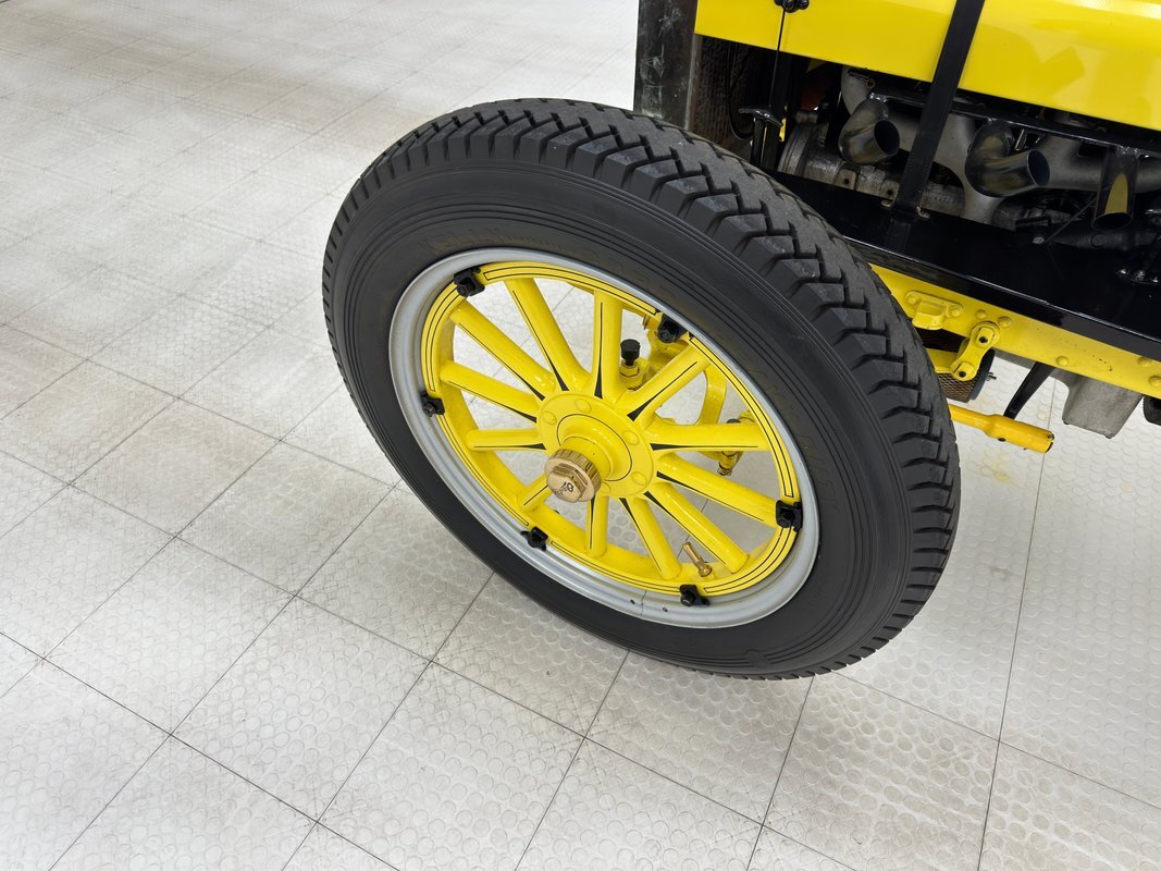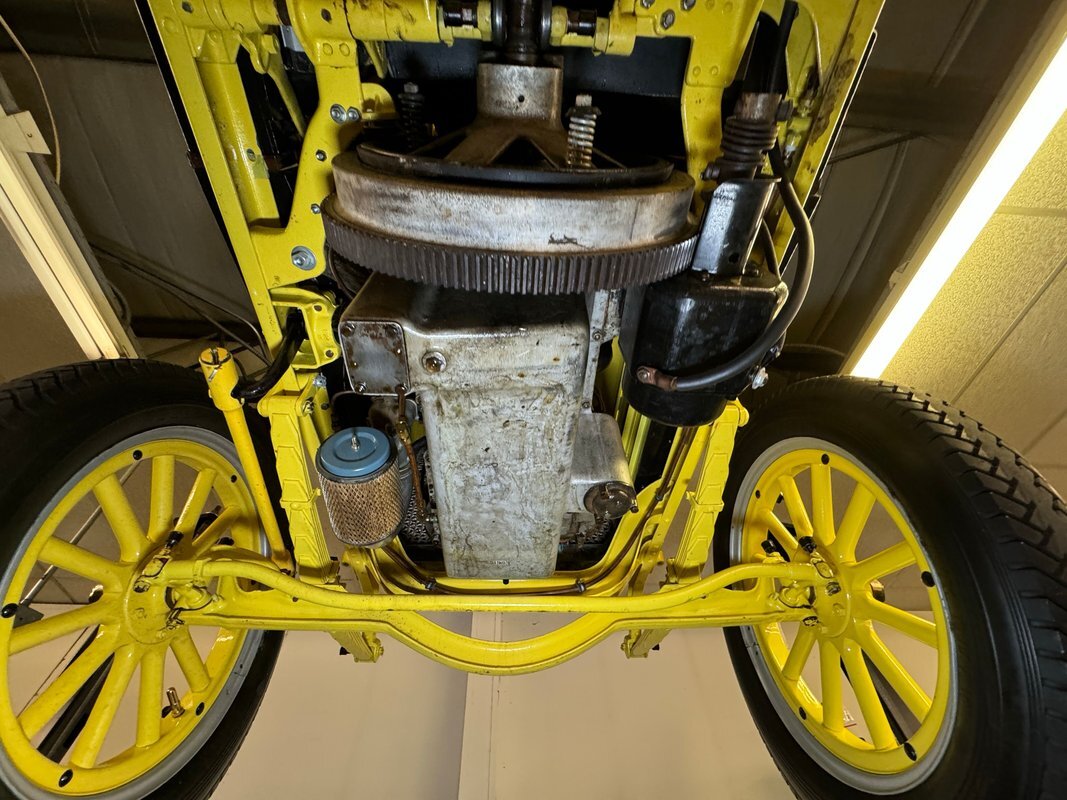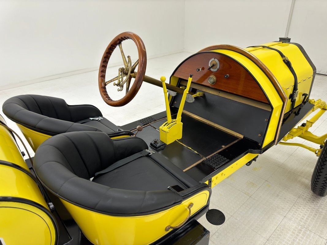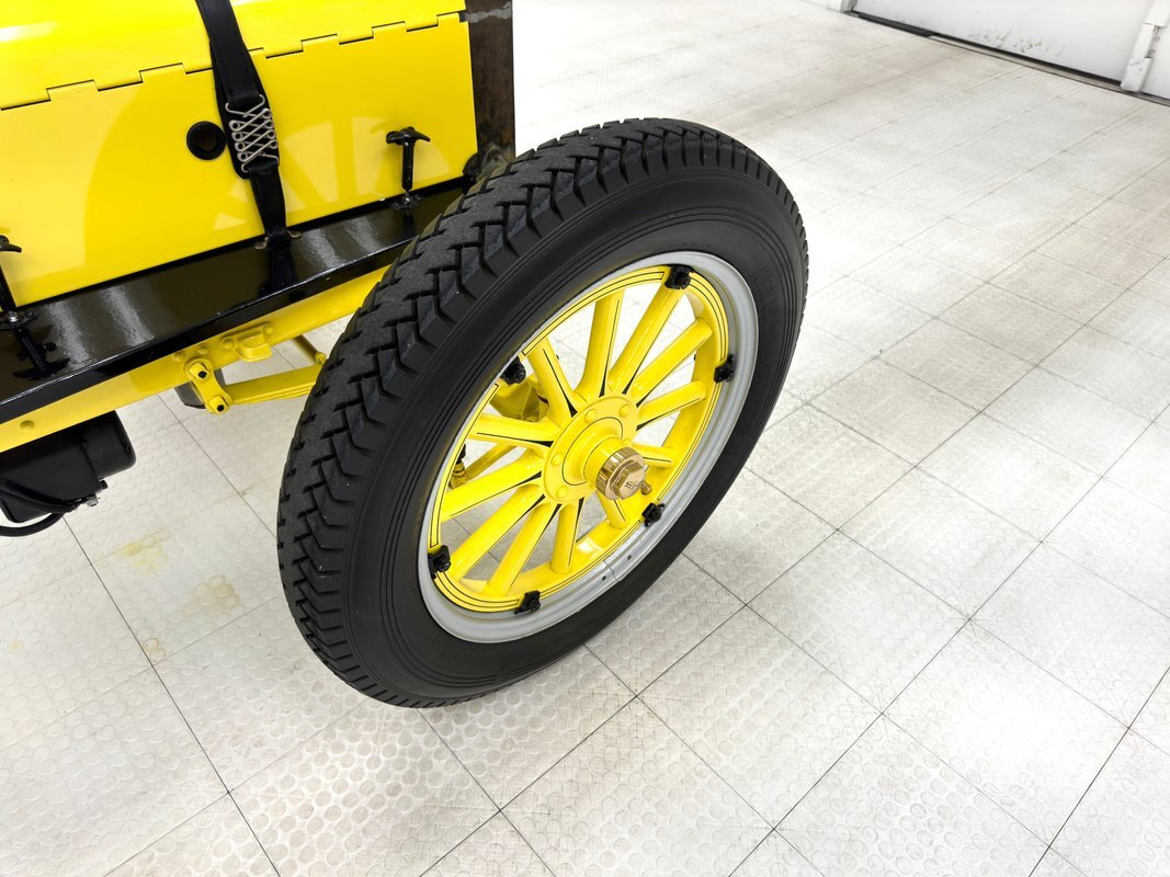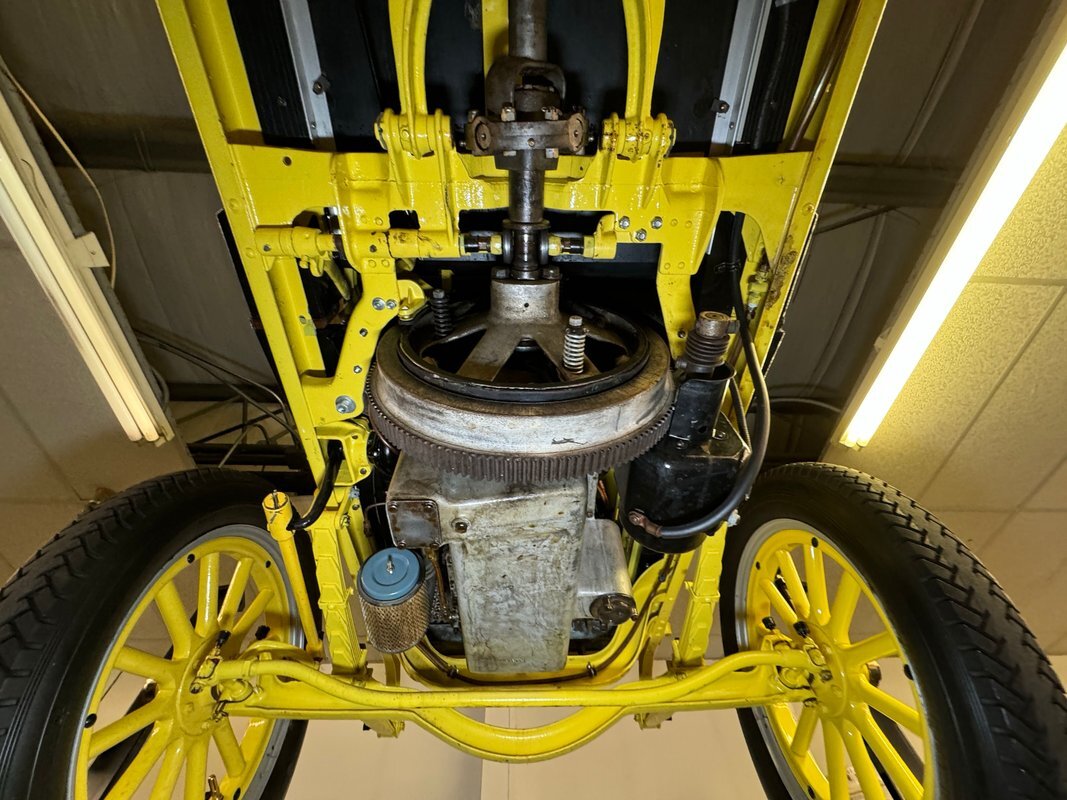 Think of a flat platform and then add wheels below, an engine on top, throw a couple of seats up there along with a gas tank and you essentially have a racer that is light due to its sparsity and purposeful in its construction. Frame, axles, 35-inch wood spoke wheels, engine cover, gas tank, and seat shells are all painted a bright yellow which contrasts well with most other features that are black. Each spoke has decorative black accents and a black number six is on each side of the gas tank and is also seen in the mesh grille up front. A black leather strap holds down the engine cover which rises above black exhaust pipes on one side. Glossy black covers a small wooden trunk in back and a vintage Oilzum decal dresses up the battery box below. The brass radiator shell has tarnished but beyond that, the exterior presentation is just about flawless.