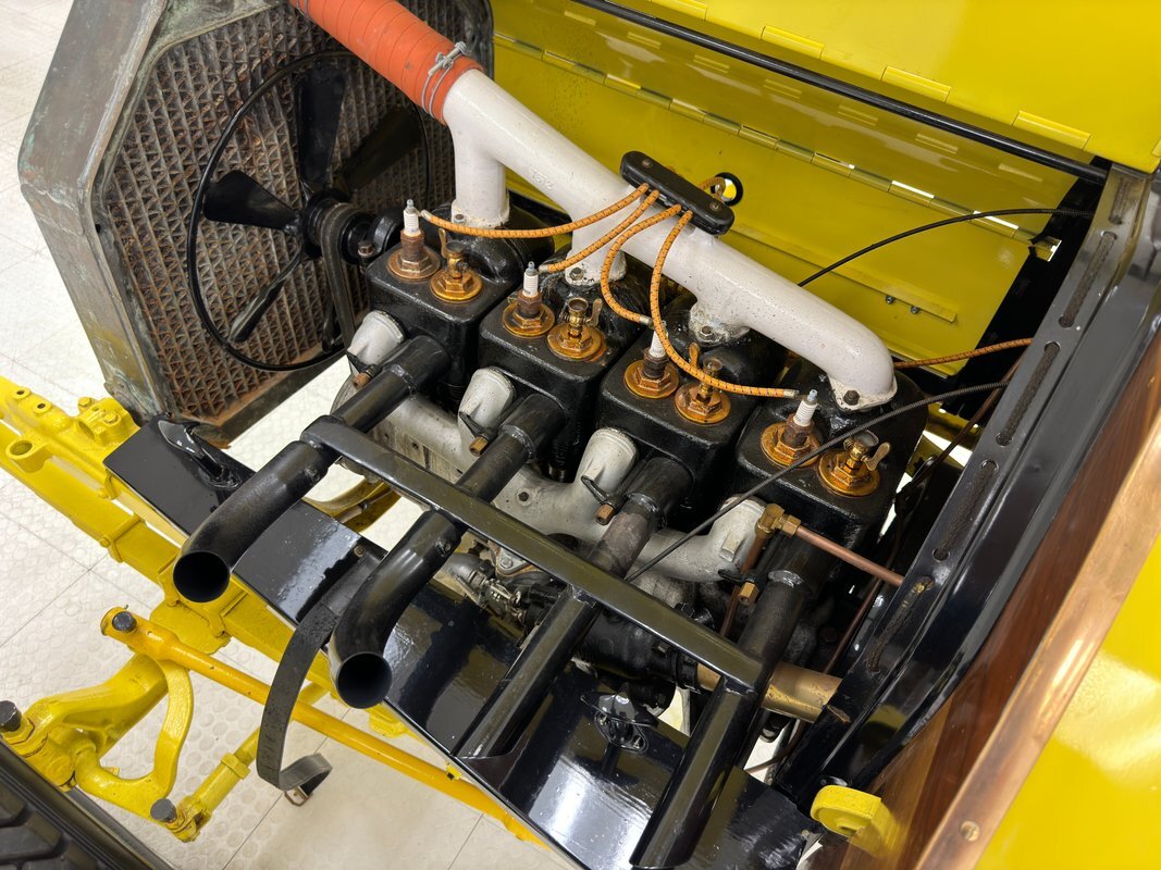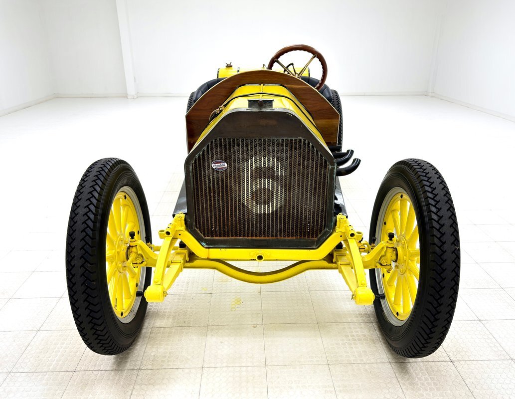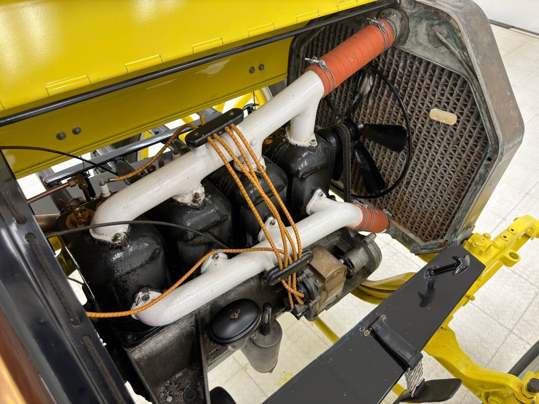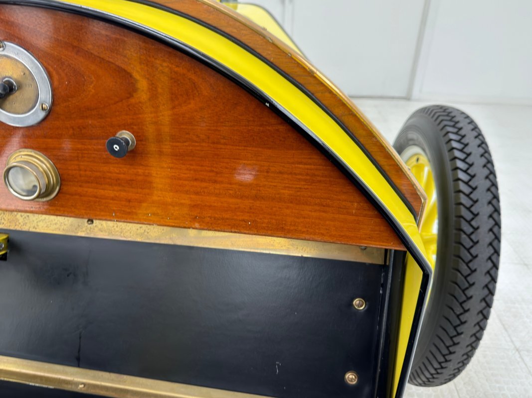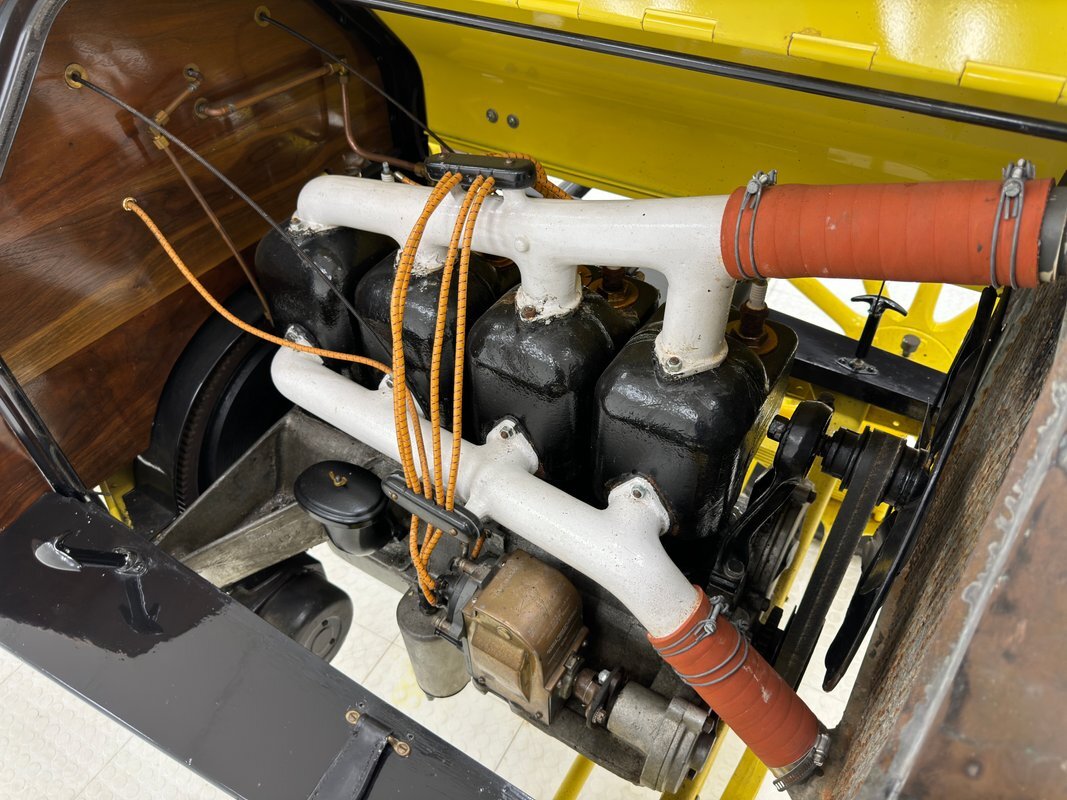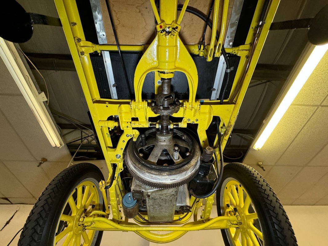 Think of a flat platform and then add wheels below, an engine on top, throw a couple of seats up there along with a gas tank and you essentially have a racer that is light due to its sparsity and purposeful in its construction. Frame, axles, 35-inch wood spoke wheels, engine cover, gas tank, and seat shells are all painted a bright yellow which contrasts well with most other features that are black. Each spoke has decorative black accents and a black number six is on each side of the gas tank and is also seen in the mesh grille up front. A black leather strap holds down the engine cover which rises above black exhaust pipes on one side. Glossy black covers a small wooden trunk in back and a vintage Oilzum decal dresses up the battery box below. The brass radiator shell has tarnished but beyond that, the exterior presentation is just about flawless.