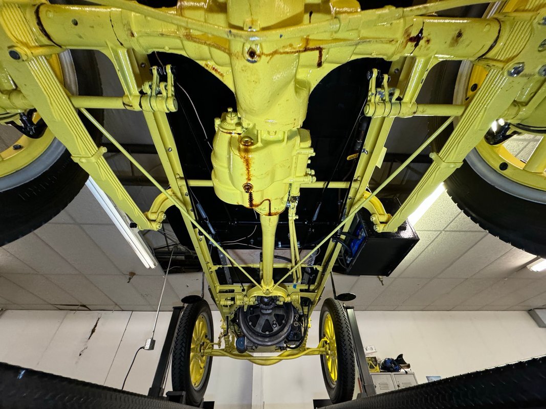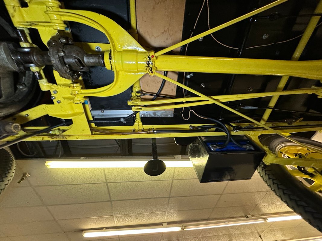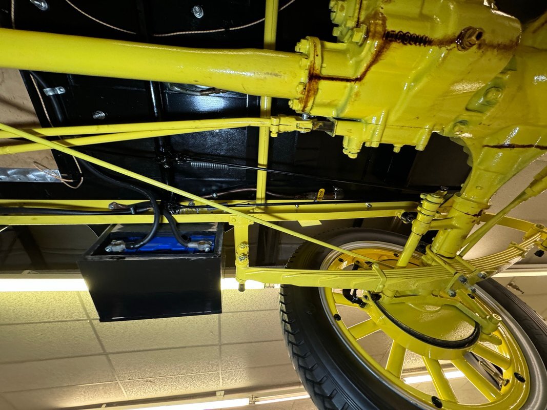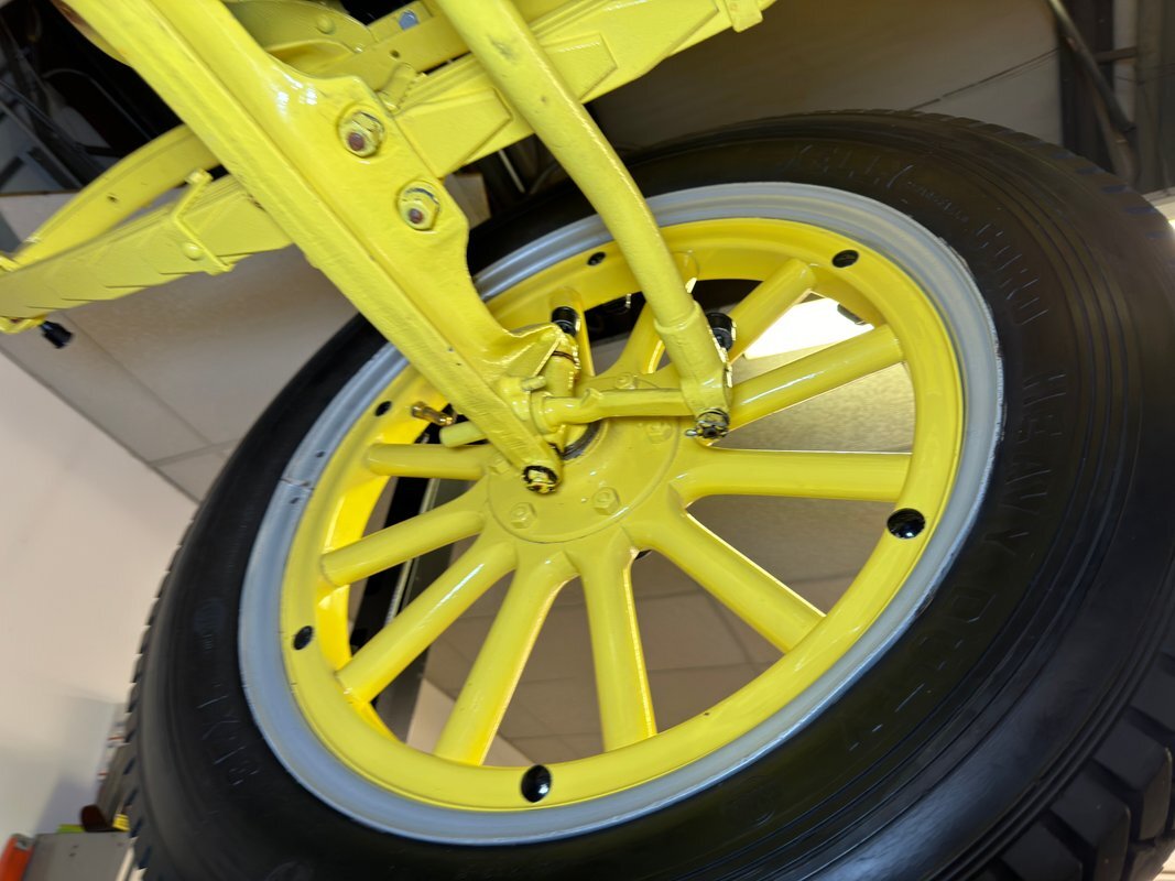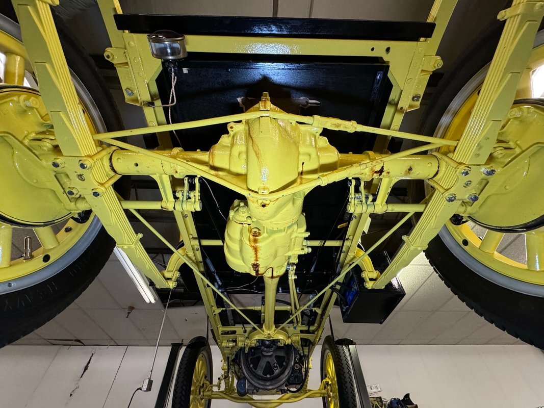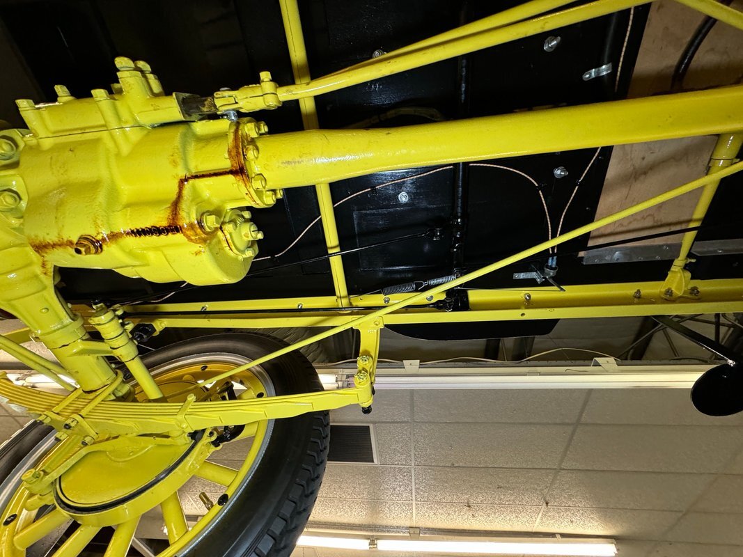 Everything is yellow underneath and that includes the leaf springs on the front and back. The yellow also shows oil more than black would and we note some leaking at the rear differential, the transmission and a few drops on the unpainted oil pan. The exhaust, as noted, comes right off the engine, one pipe for each cylinder. Other than the oil drips, the underside is clean and simple.