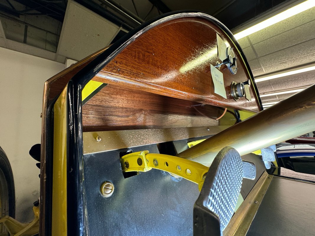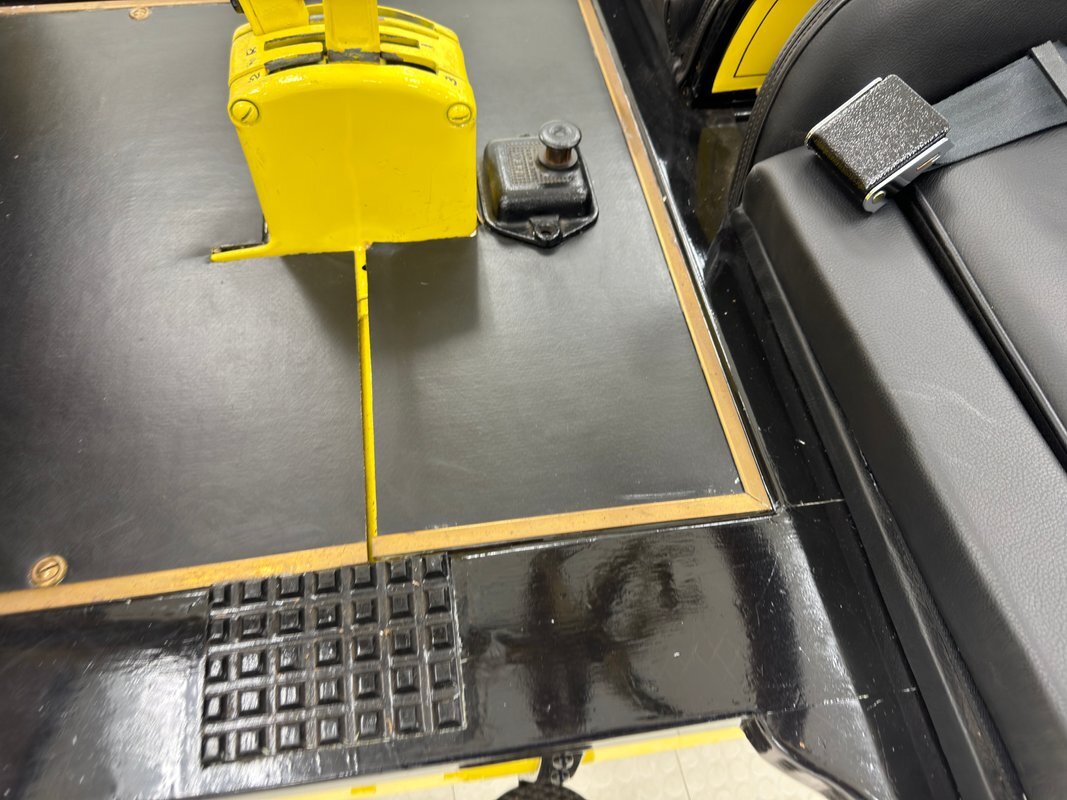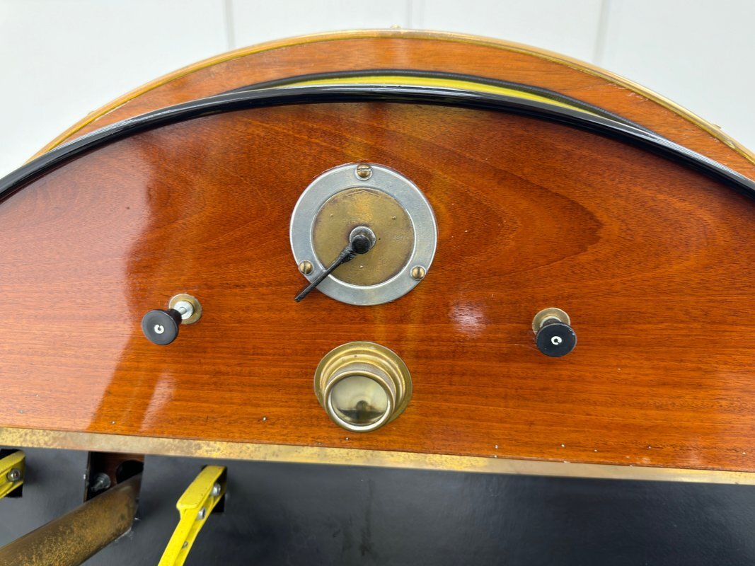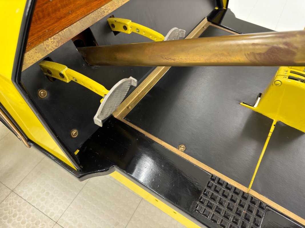A pair of leather barrel style bucket seats occupy the platform for the driver and navigator, or passenger. Ahead of the driver is a robust wood steering wheel with brass controls and spokes in the center and posted on a brass column. The dash is polished wood with a few knobs and levers, while on the floor rises yellow gear controls and a brake. Steel pedals enter the firewall via yellow hardware and the floor is covered with a black rubberized mat to fit. Textured step ups occupy the glossy black sill on your way in and out of the car. Or should we say, off and on the car?