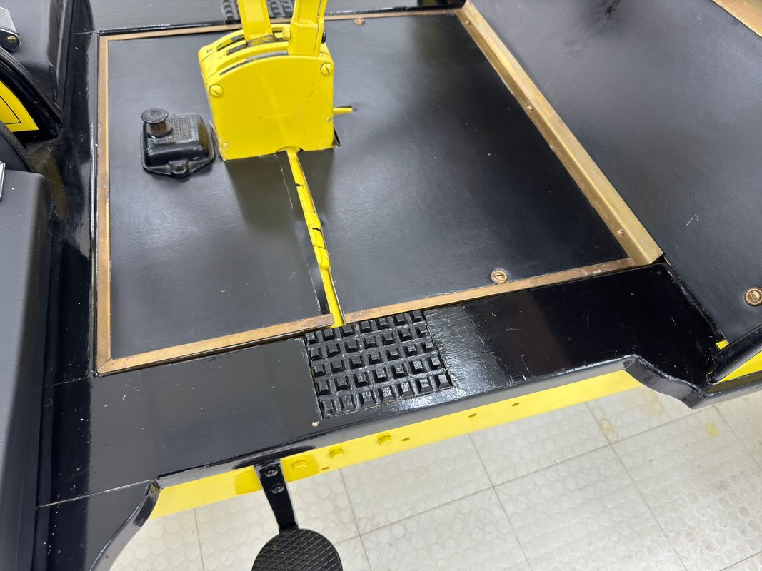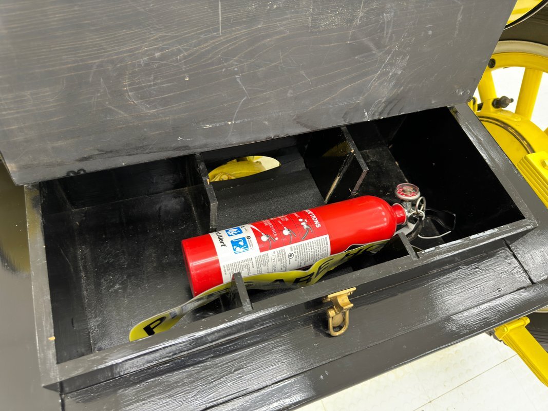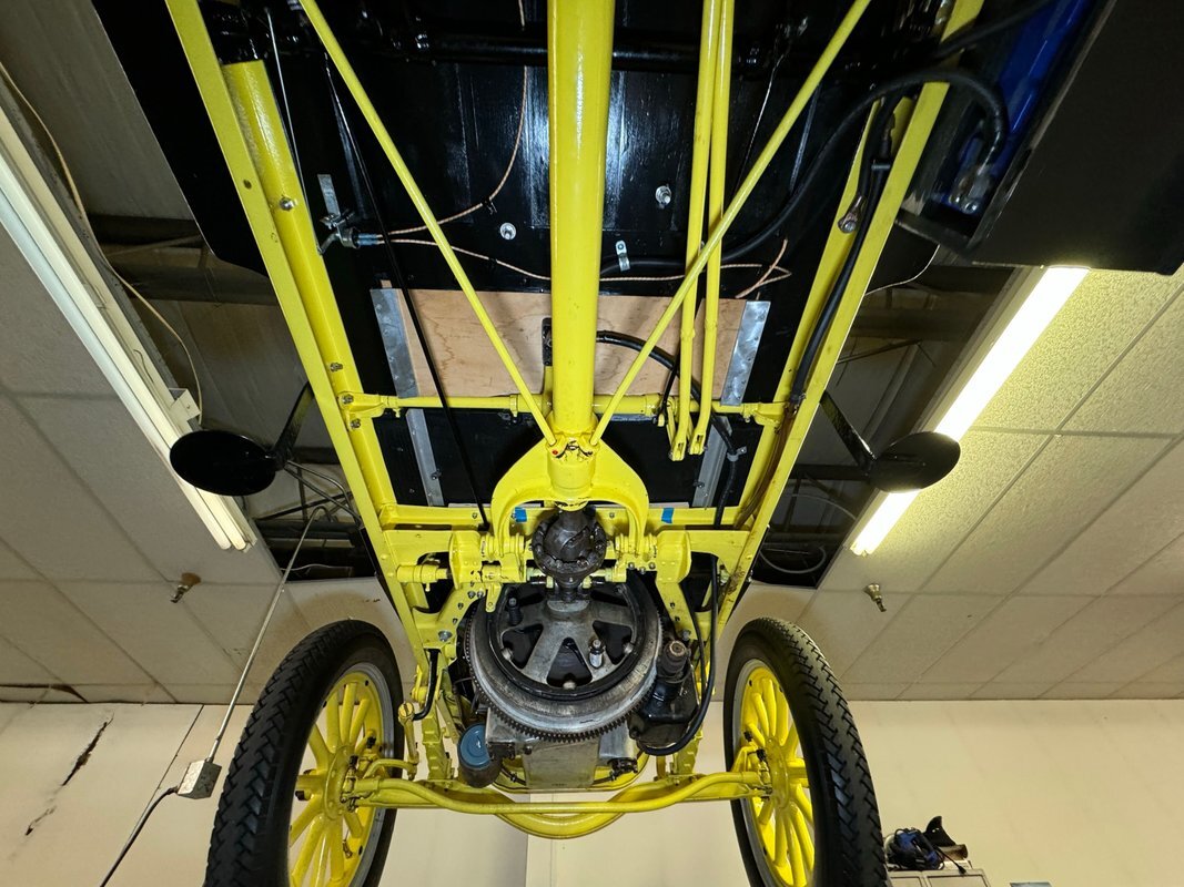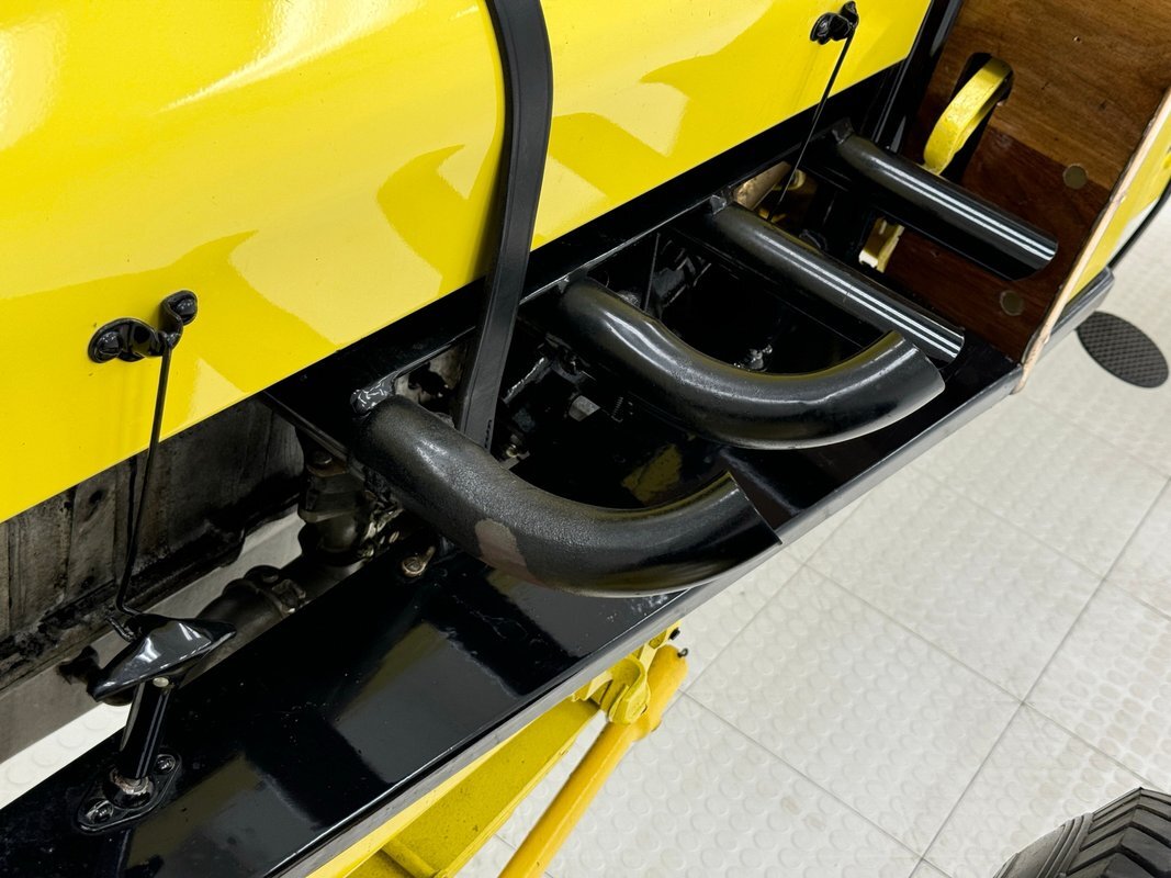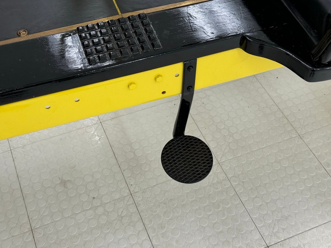 A pair of leather barrel style bucket seats occupy the platform for the driver and navigator, or passenger. Ahead of the driver is a robust wood steering wheel with brass controls and spokes in the center and posted on a brass column. The dash is polished wood with a few knobs and levers, while on the floor rises yellow gear controls and a brake. Steel pedals enter the firewall via yellow hardware and the floor is covered with a black rubberized mat to fit. Textured step ups occupy the glossy black sill on your way in and out of the car. Or should we say, off and on the car?
