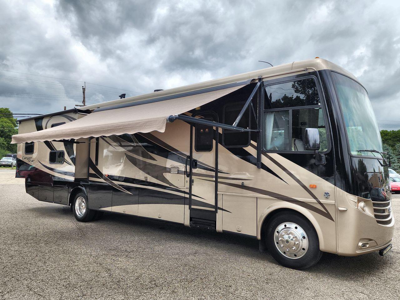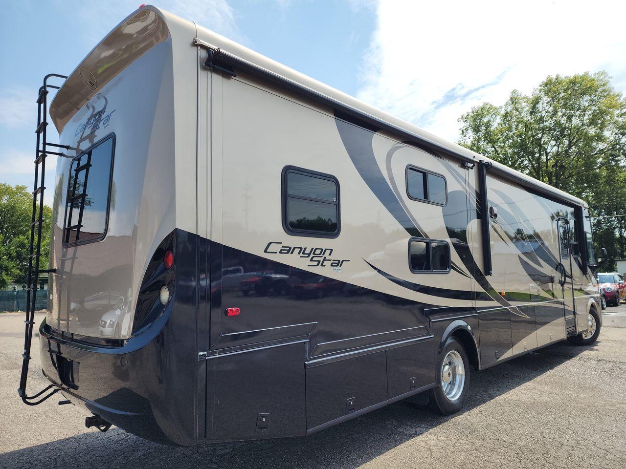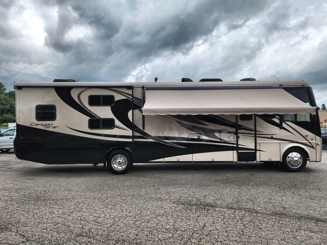 Canyon Star 3810 38' Triple Slide Class A RV with side bunkhouse floor plan and rear queen bedroom. Sleeps 8 with seat belted seating for 9. Absolutely like new condition RV inside and out. No signs of pets or smoking, no signs of water damage, amazing condition paint looks to have been stored in covered storage. Loaded with every possible feature including: Ford V10 engine on full bus chassis with 22.5" aluminum wheels with Michelin commercial bus tires. Onan 550 quiet GenSet. Fully automatic leveling system just serviced. Power cloth awning with aluminum cover works great and looks like new. Washer and dryer. Full size home 3 door fridge with inverter. In Motion satellite system. 3 built in Sony flat screen TVs with full built in theater system and input switching system. Dual roof top AC units with single system control. Real solid wood cabinet doors. Corian countertops. Rear and side view camera system. Full body paint in amazing condition. Rear ladder. Towing package with electric brake controller. Full sofa bed system plus dinette drops to bed, plus rear side bunkhouse plus rear walkaround queen bed. Private enclosed bathroom with stand up shower enclosure. Full basement pass thru lighted storage system. Slide out awnings. Immaculately clean unit you must see to appreciate. Looks like it could be just a few months old, super low mileage, all the right options. Fully serviced and inspected, everything works, ready to go cross country TODAY!