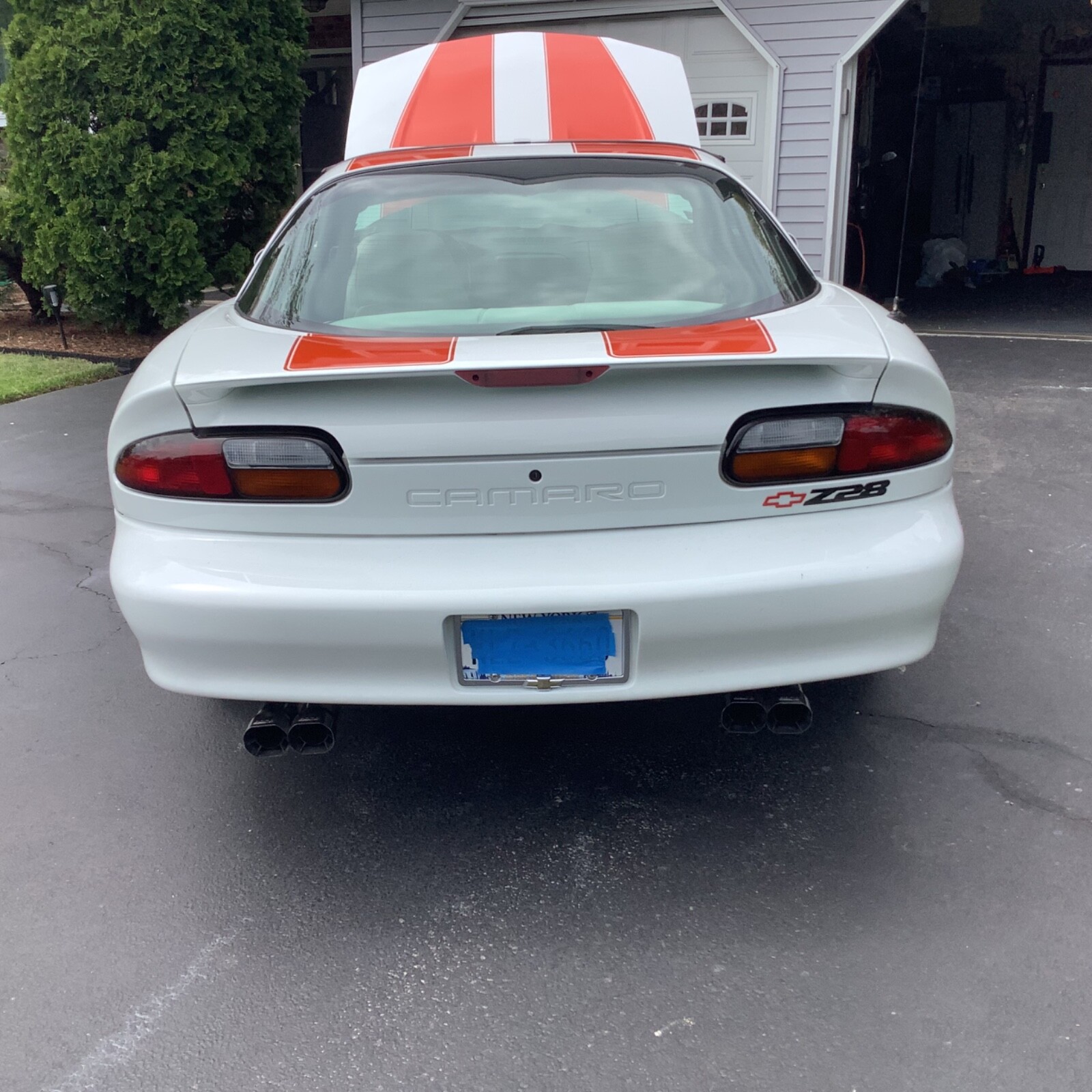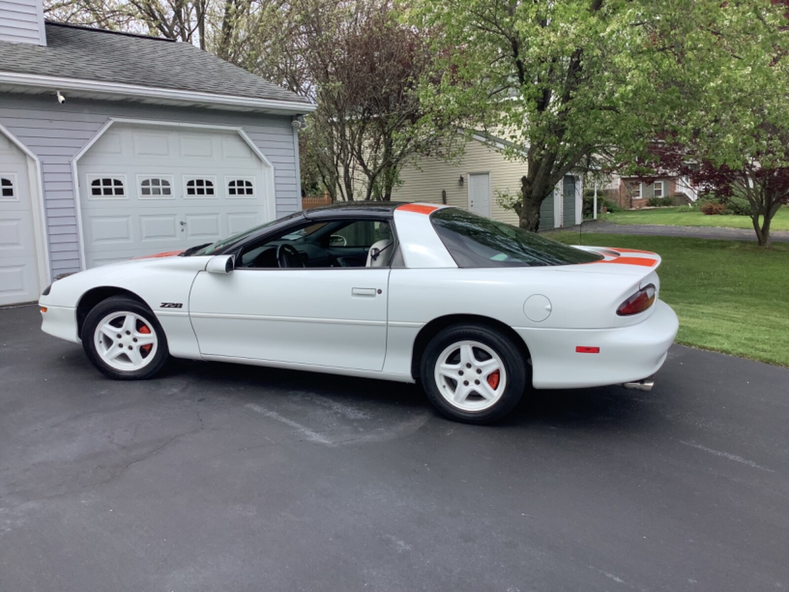1997 Chevy Camaro Z28, 30th Anniversary Edition. 5.7 LT1 engine, 36,650 miles. 6 Speed manual transmission ,White with Orange Stripes, White leather interior, T-tops. AM-FM Cassette player with Delco factory installed 12 CD player. #’ Borla stainless steel exhaust, Wheels powder coated, no accidents, and always garaged. No winters