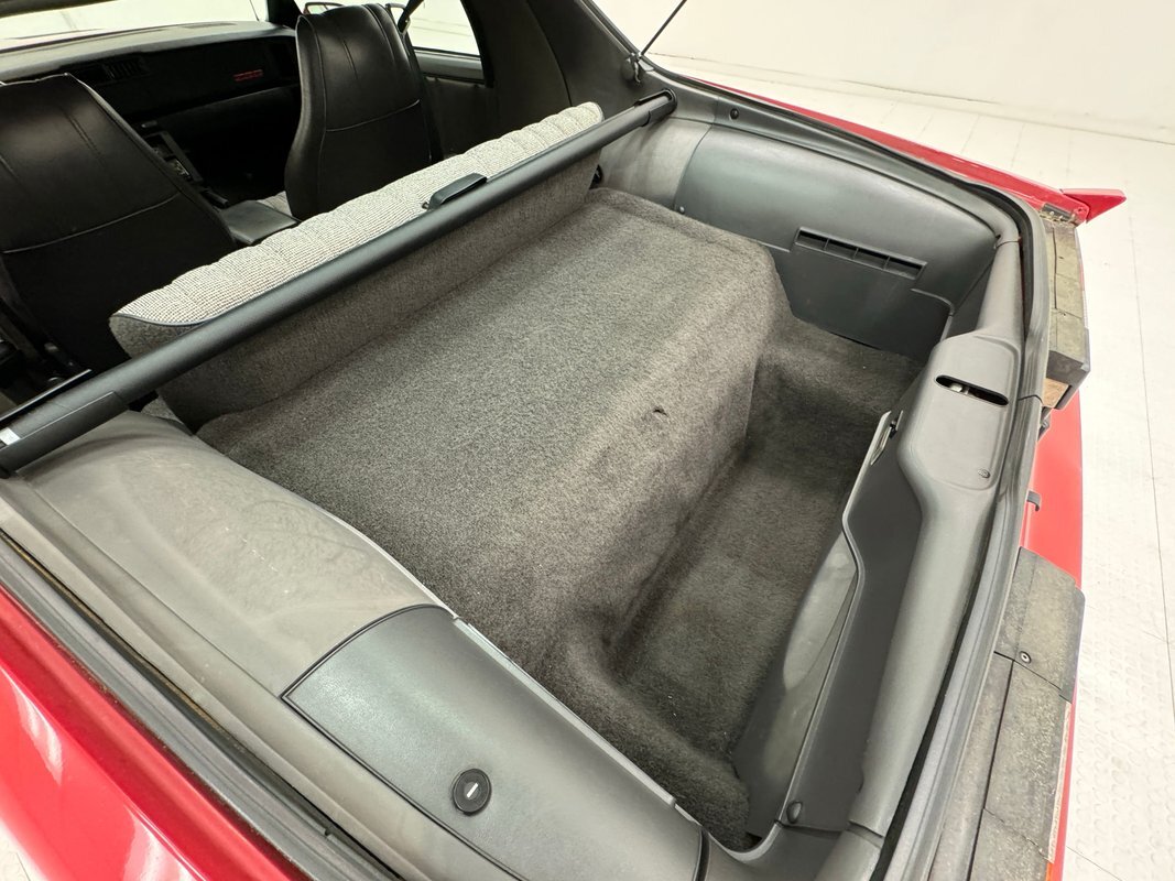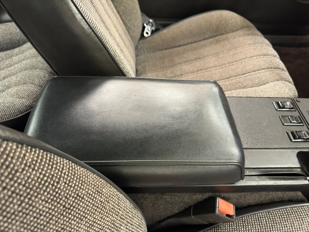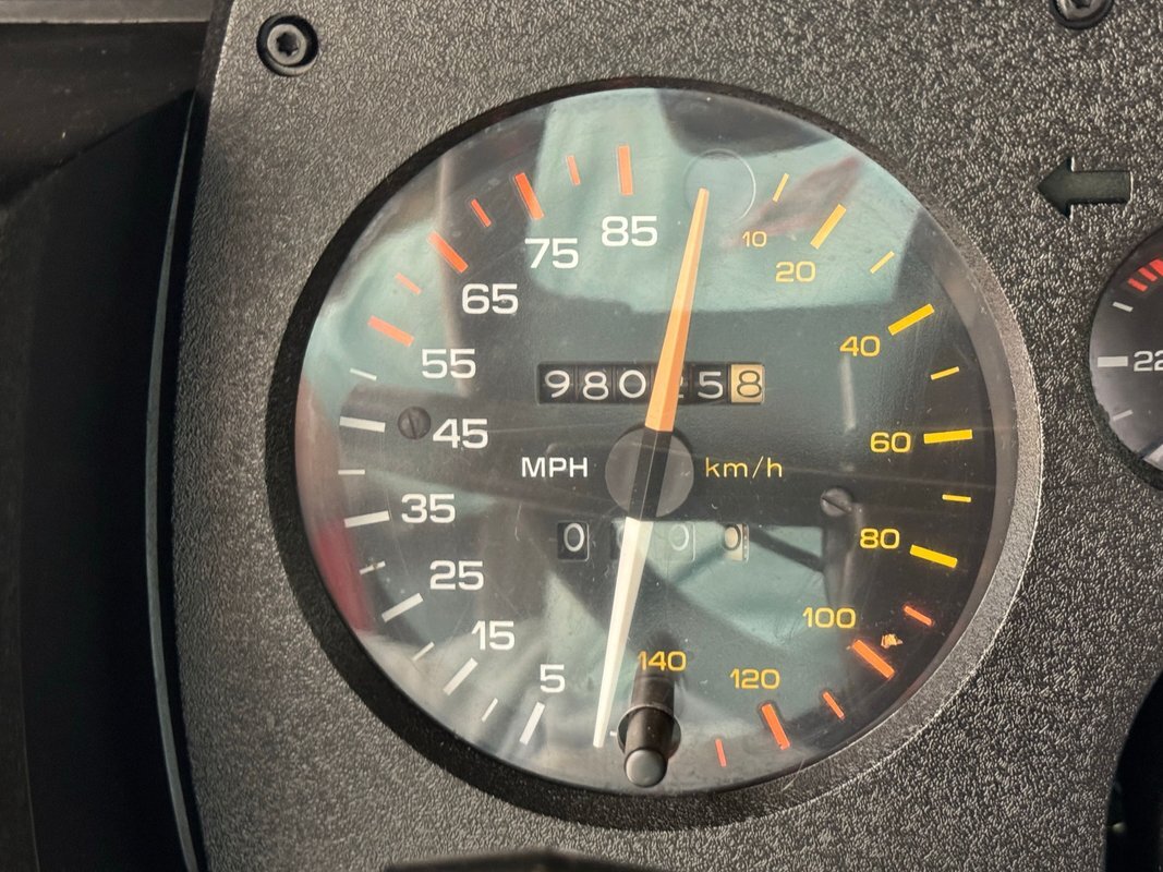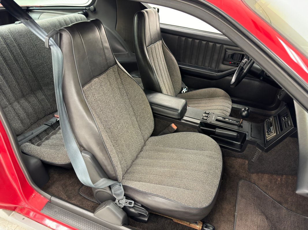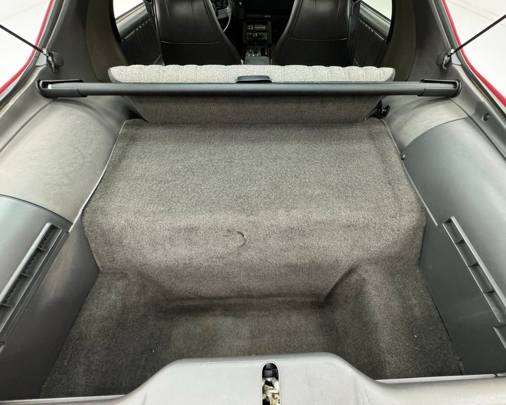 The black vinyl door panels, with their vertically patterned insert, are in great shape and so are the bucket seats up front, made of gray cloth with black vinyl surrounding. This pattern continues on the rear 2+2 seat configuration with one piece back over split seats, all in fantastic shape. The leather wrapped steering wheel is not as taut as it once was but is intact and fronts a simple dash, framed in black plastic and housing the basic gauges for the driver. The lever controlled A/C switchgear is in the center above an aftermarket Kenwood AM/FM/Cassette radio. Belying the mileage on the car, the center console is in remarkably good condition as the stout shifter rises from the plastic base, all surrounded by low pile charcoal carpet in decent shape, and it also covers the rear cargo area. Up above, the foam formed gray headliner looks good.