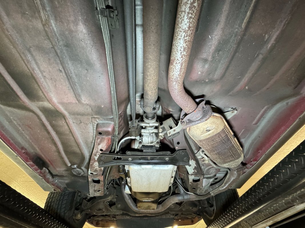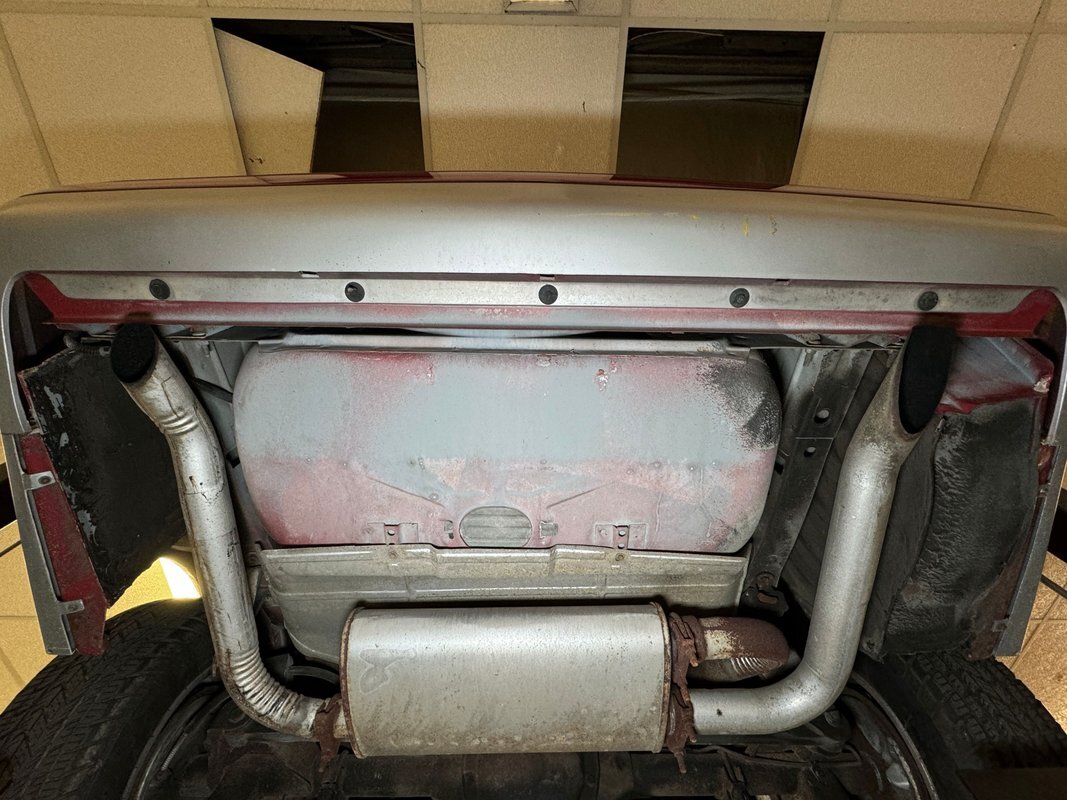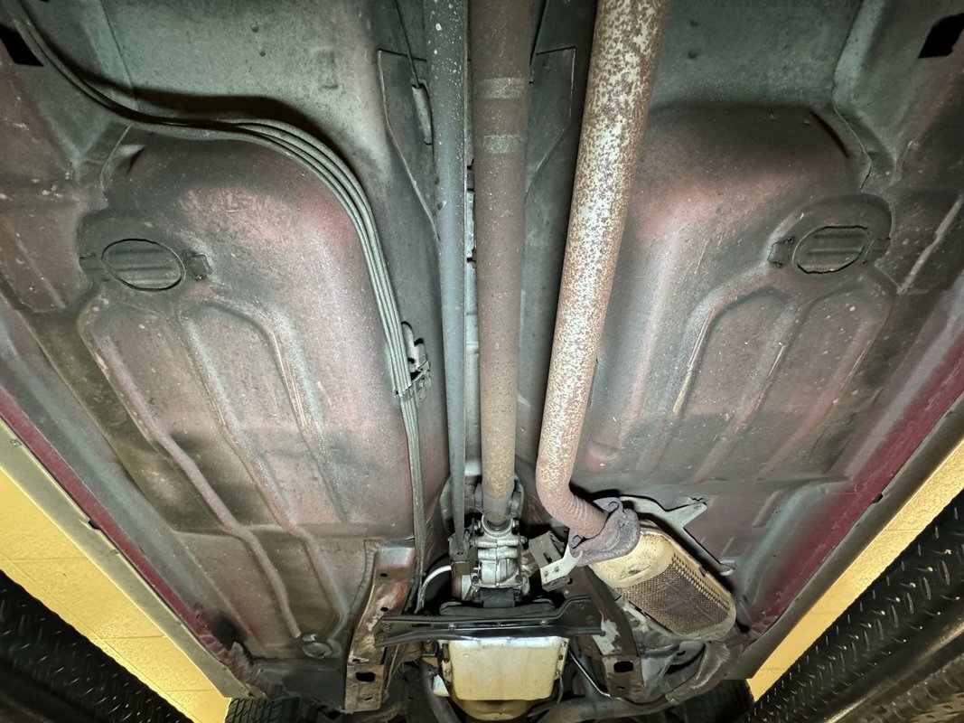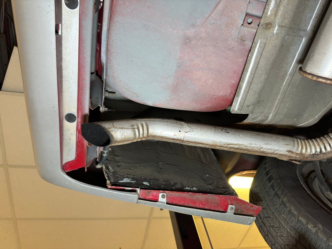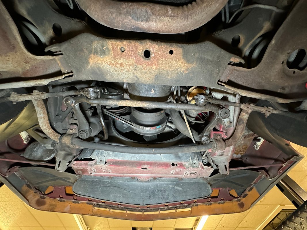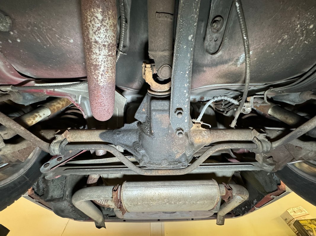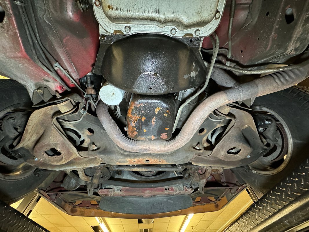 Driver quality means that surface rust exists underneath, some pitted bordering on invasive, some evidence of residual oil, a drop of oil on the flywheel cover, and a bit of deeper rust on a small body brace. A single exhaust flows into a stock style muffler in the back which splits the exhaust to each side, in this case with slightly asymmetrical tail pipes. Coil springs are up front and a torque arm with coil springs is out back.