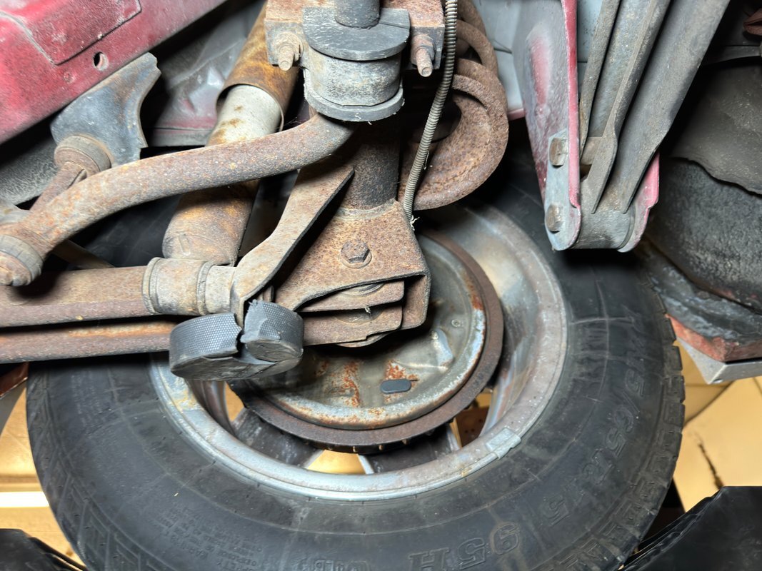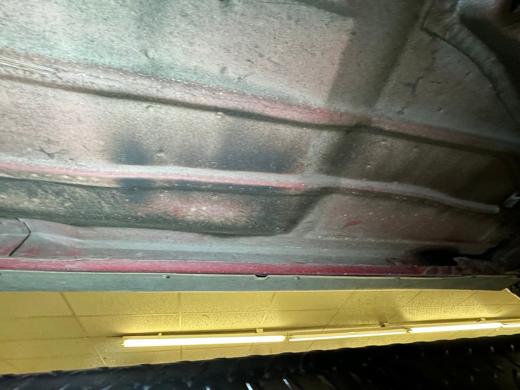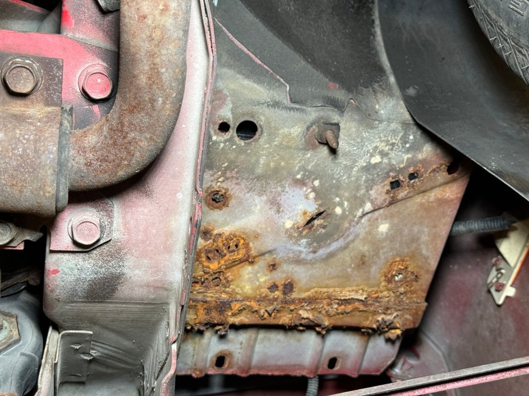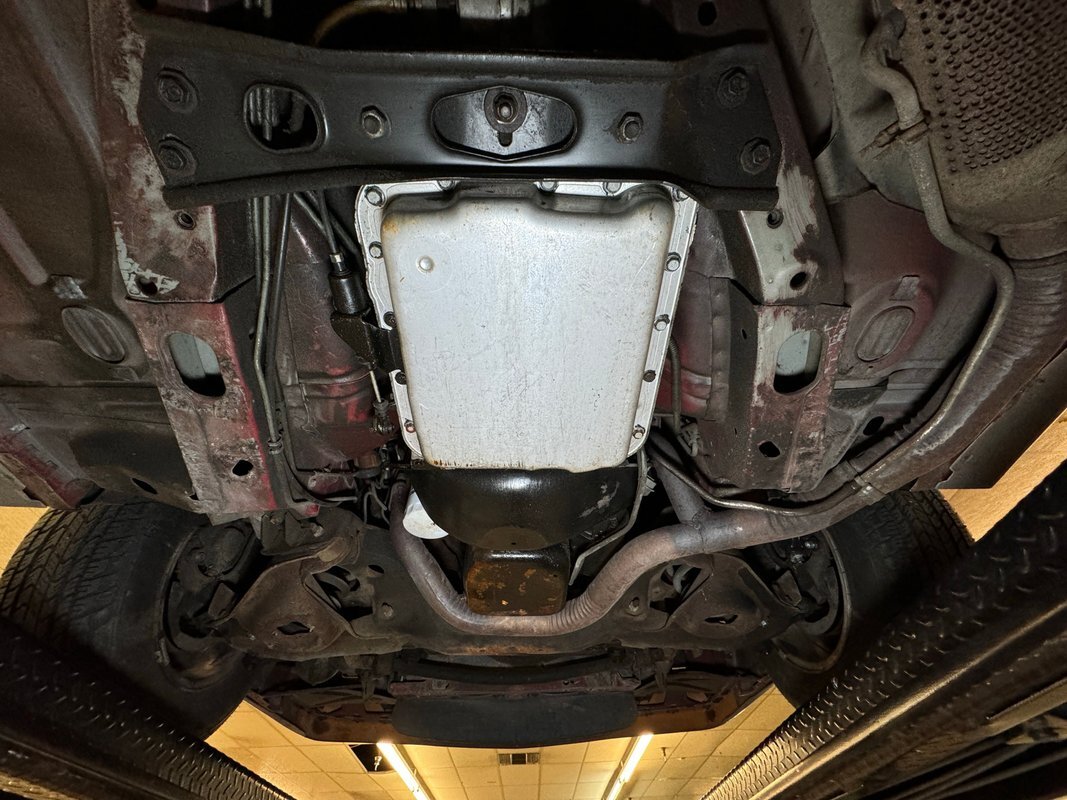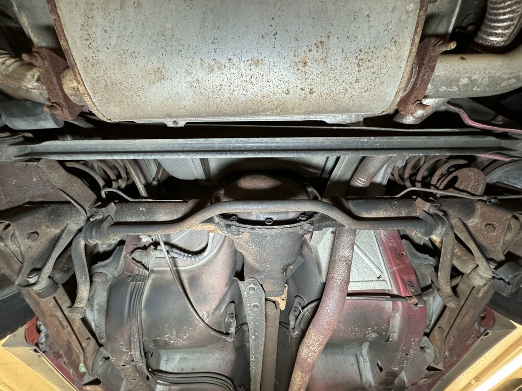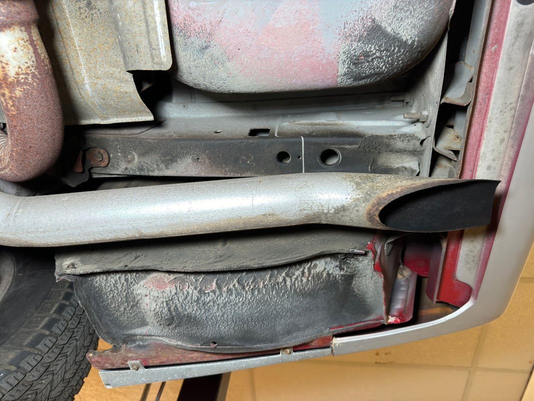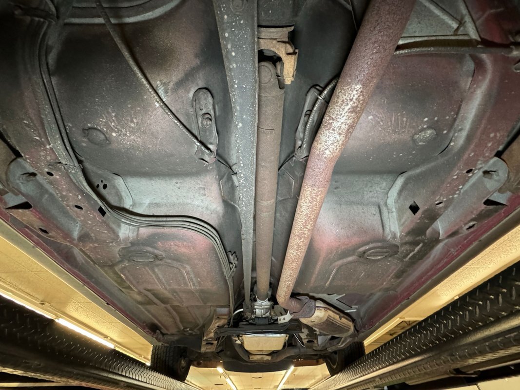 Driver quality means that surface rust exists underneath, some pitted bordering on invasive, some evidence of residual oil, a drop of oil on the flywheel cover, and a bit of deeper rust on a small body brace. A single exhaust flows into a stock style muffler in the back which splits the exhaust to each side, in this case with slightly asymmetrical tail pipes. Coil springs are up front and a torque arm with coil springs is out back.