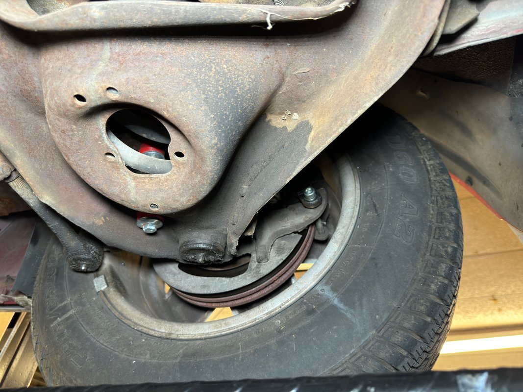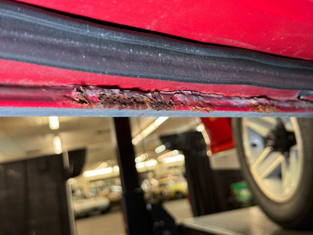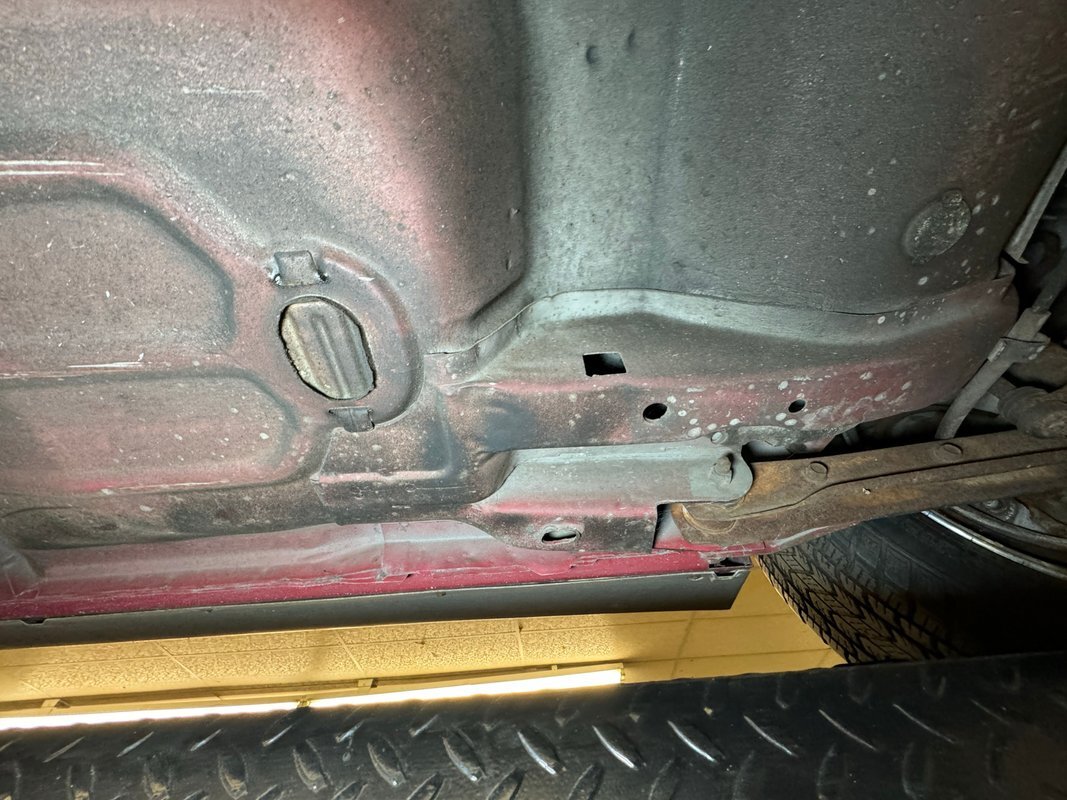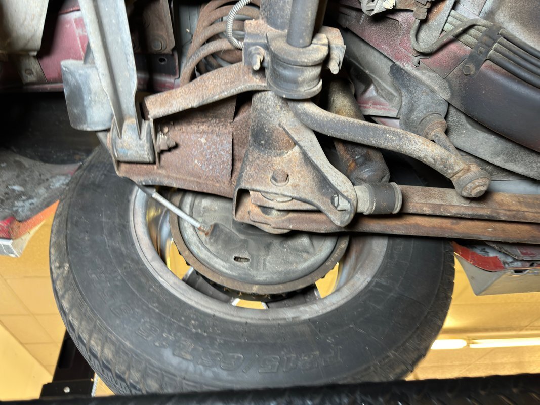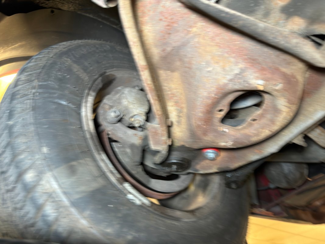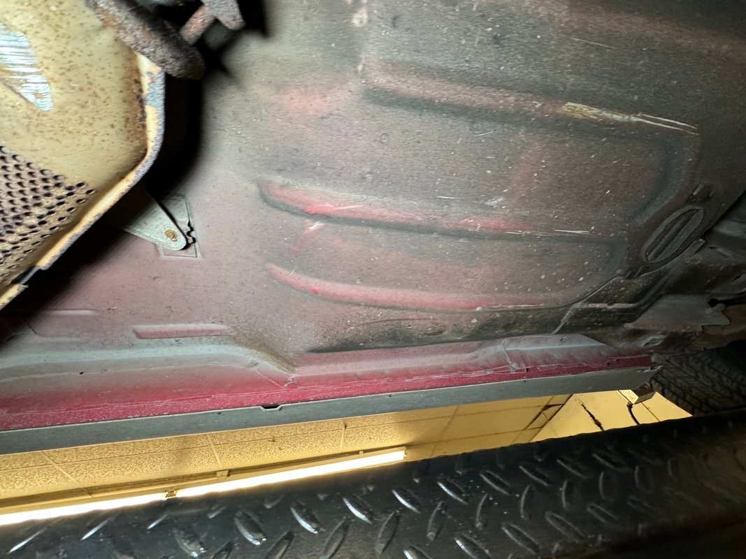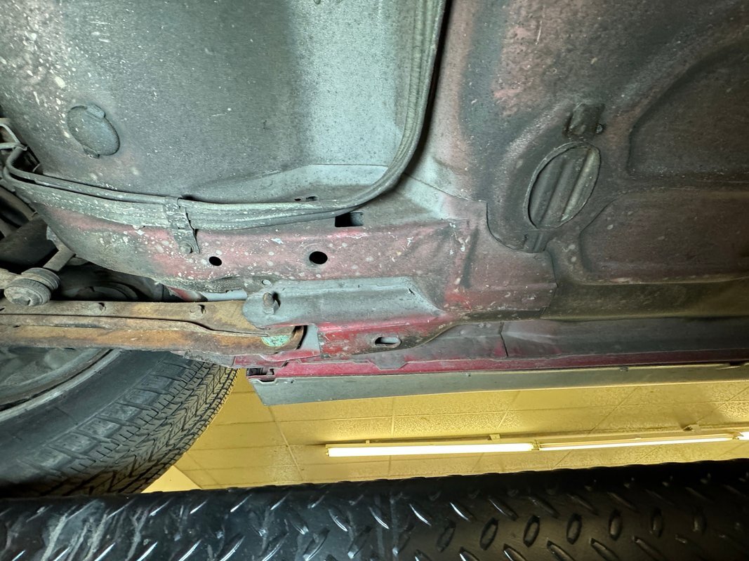 Driver quality means that surface rust exists underneath, some pitted bordering on invasive, some evidence of residual oil, a drop of oil on the flywheel cover, and a bit of deeper rust on a small body brace. A single exhaust flows into a stock style muffler in the back which splits the exhaust to each side, in this case with slightly asymmetrical tail pipes. Coil springs are up front and a torque arm with coil springs is out back.
