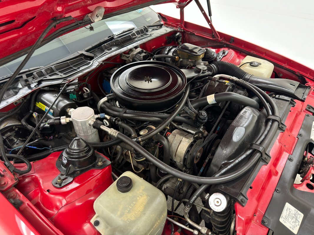 Just beyond the gleaming red paint of the hood's underside is a clean 5.0 liter V8 tied to a 4-barrel carburetor and a 700R4 4-speed automatic transmission that sends power to the 10 bolt axle in the back. Power brakes are a welcome standard and are equipped as disc on front and drum in the rear.