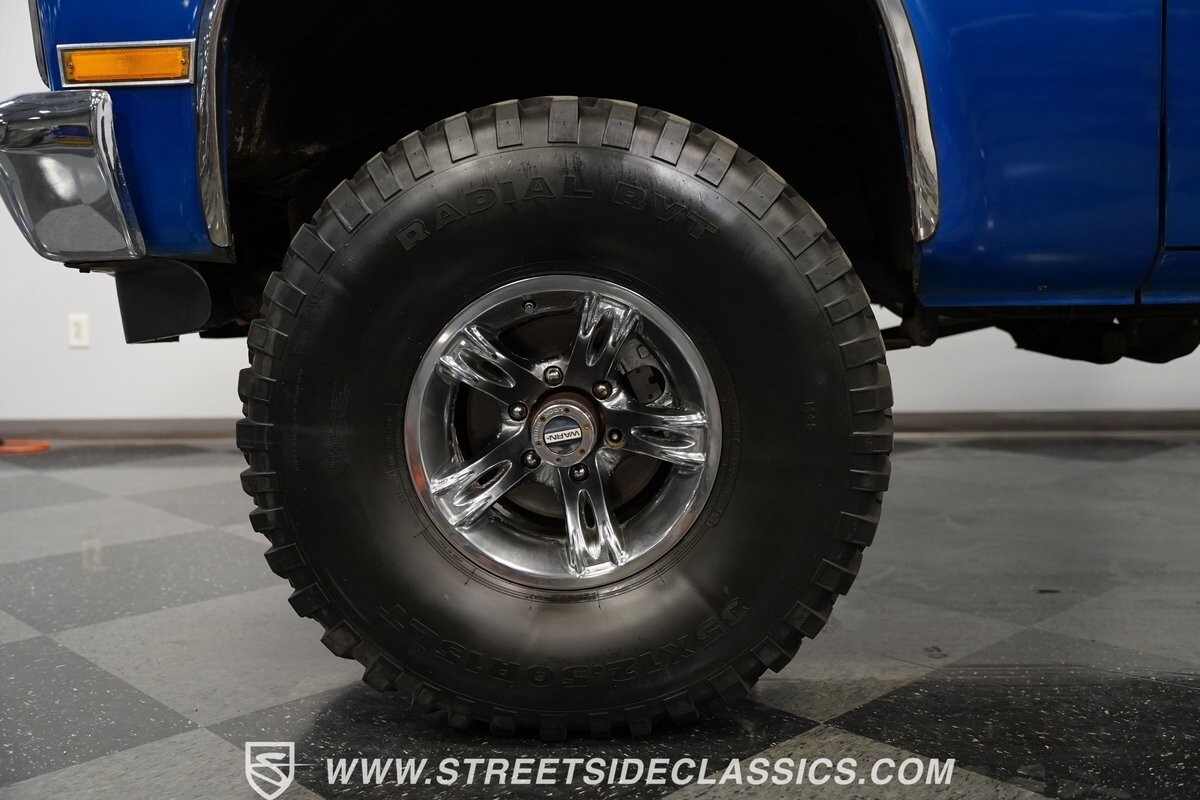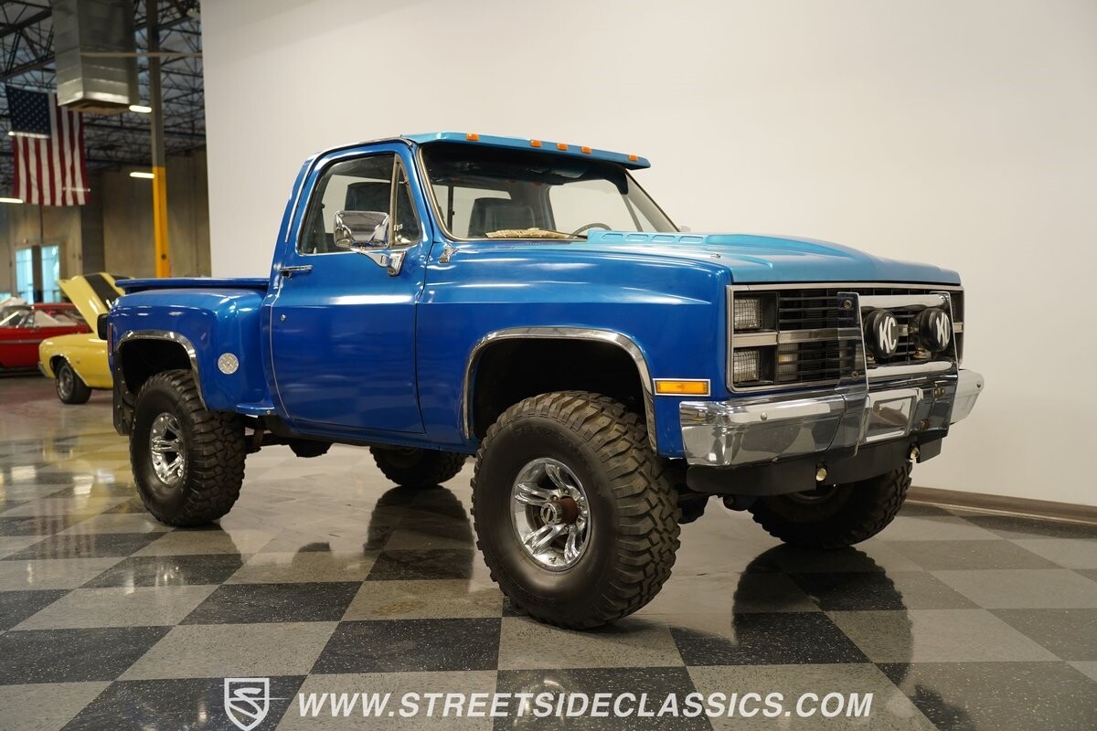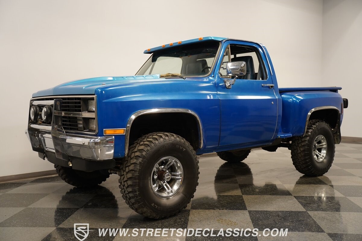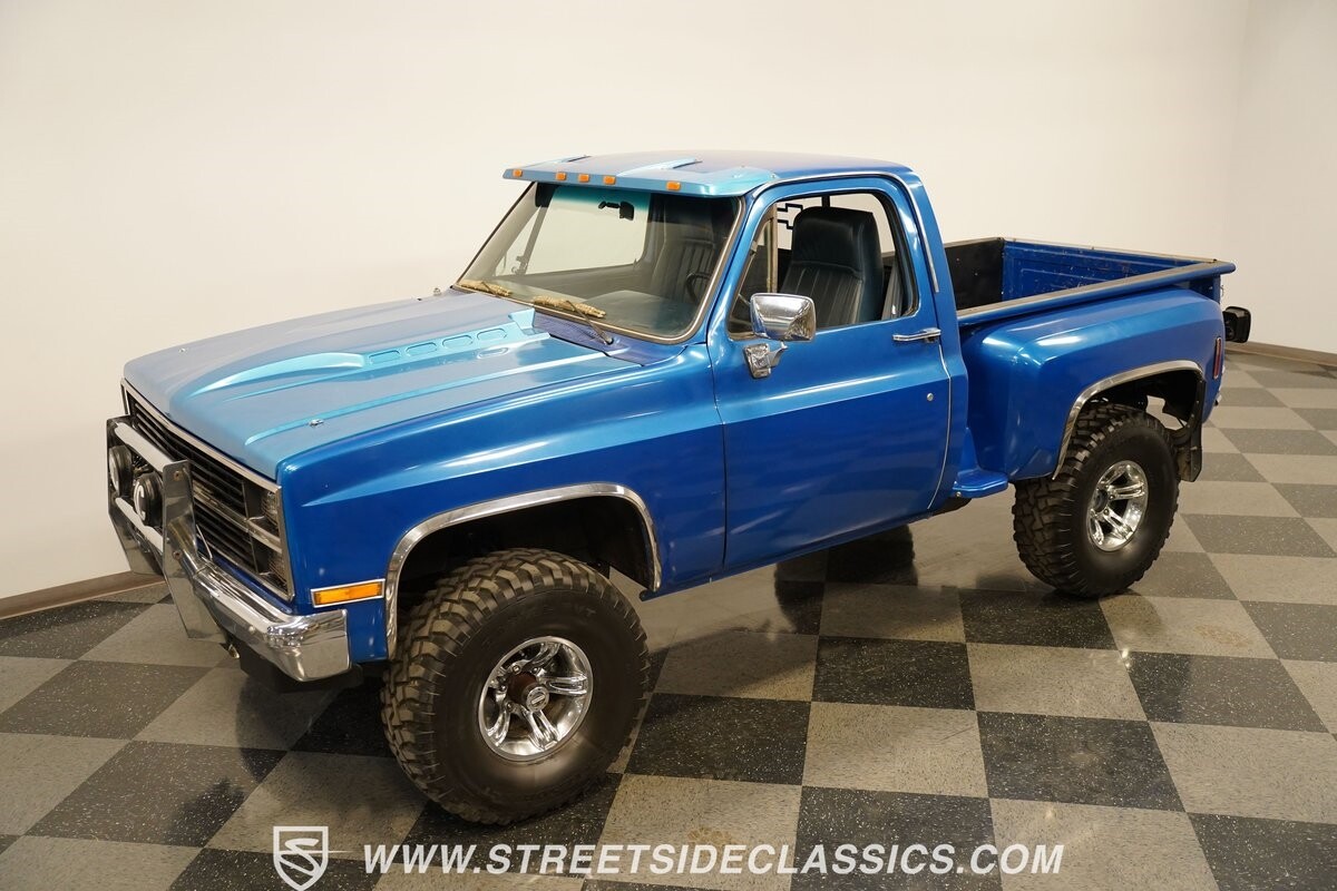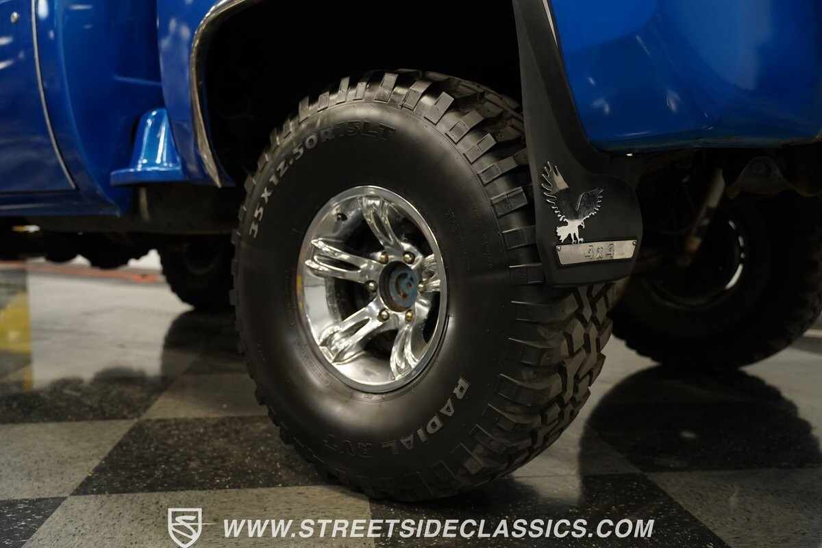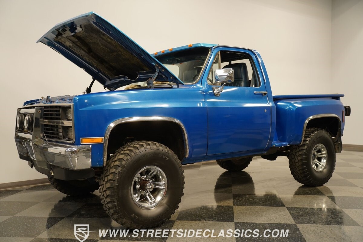 This 1984 Chevrolet K10 Supercharged 4x4 Stepside is a blue metallic beast ready to dominate both street and trail. Sporting a 4-inch lift, this Chevy towers over traffic on massive 35/12.5R15 Wild Country radial RVT tires wrapped around 15-inch chrome aftermarket alloys. The aggressive stance is complemented by a custom cowl hood inspired by early C2 Corvette big block designs, setting this K10 apart from the pack. A push bar with KC lights guards the front, while a louvered tailgate with an eagle emblem adds a custom touch to the rear. The stepside bed features a traditional wood floor, a nod to classic truck craftsmanship.